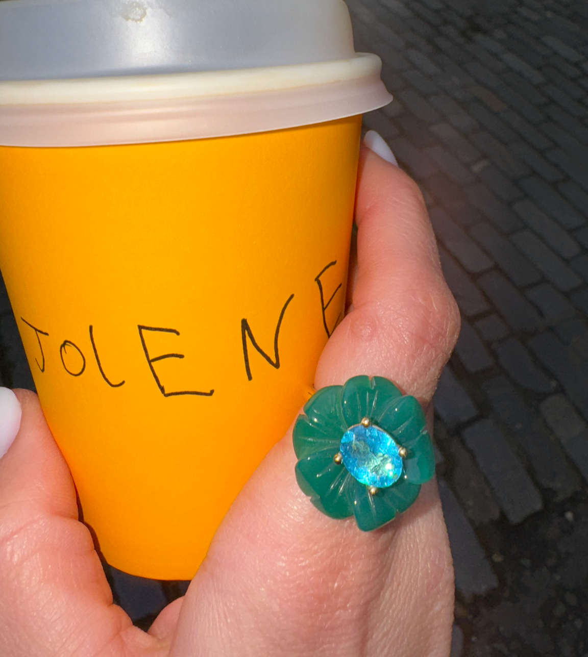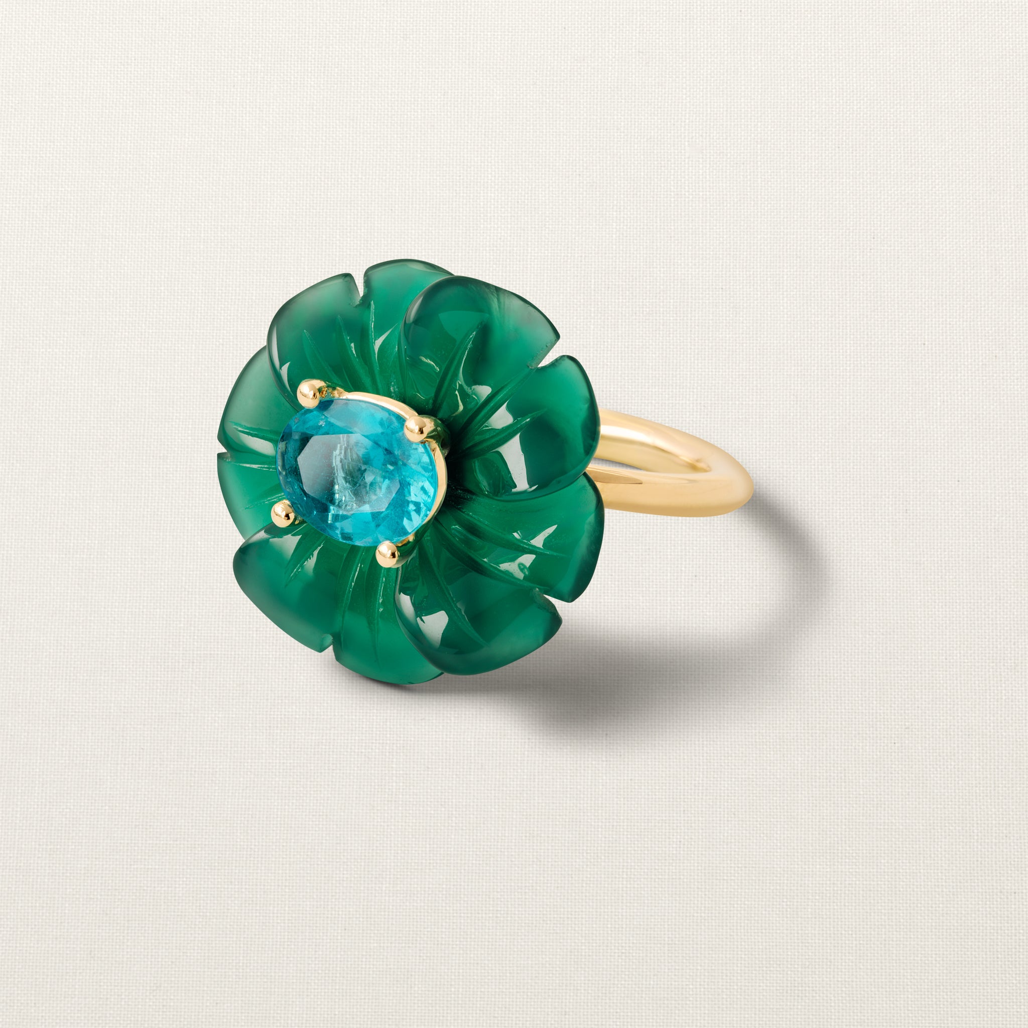 The Coast Flower ring is hand-carved in Italy from high-quality coastal green apatite and set with a brilliant-cut aqua apatite. Wearing apatite will enhance focus, clarity for concentration, intellect, acceptance, and unconditional love.