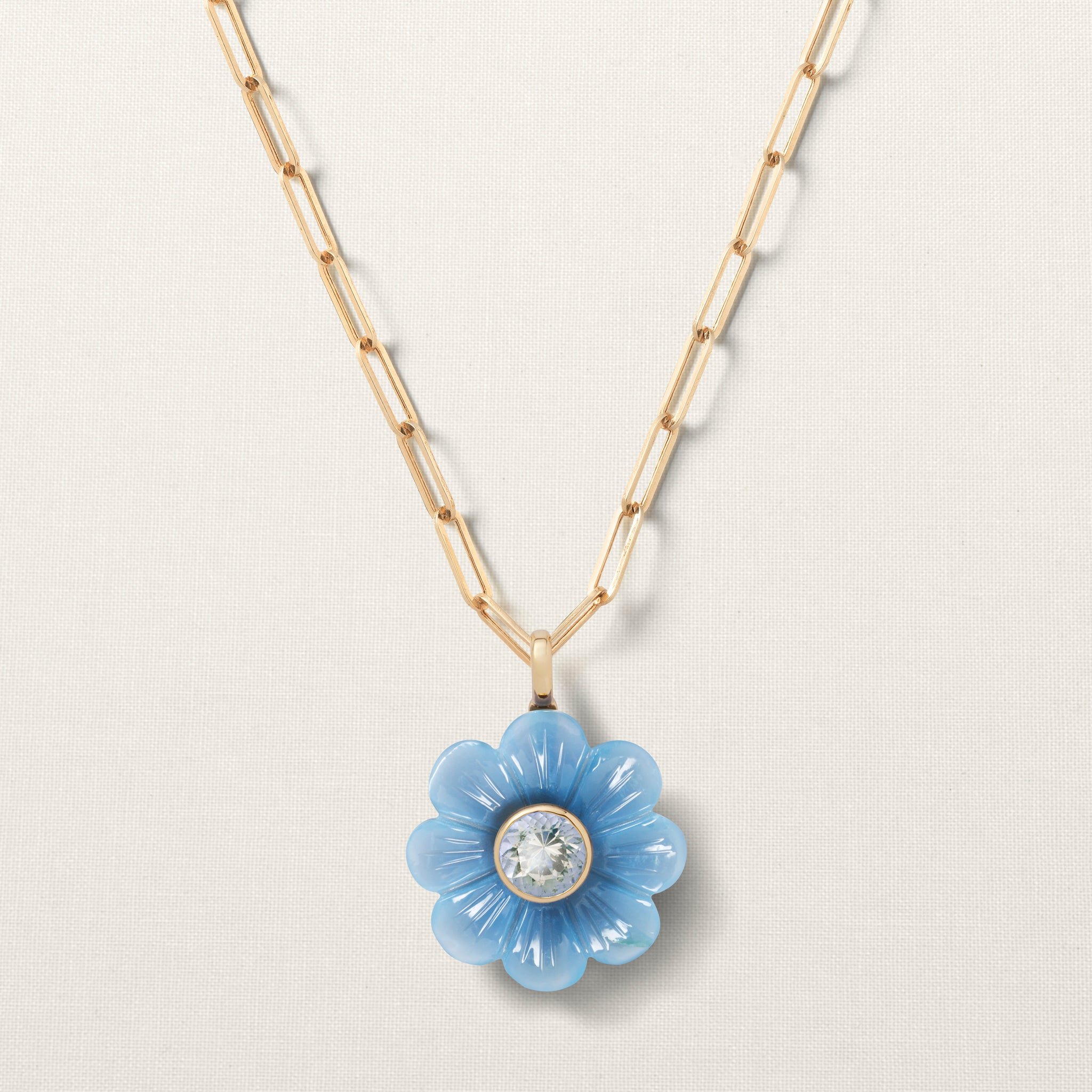 The Flower pendant is set with a brilliant-cut aquamarine. Aquamarine helps move towards closure, allowing space for peace and tranquillity.