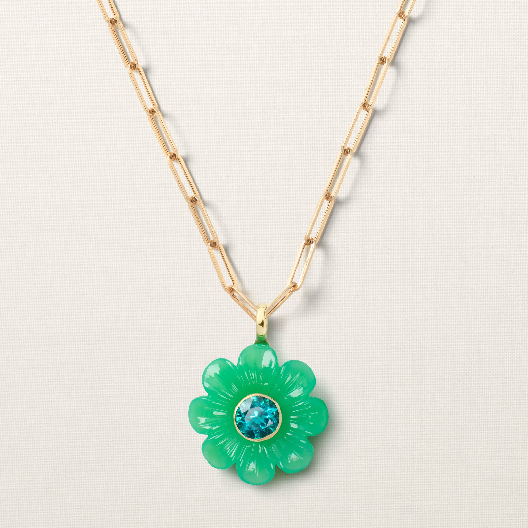 The flower on this iconic Sophie Joanne pendant is hand-carved from white by an expert artisan, using an age-old, stone-carving technique. Chrysoprase traditionally symbolizes happiness, enterprise, and prudence.