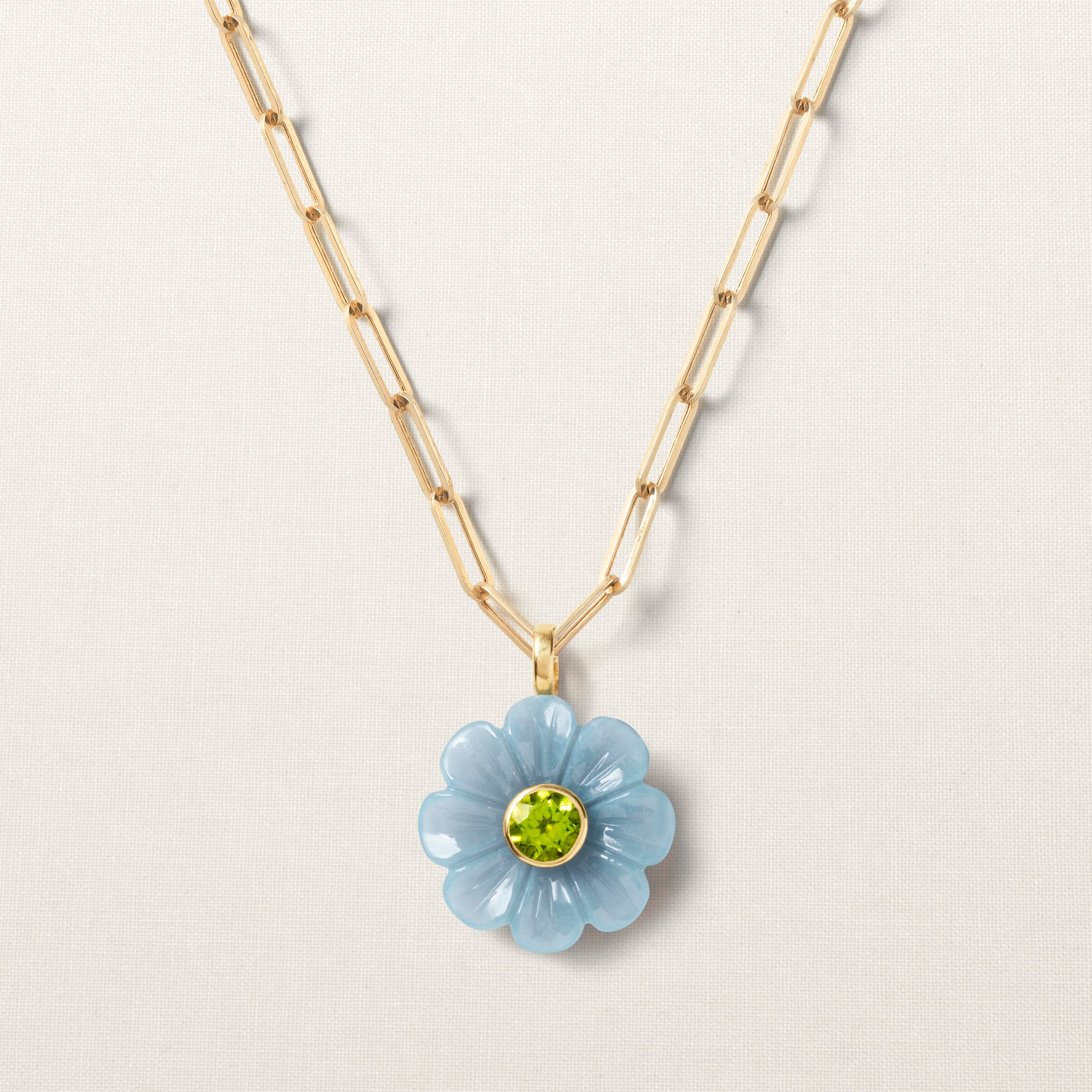 The flower on this iconic Sophie Joanne pendant is hand-carved from white by an expert artisan, using an age-old, stone-carving technique. Blue Opal clears and calms the heart and brings a sense of peace and tranquillity and allows to discharge stress.