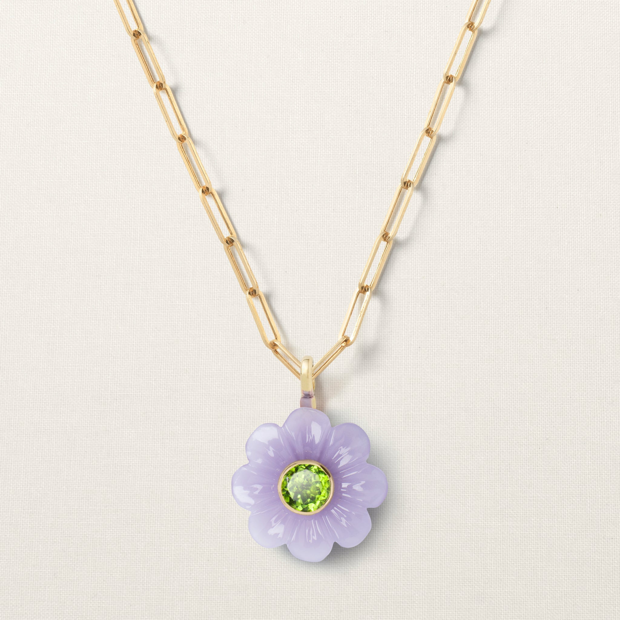 The flower on this Sophie Joanne pendant is hand-carved from yttrium fluorite by an expert artisan, using an age-old, wood-carving technique. Yttrium fluorite is believed to have a calming effect on the mind and body. It is helping to reduce stress and promote feelings of tranquility.Blue chalcedony restores calm and balance.