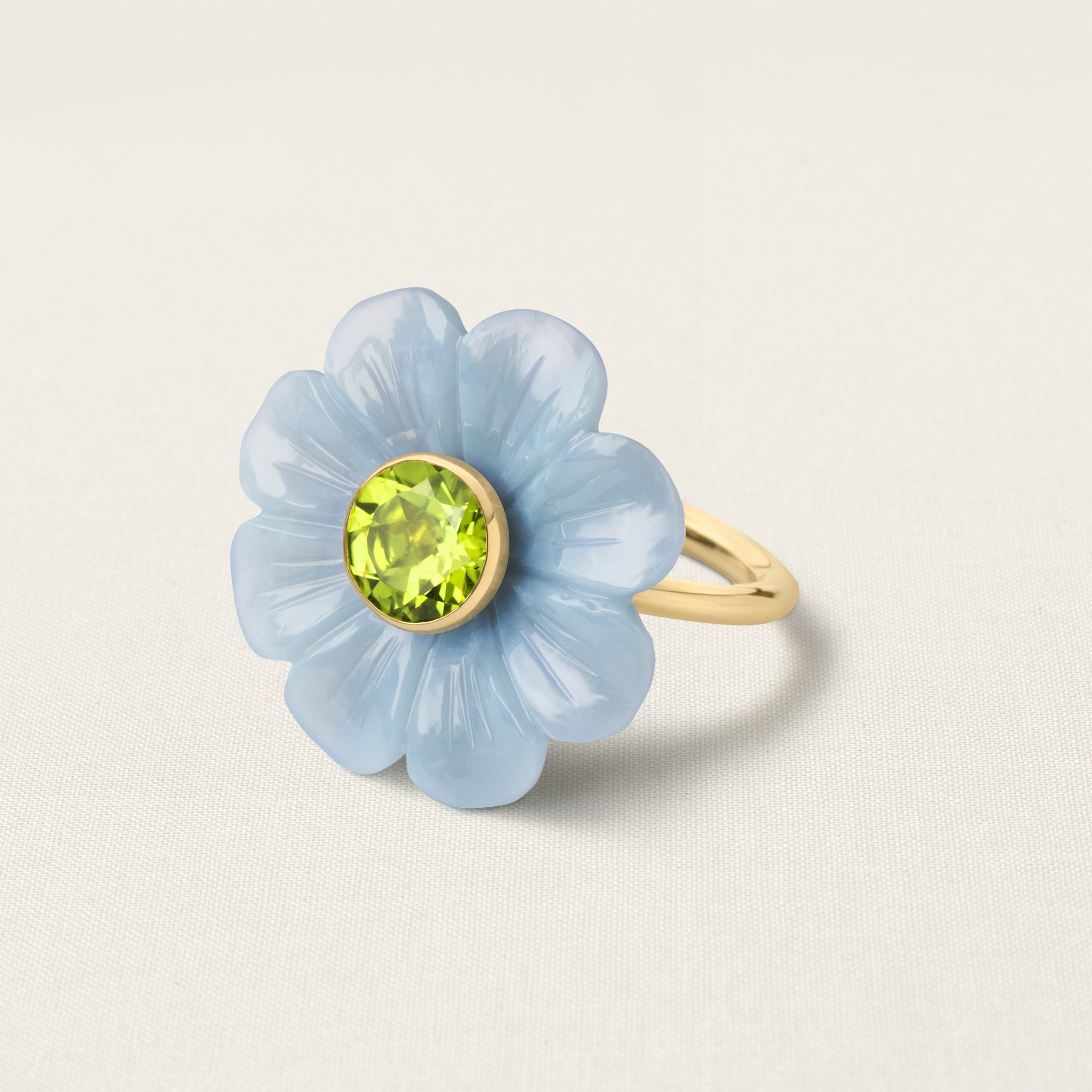 The flower on this iconic Sophie Joanne ring is hand-carved from blue opal by an expert artisan, using an age-old, wood-carving technique. Blue Opal is good for creativity, communication, and the courage to speak your mind.