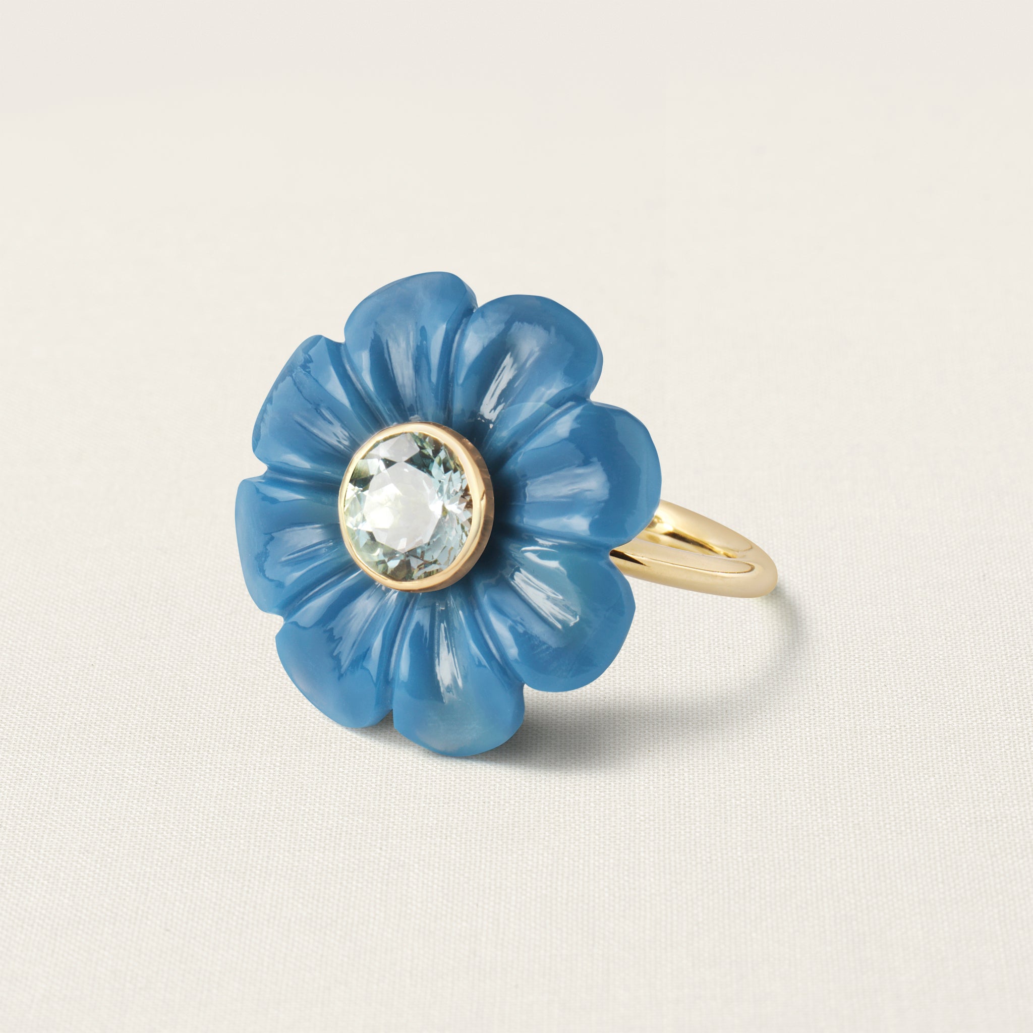 The Flower Ring is set with a brilliant-cut aquamarine. Aquamarine helps move towards closure, allowing space for peace and tranquillity.