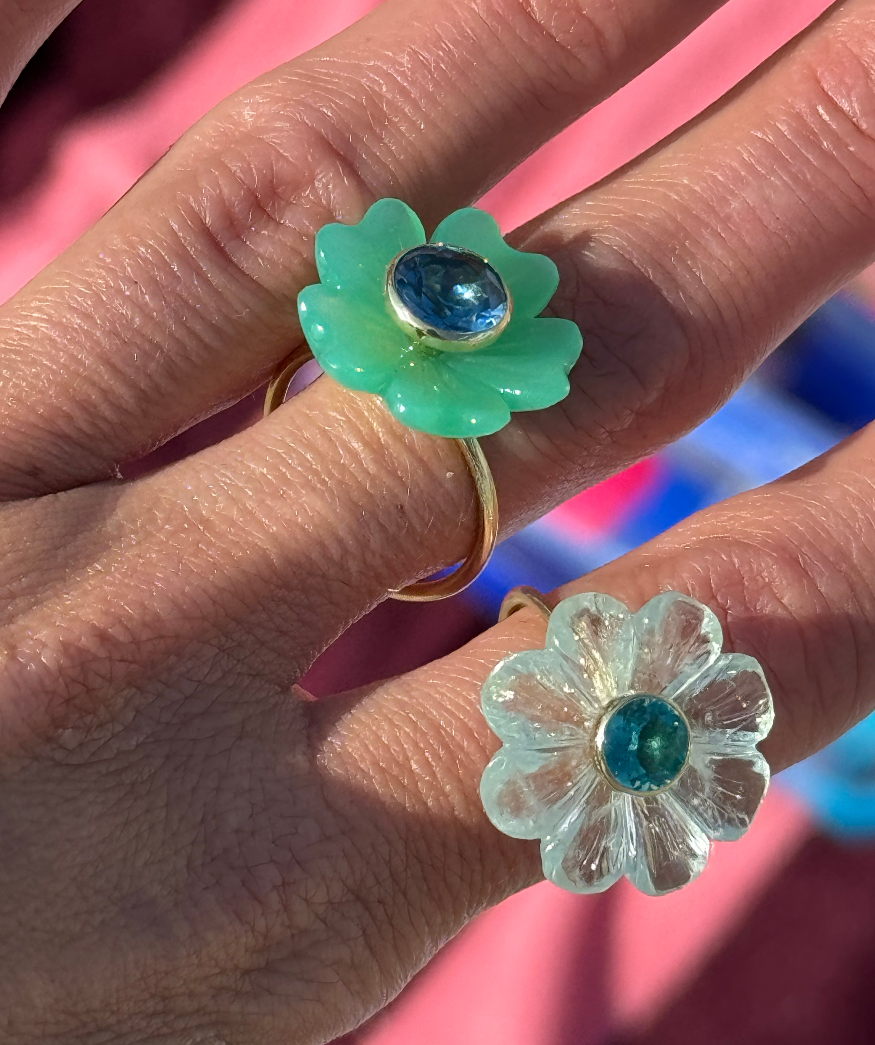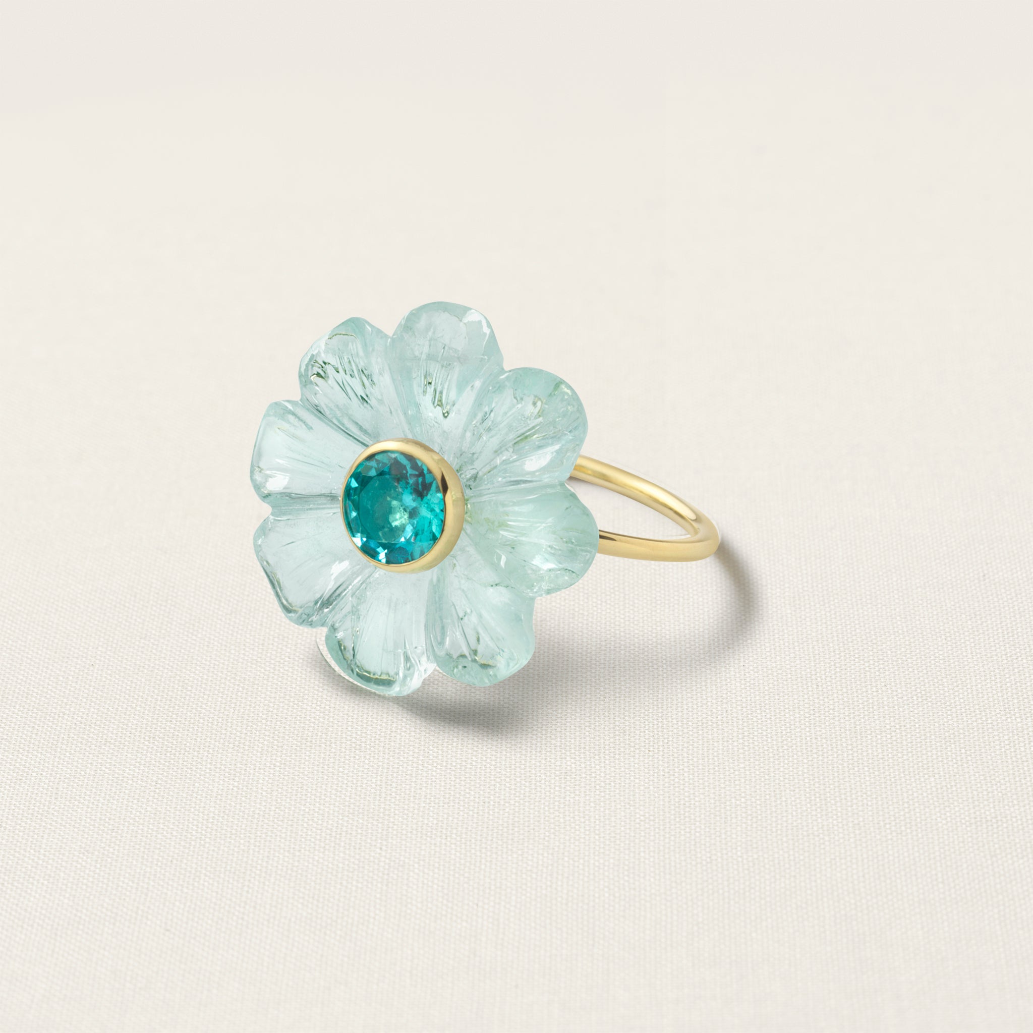 The flower on this iconic Sophie Joanne ring is hand-carved from Aquamarine by an expert artisan, using an age-old, wood-carving technique. Aquamarine helps move towards closure, allowing space for peace and tranquillity.