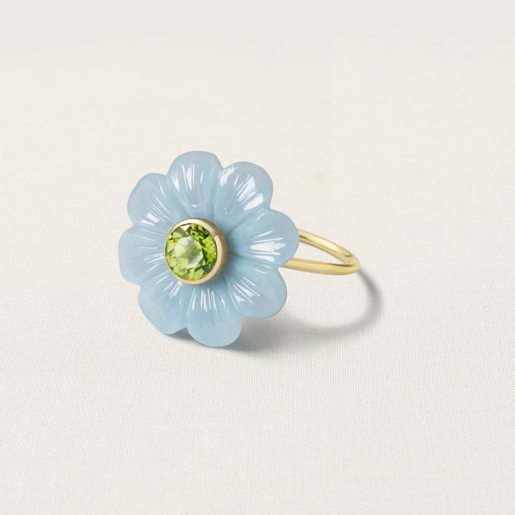 The flower on this iconic Sophie Joanne ring is hand-carved from blue opal by an expert artisan, using an age-old, wood-carving technique. Blue Opal clears and calms the heart and brings a sense of peace and tranquillity and allows to discharge stress.
