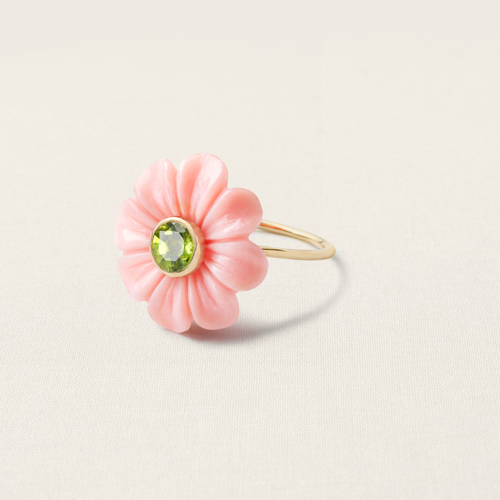 The flower on this iconic Sophie Joanne ring is hand-carved from pink opal by an expert artisan, using an age-old, wood-carving technique. Pink Opal clears and calms the heart and brings a sense of peace and tranquillity and allows to discharge stress.