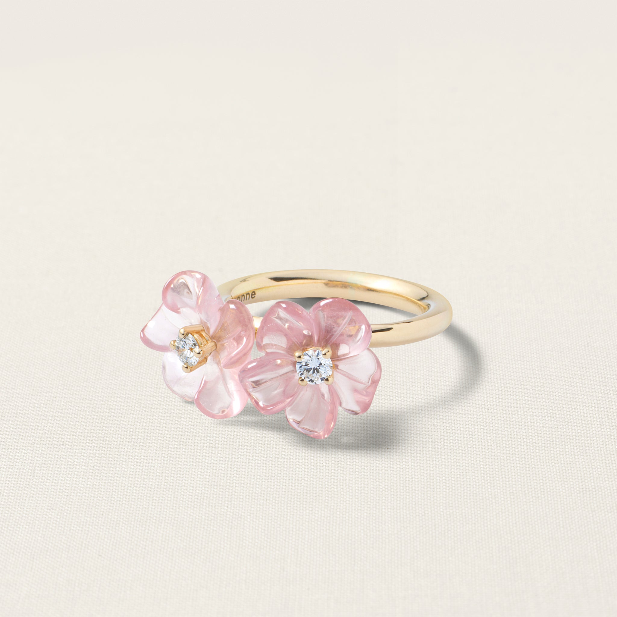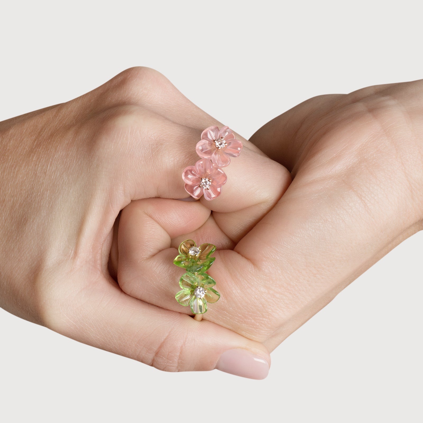 The rose quartz flowers are elegantly paired with Top Wesselton VVS diamonds.