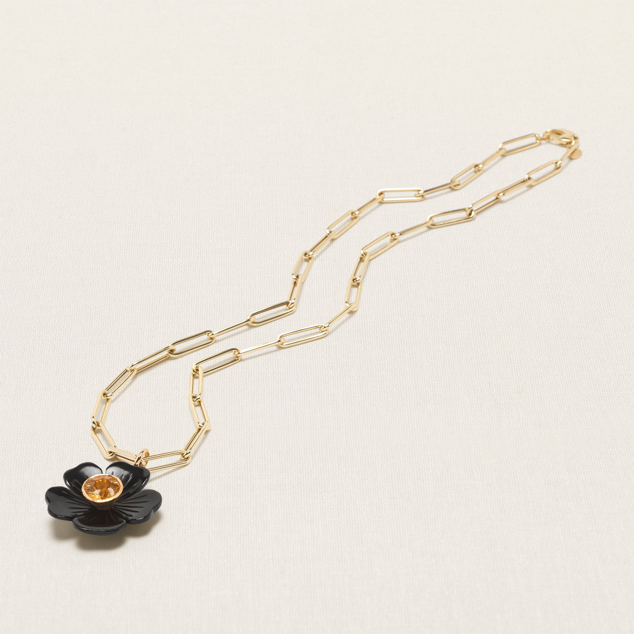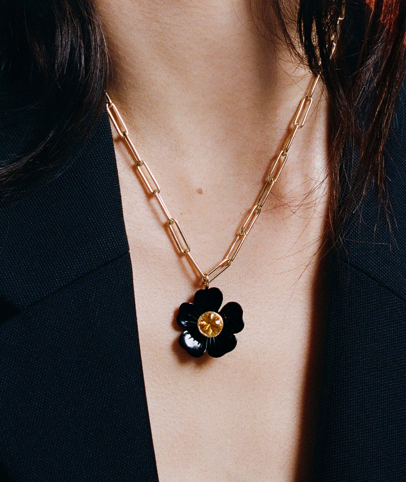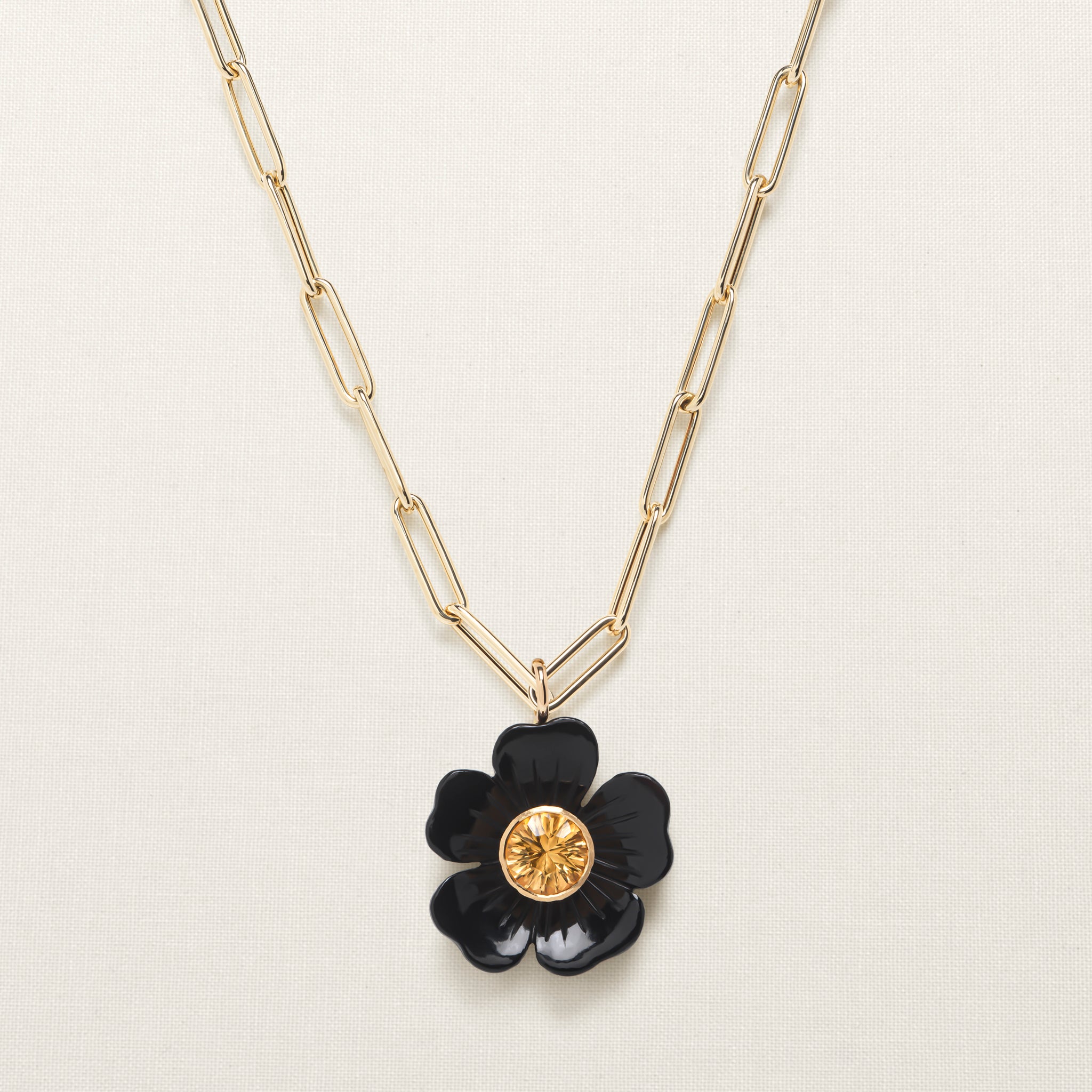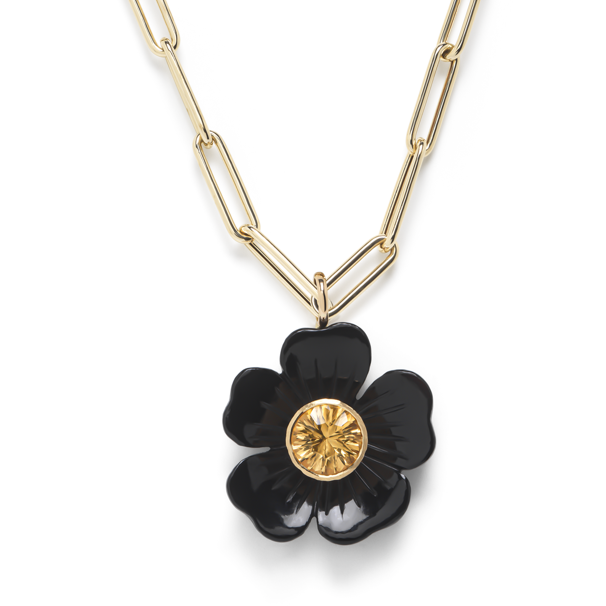 The flower on this iconic Sophie Joanne pendant is hand-carved from black onyx by an expert artisan, using an age-old, stone-carving technique. Black onyx is a soothing stone, taking on its energy lets you breathe easier.