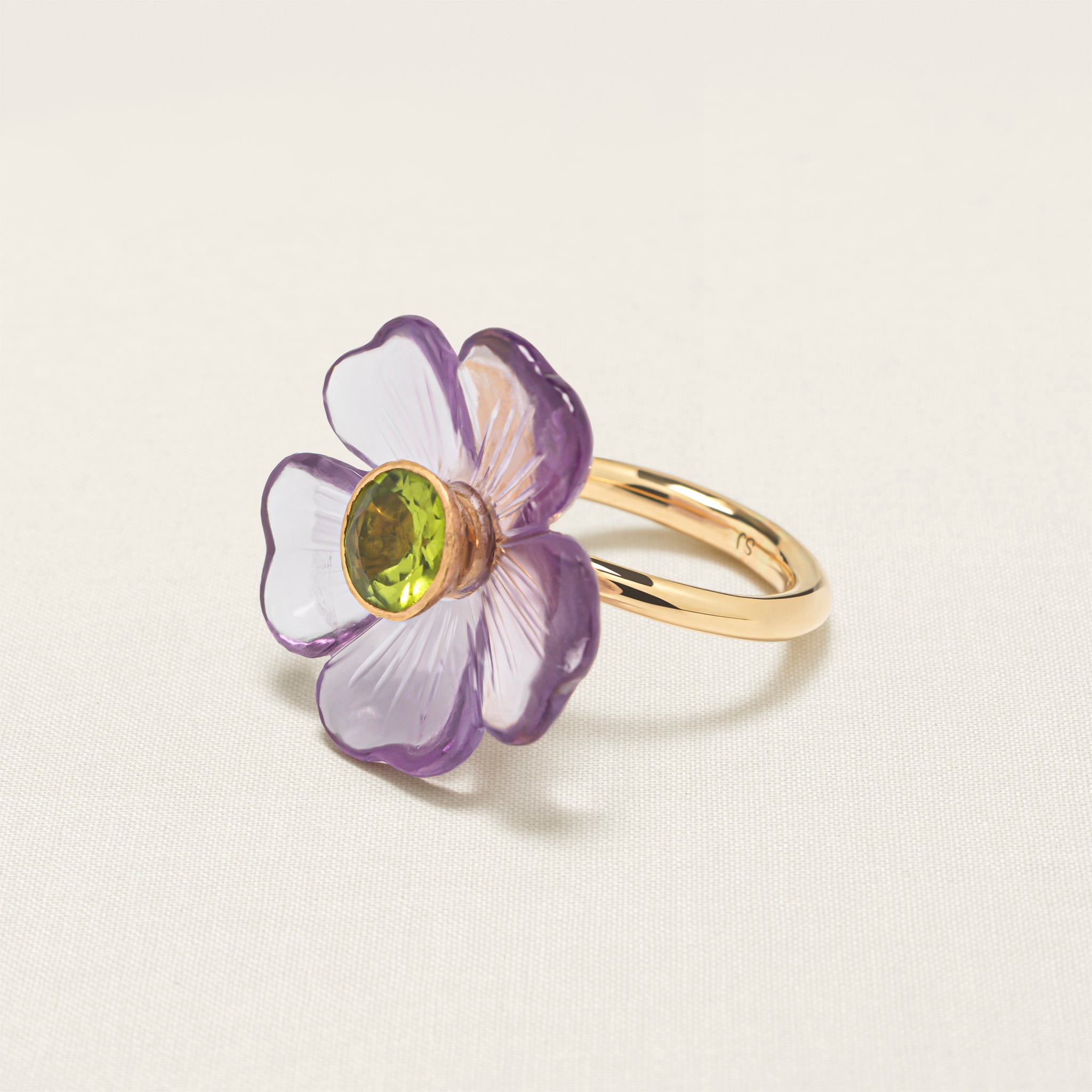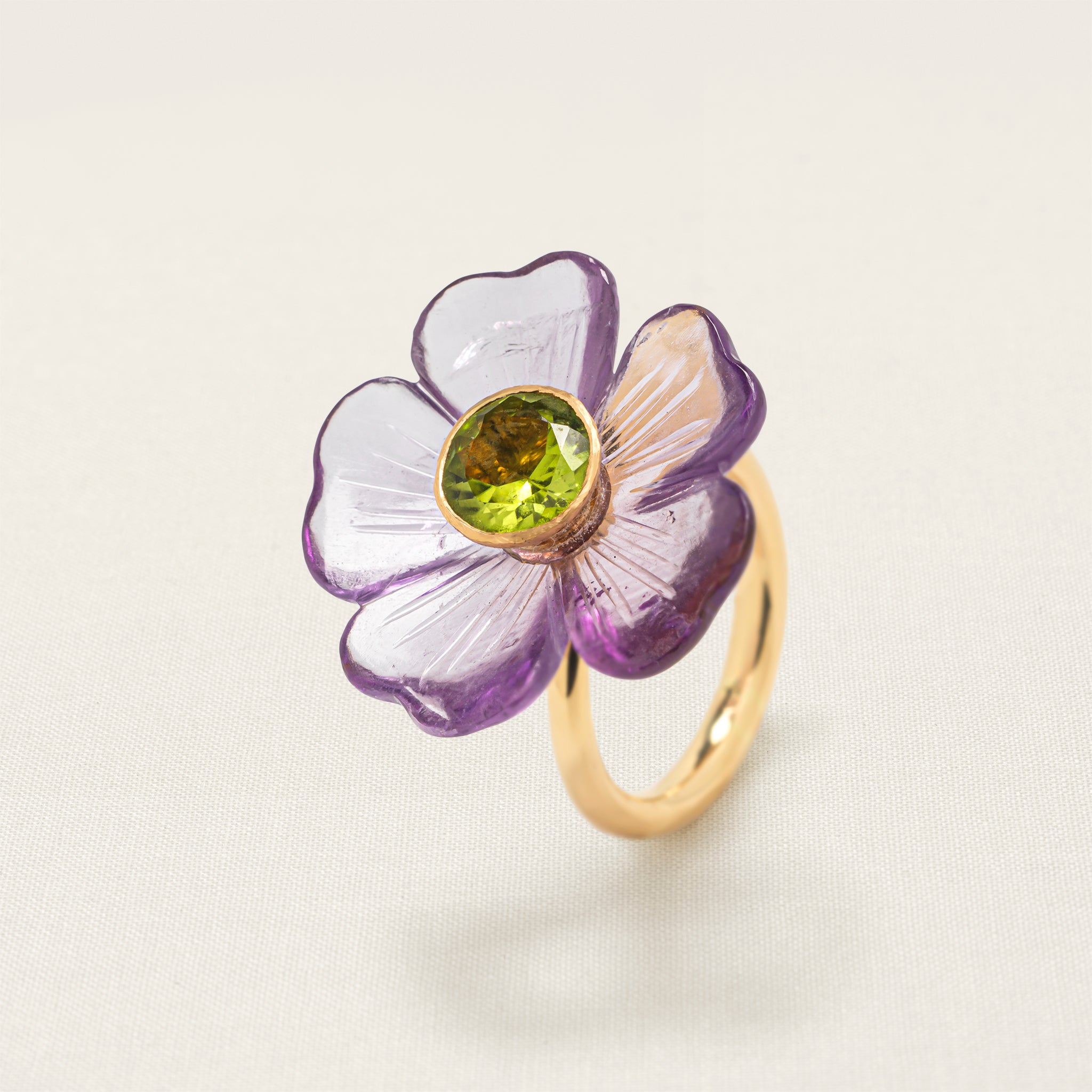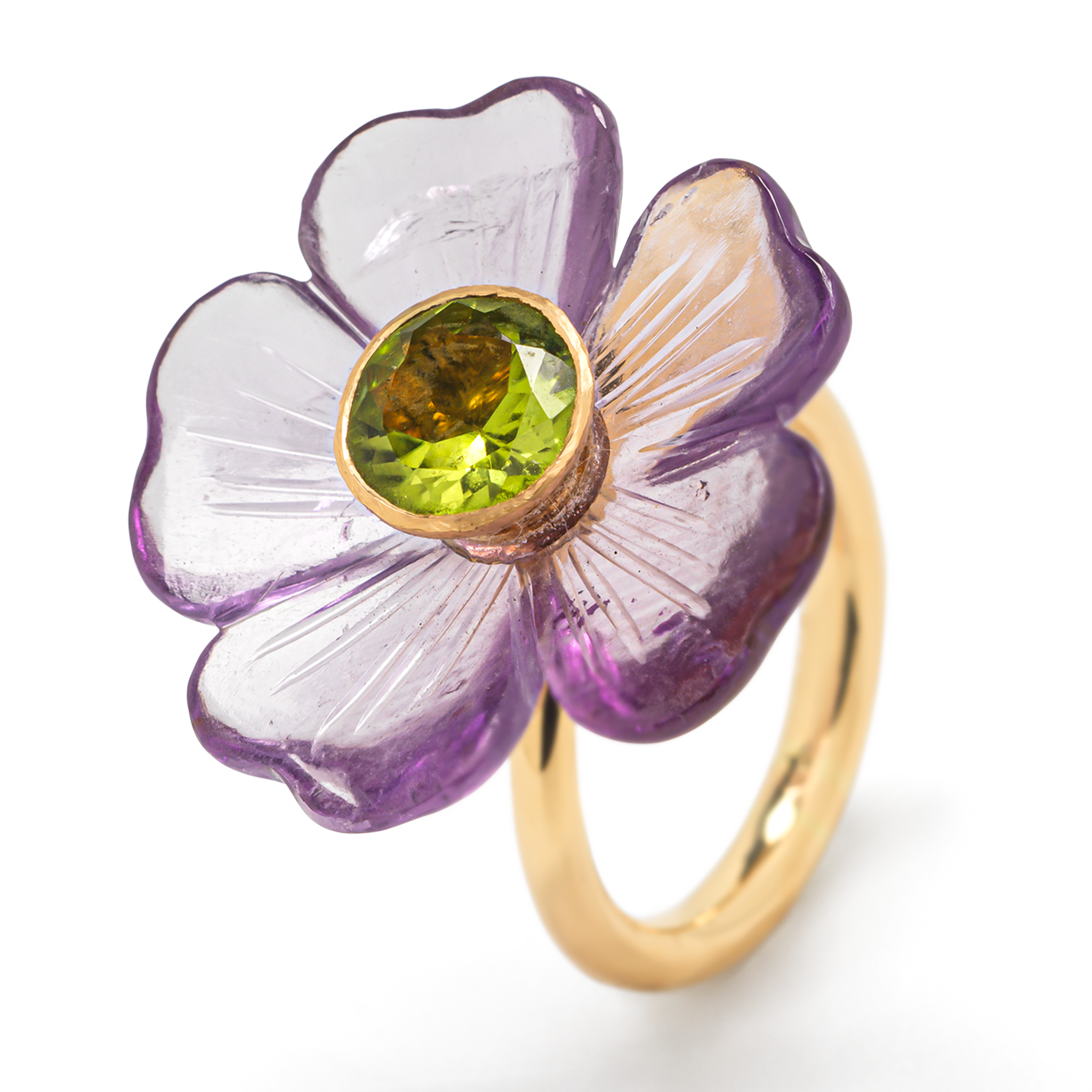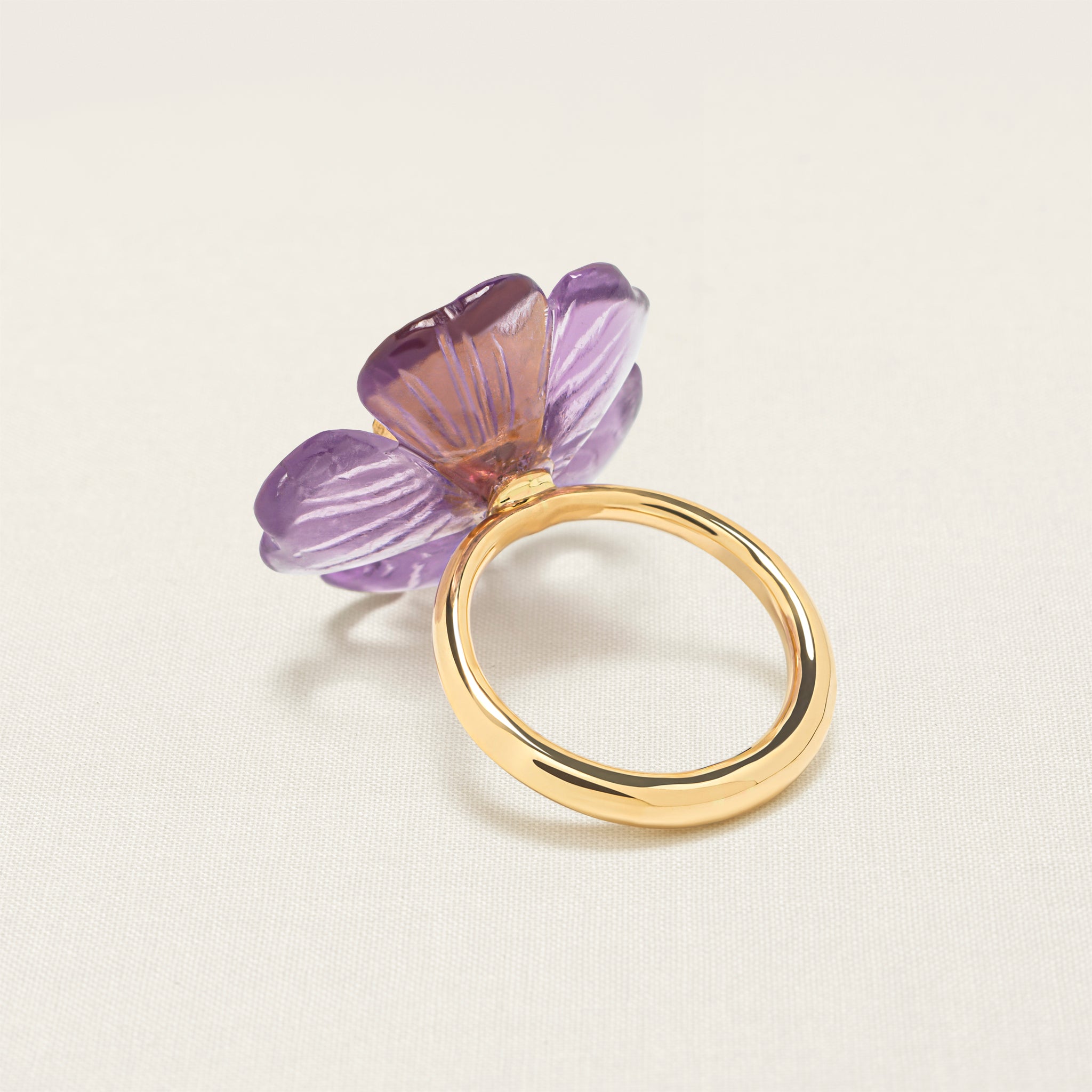 The flower on this iconic Sophie Joanne ring is hand-carved from amethyst by an expert artisan, using an age-old, wood-carving technique. Amethyst blocks negative energies and it helps to remember and understand your dreams.