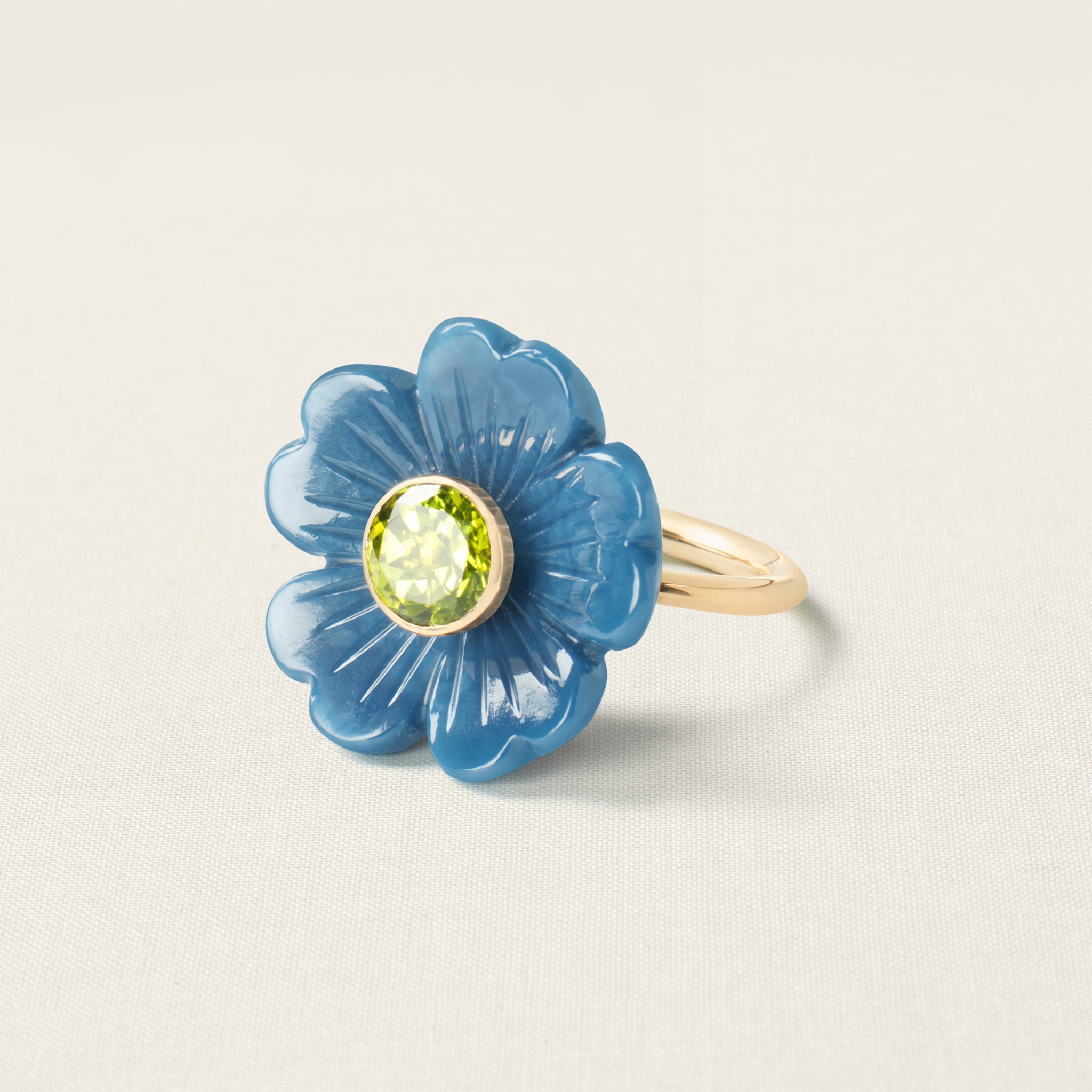 The flower on this iconic Sophie Joanne ring is hand-carved from blue opal by an expert artisan, using an age-old, wood-carving technique. Blue Opal is good for creativity, communication, and the courage to speak your mind.