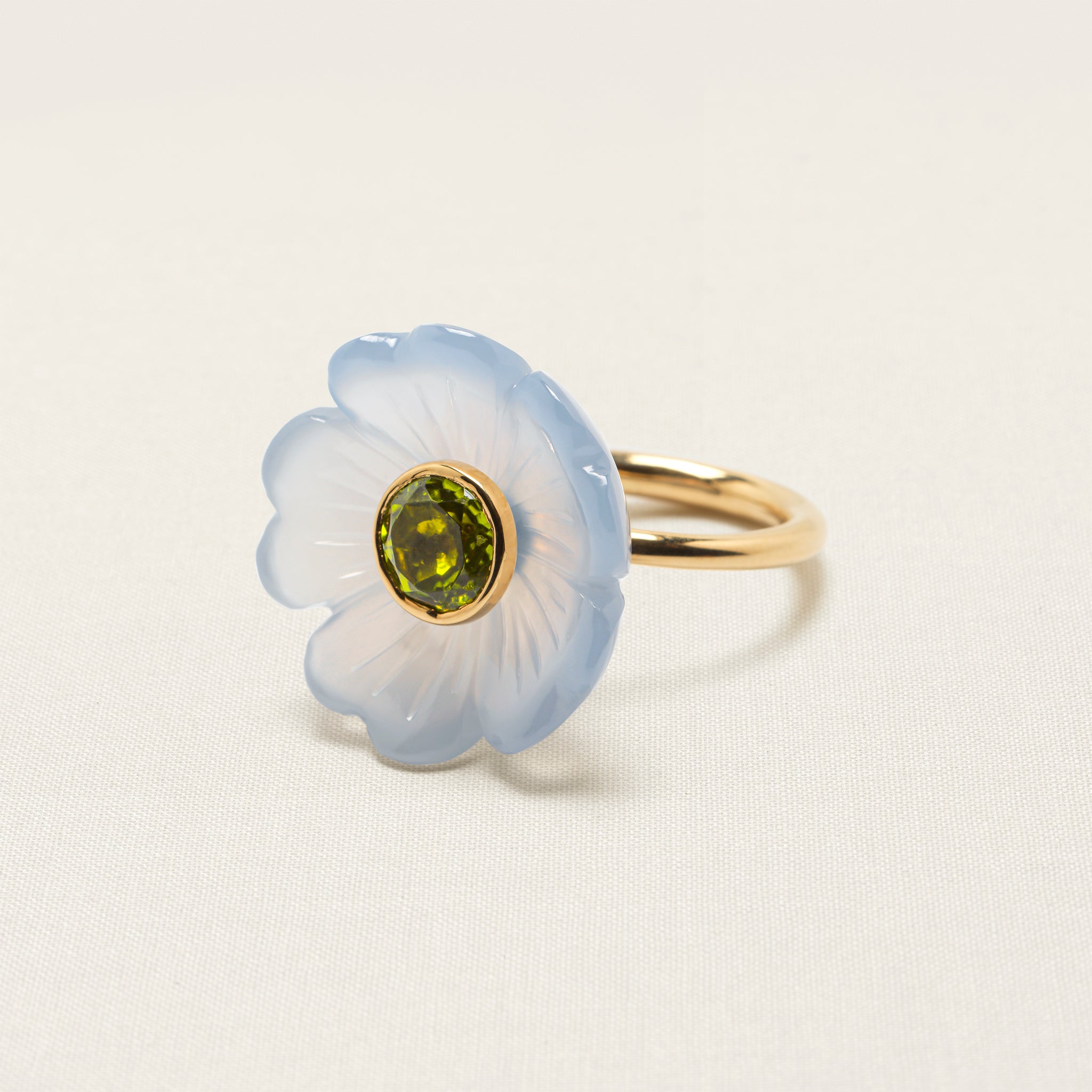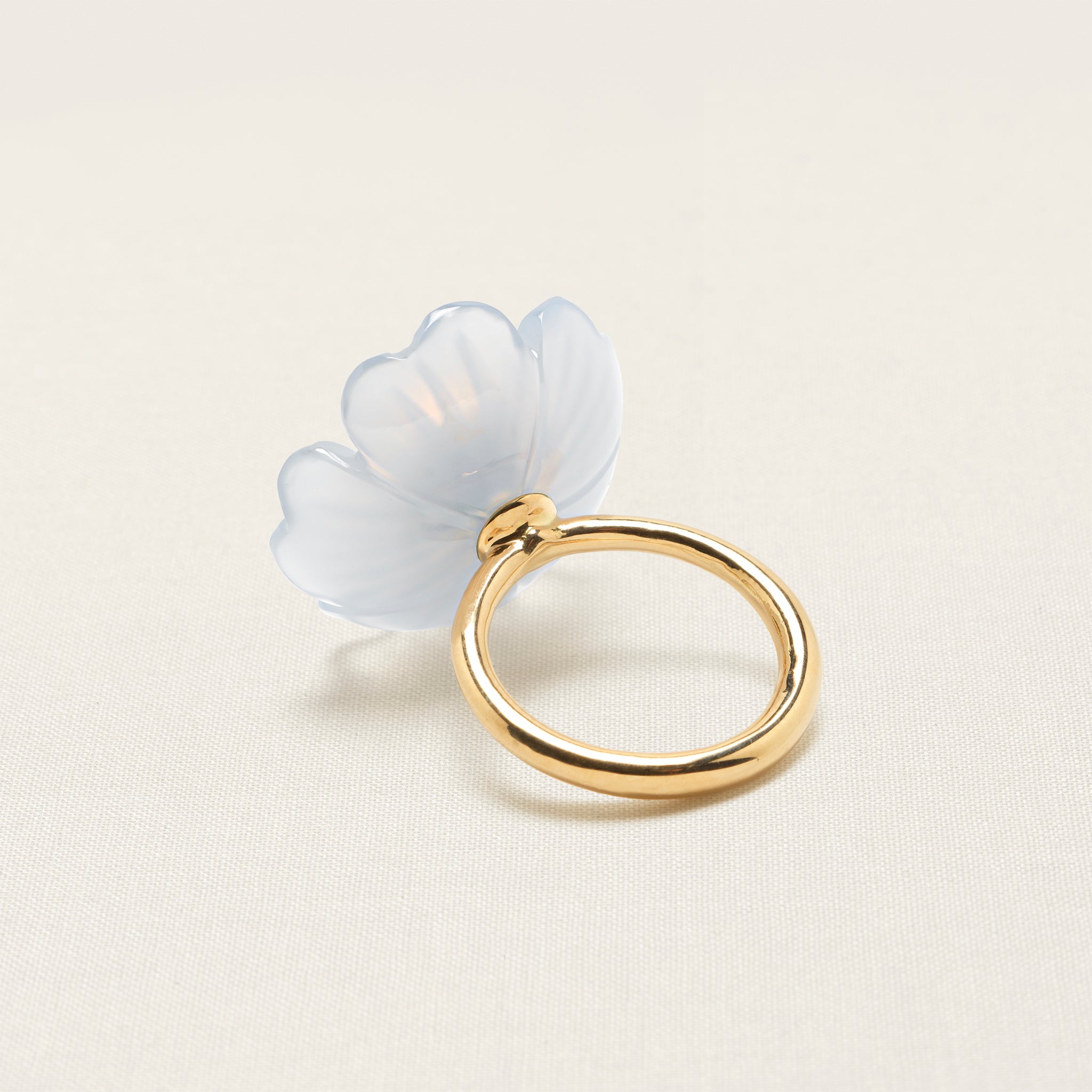 The flower on this iconic Sophie Joanne ring is hand-carved from blue chalcedony that restores calm and balance, by an expert artisan, using an age-old, wood-carving technique.