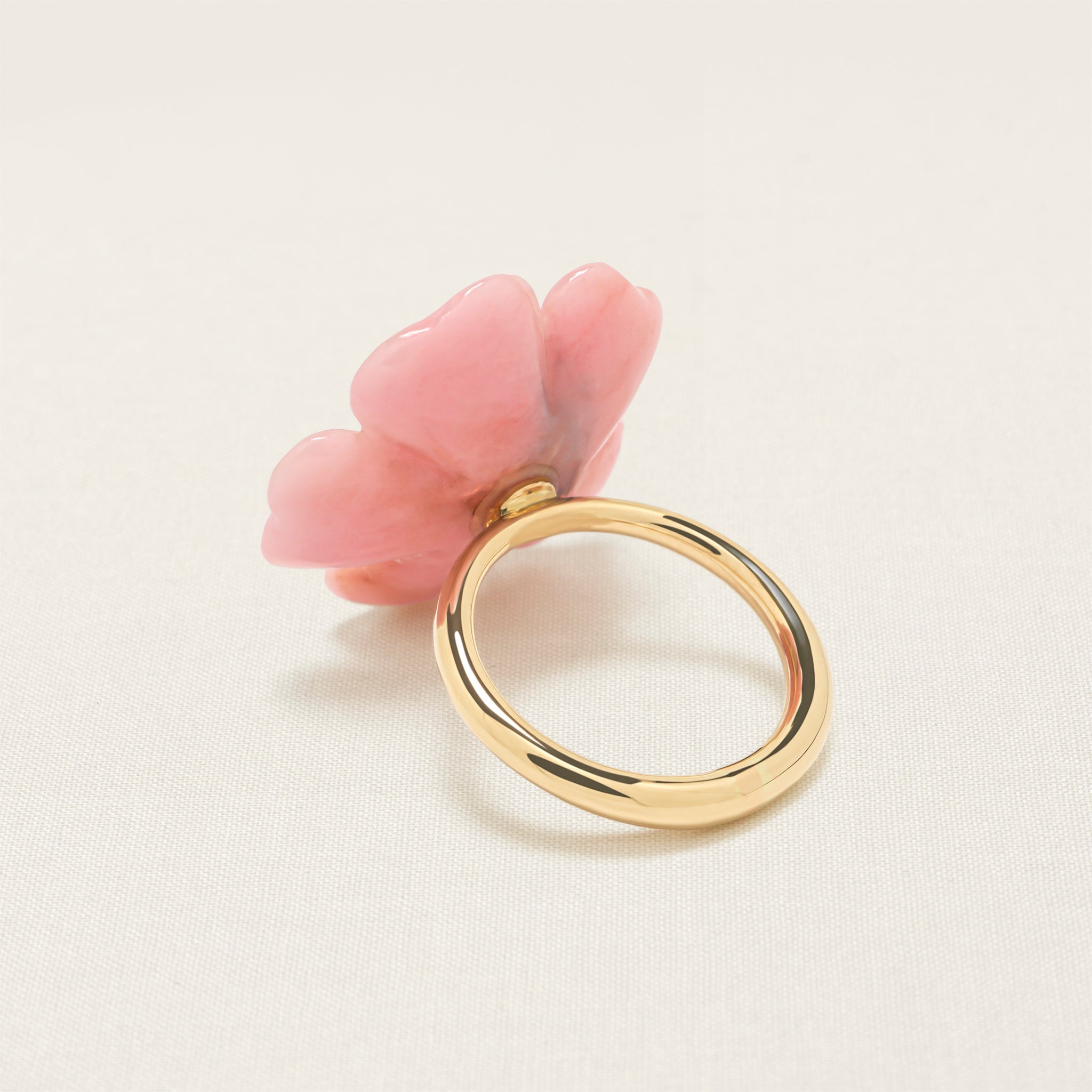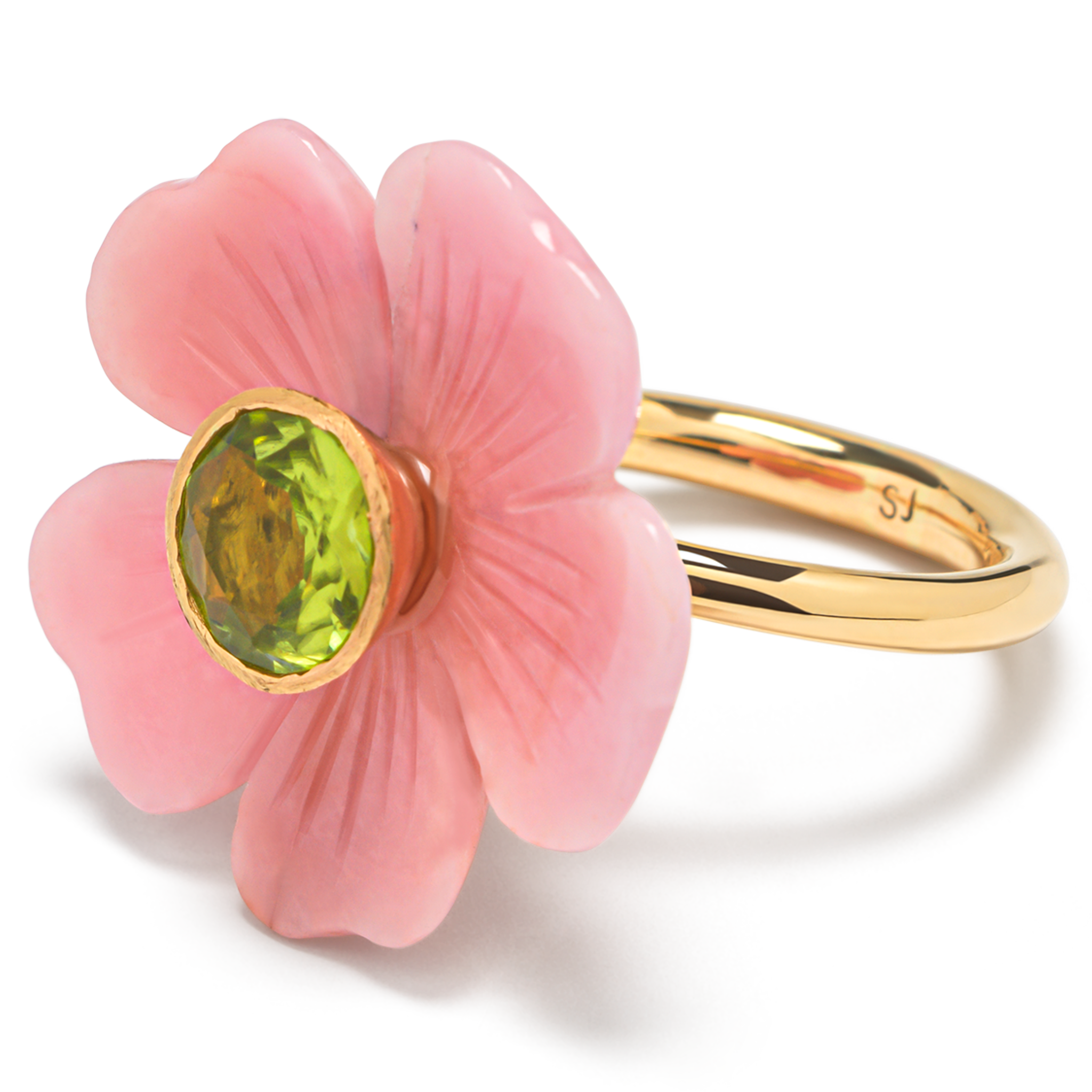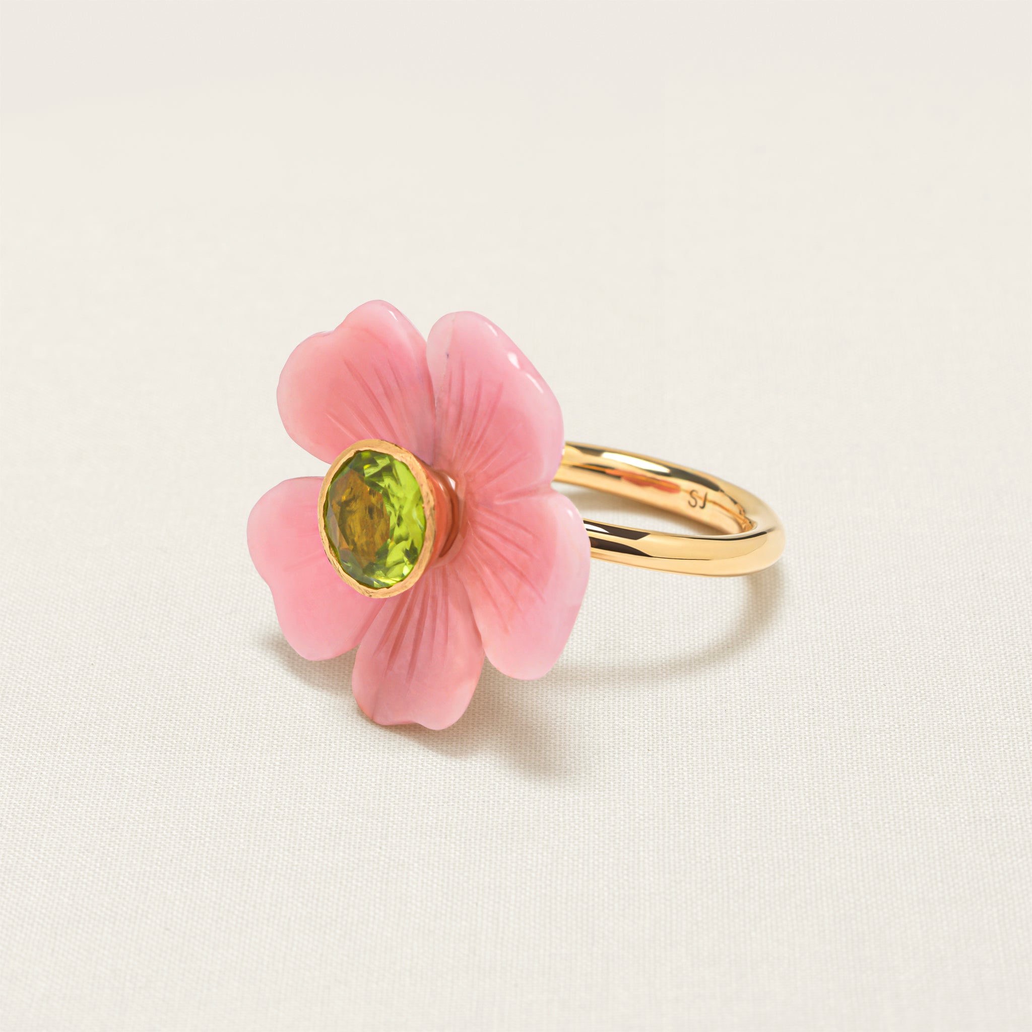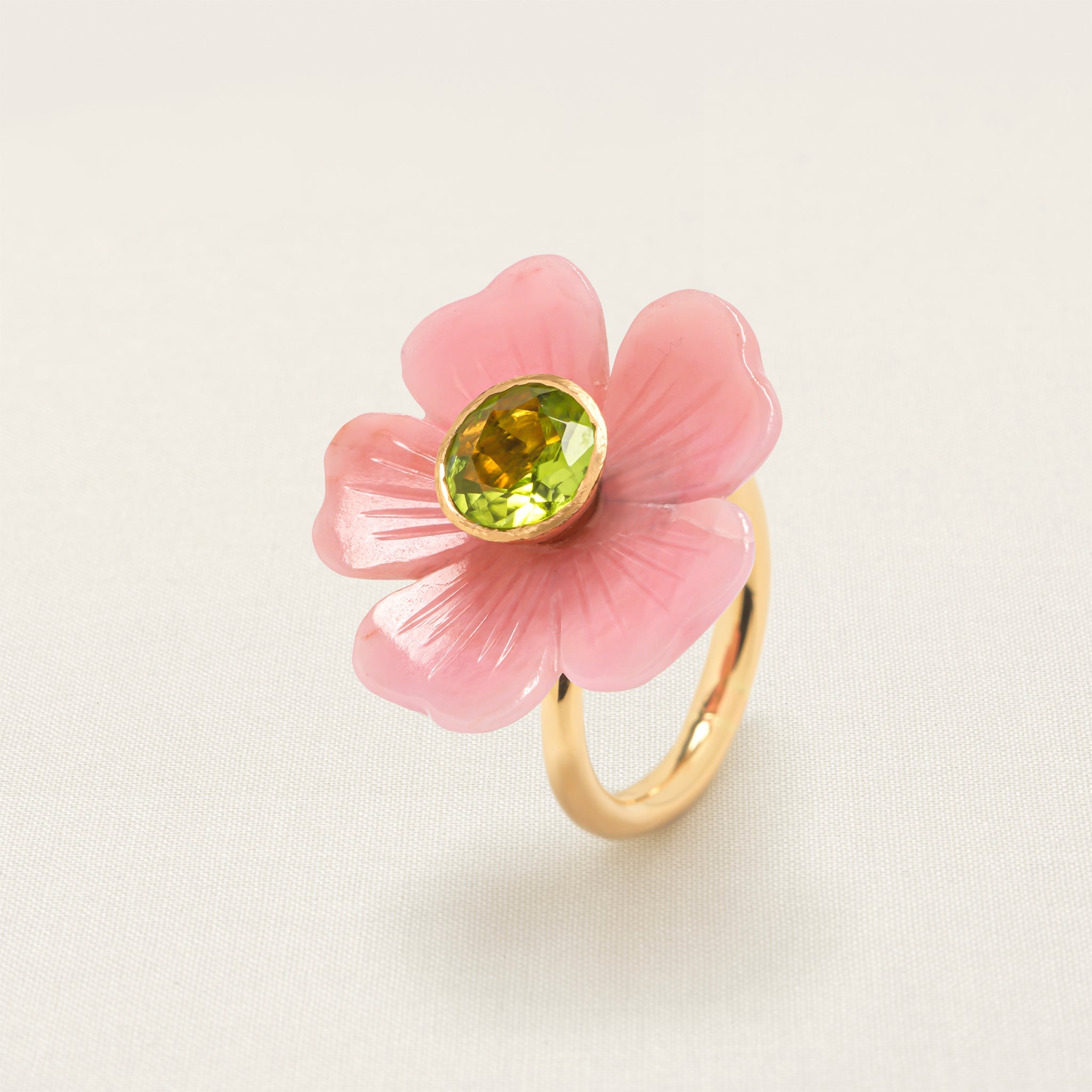 The flower on this iconic Sophie Joanne ring is hand-carved from pink opal by an expert artisan, using an age-old, wood-carving technique. Pink Opal clears and calms the heart and brings a sense of peace and tranquillity and allows to discharge stress.