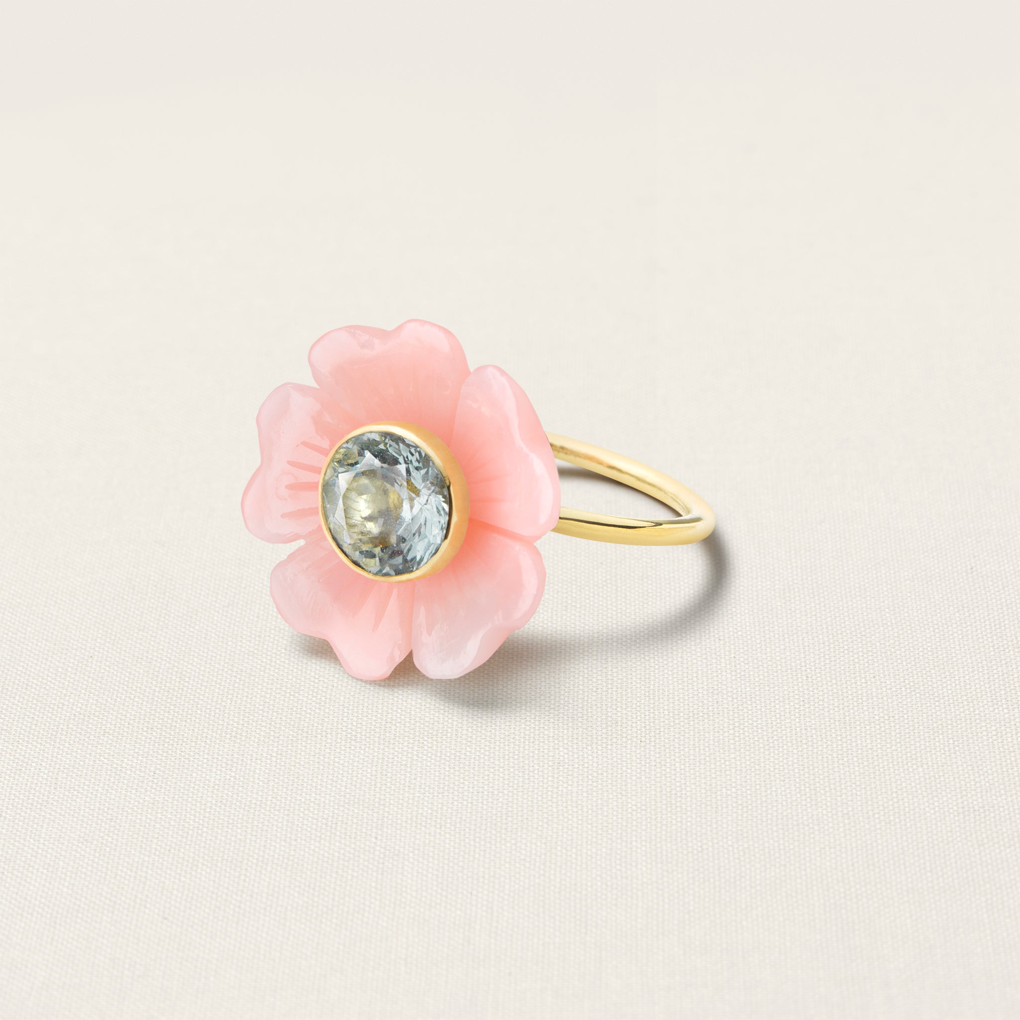 The flower on this iconic Sophie Joanne ring is hand-carved from pink opal by an expert artisan, using an age-old, wood-carving technique. Pink Opal clears and calms the heart, brings a sense of peace, and allows to discharge stress.