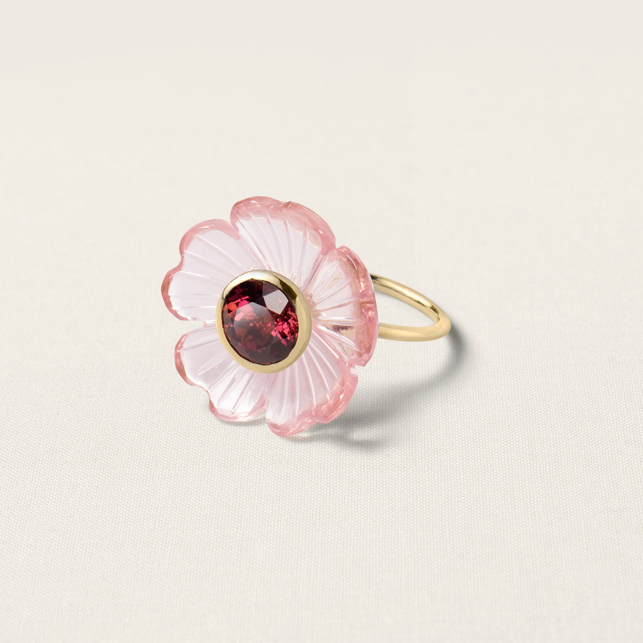 The flower on this iconic Sophie Joanne ring is hand-carved from rose quartz by an expert artisan, using an age-old, wood-carving technique. Rose quartz is a symbol of unconditional love, forgiveness, and compassion.