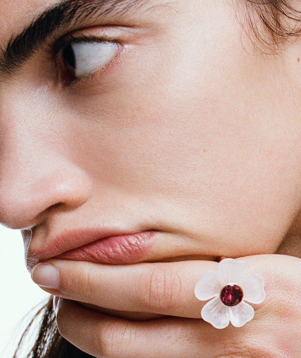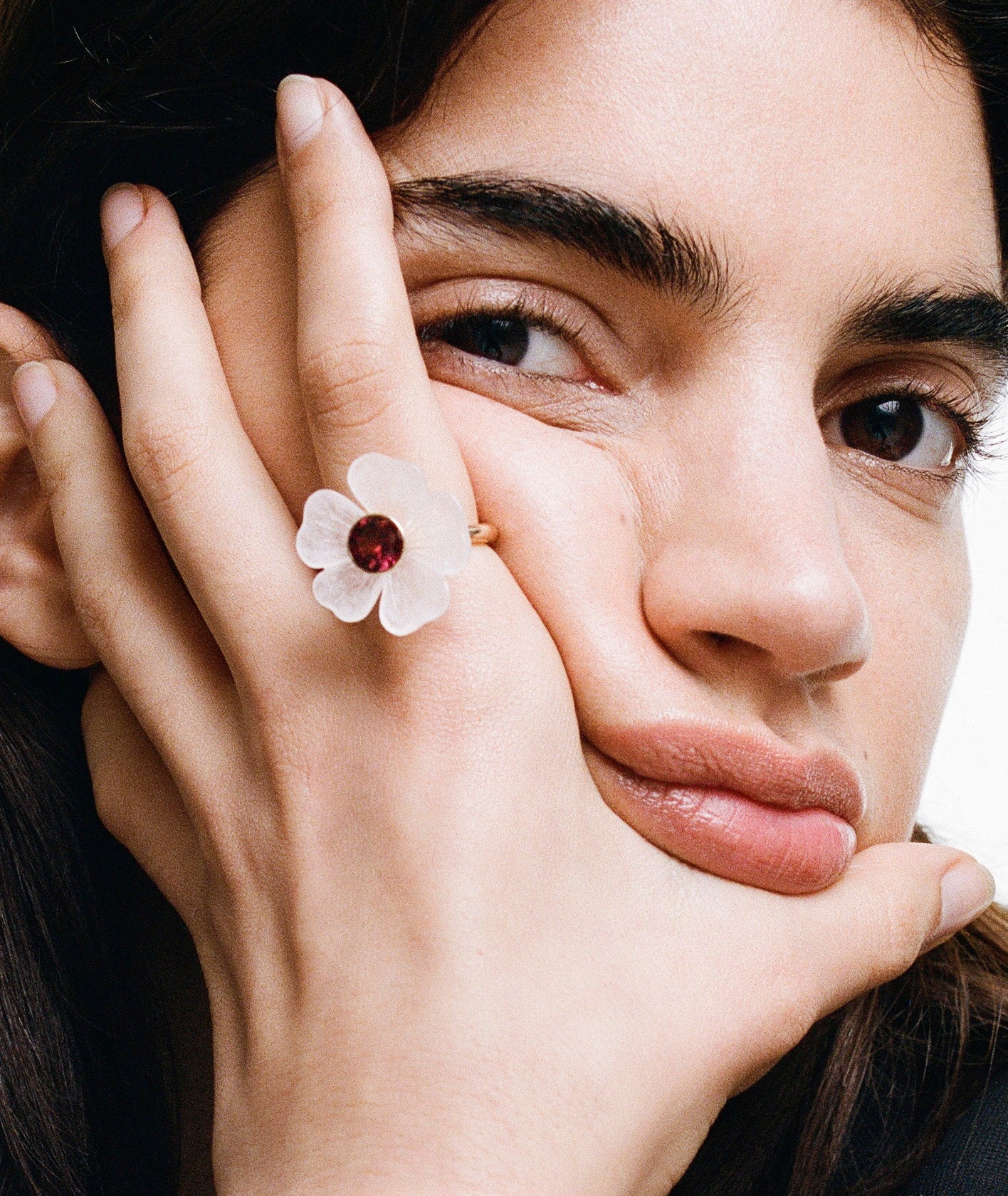 The Flower ring is set with a brilliant-cut tourmaline, which symbolizes joy, emotional healing, and love.