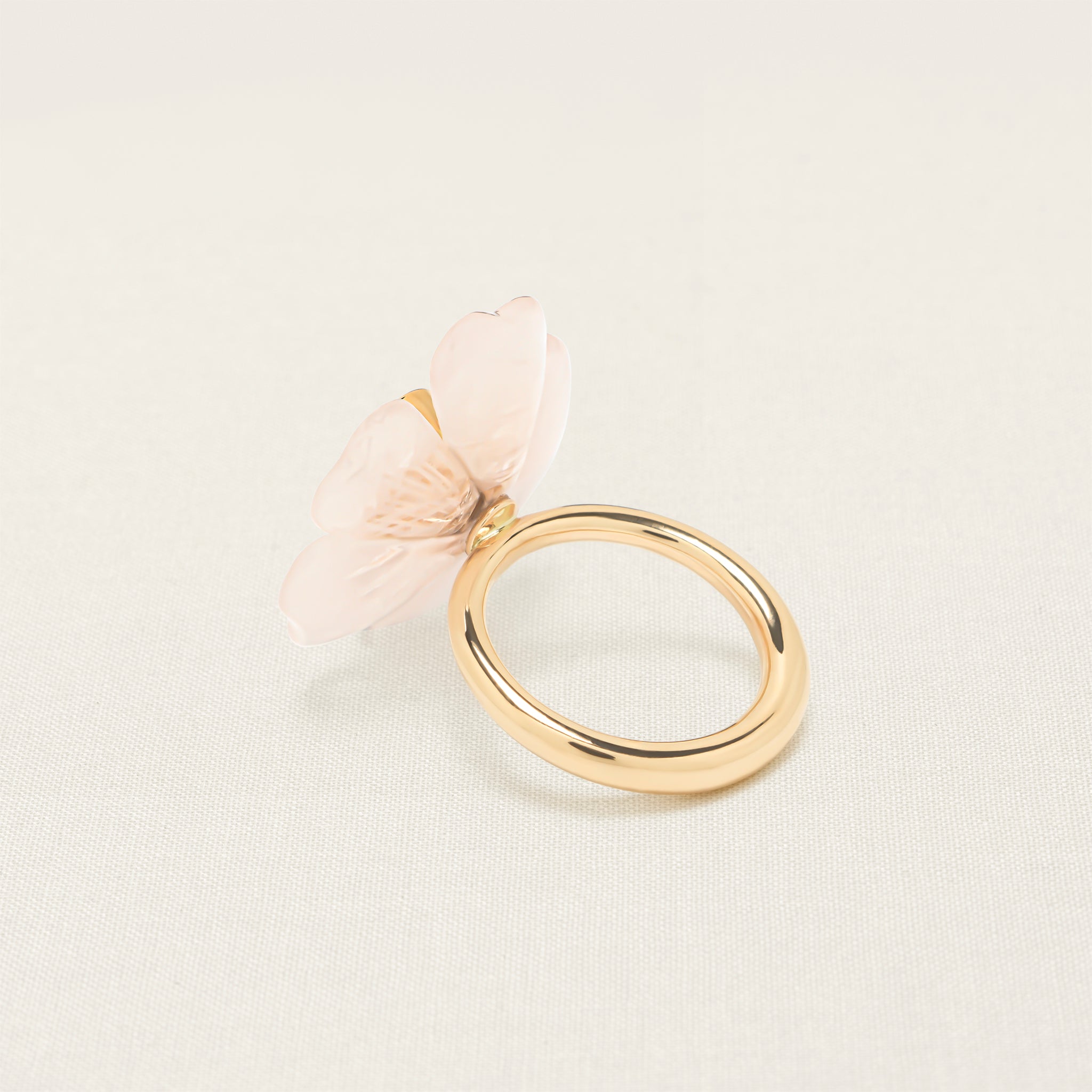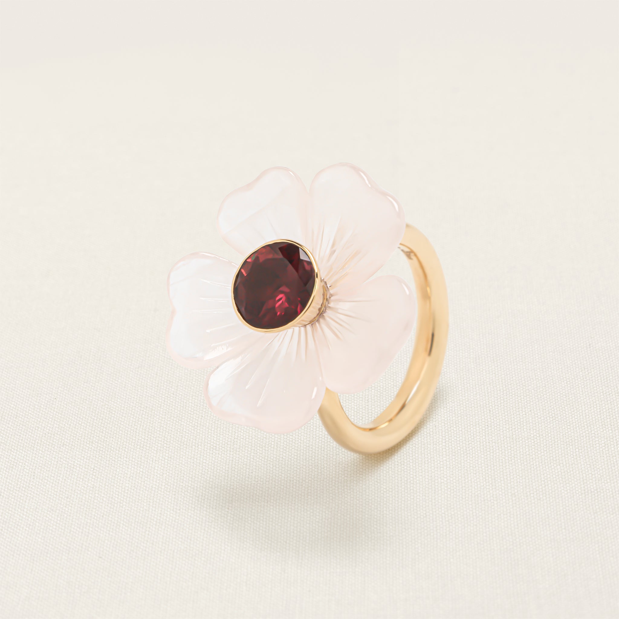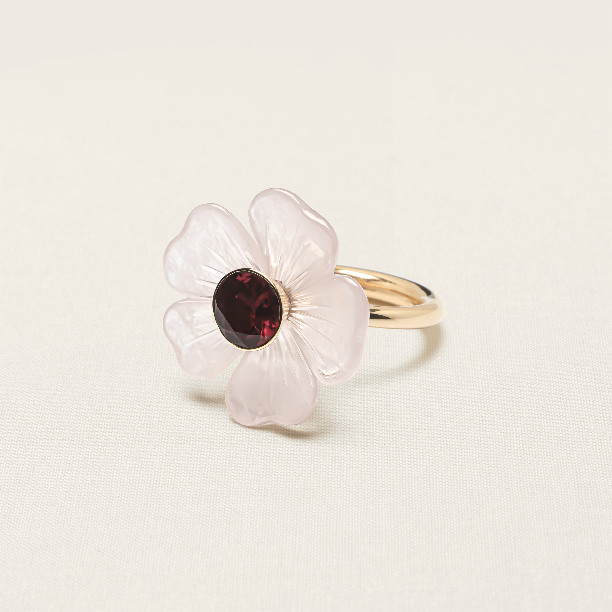 The flower on this iconic Sophie Joanne ring is hand-carved from rose quartz by an expert artisan, using an age-old, wood-carving technique. Rose quartz is a symbol of unconditional love, forgiveness, and compassion.