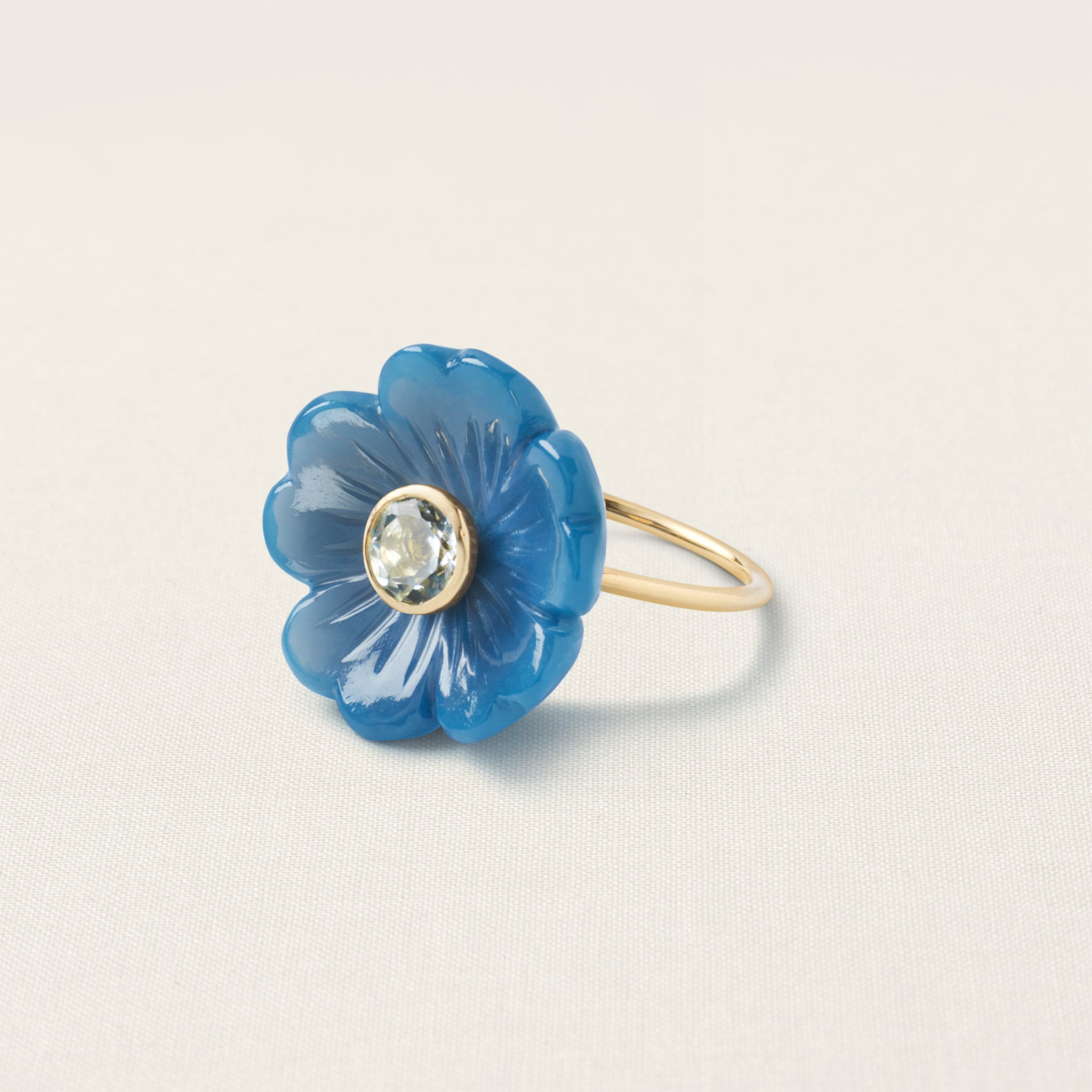 The flower on this iconic Sophie Joanne ring is hand-carved from blue opal by an expert artisan, using an age-old, wood-carving technique. Blue Opal is good for creativity, communication, and the courage to speak your mind.