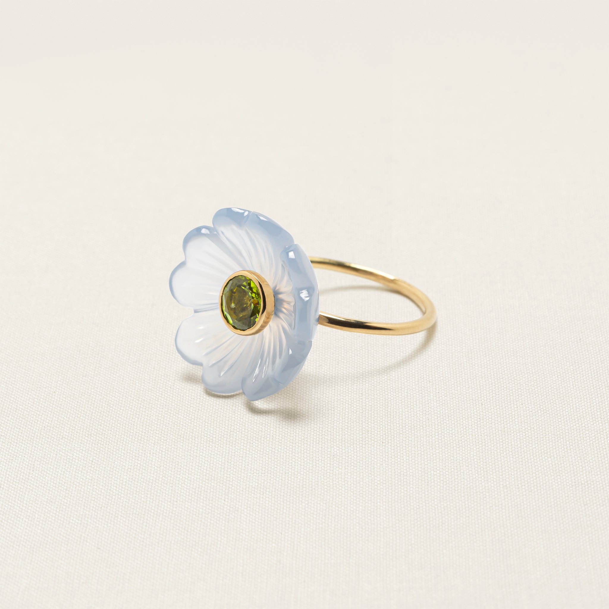 The flower on this iconic Sophie Joanne ring is hand-carved from blue chalcedony that restores calm and balance, by an expert artisan, using an age-old, wood-carving technique. Blue chalcedony restores calm and balance.