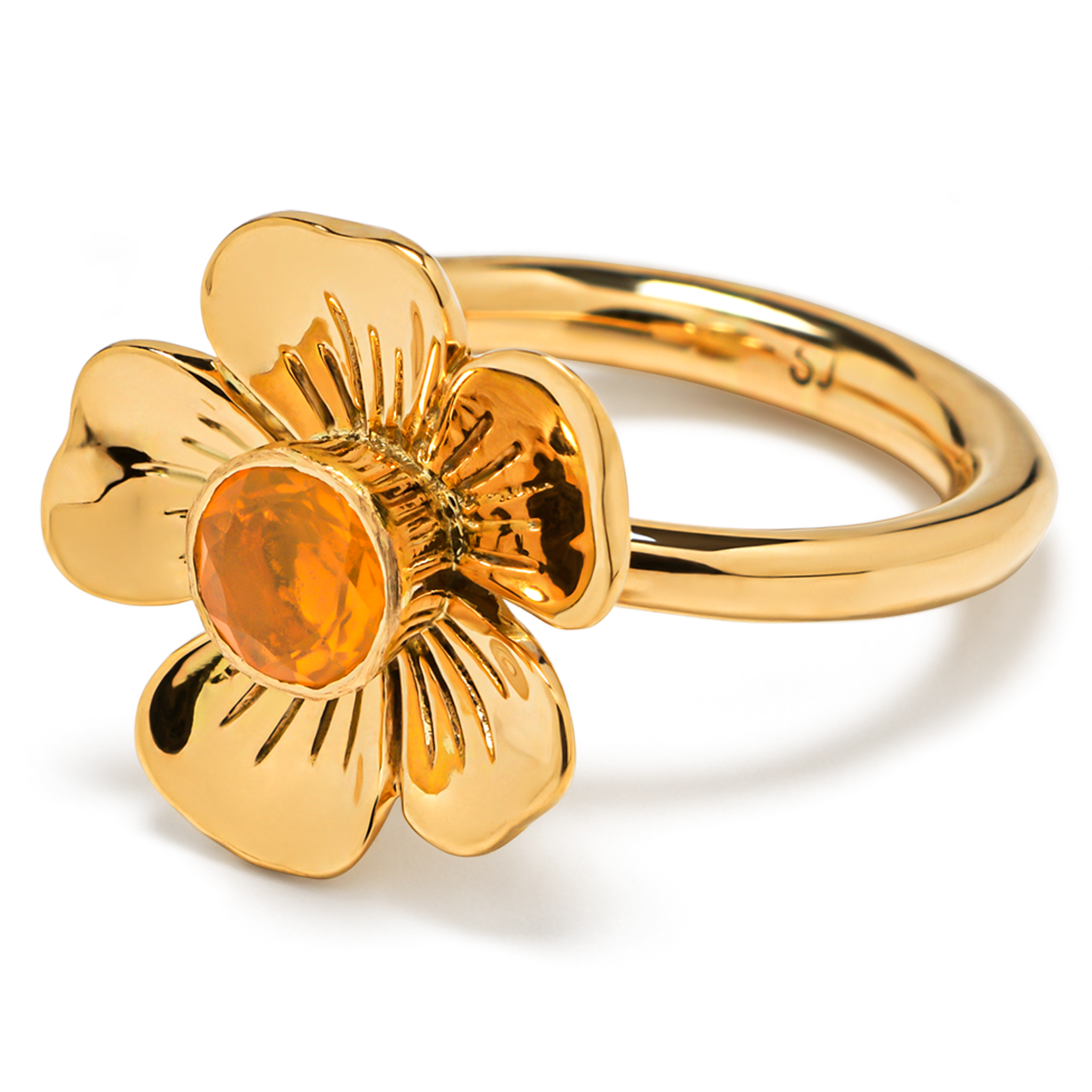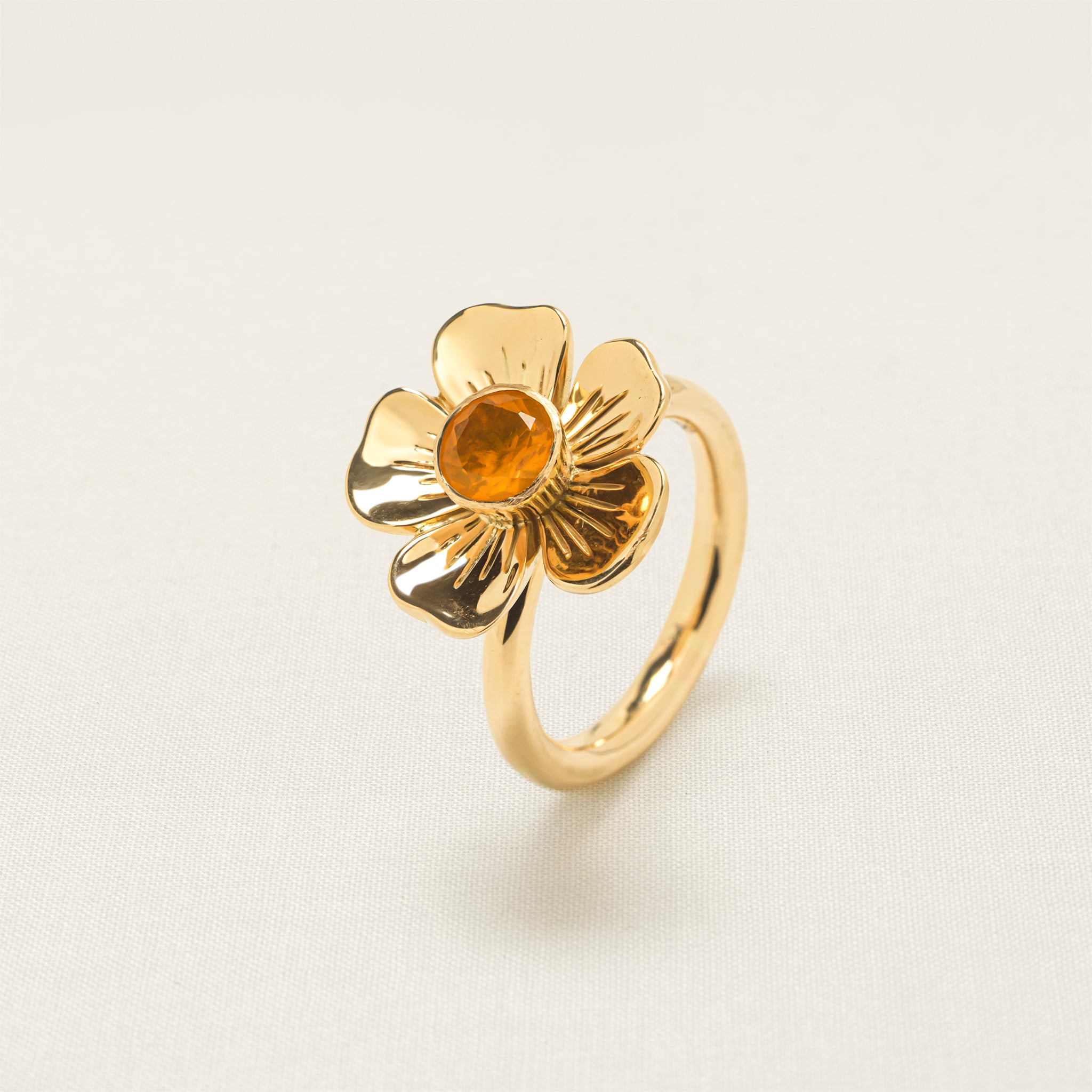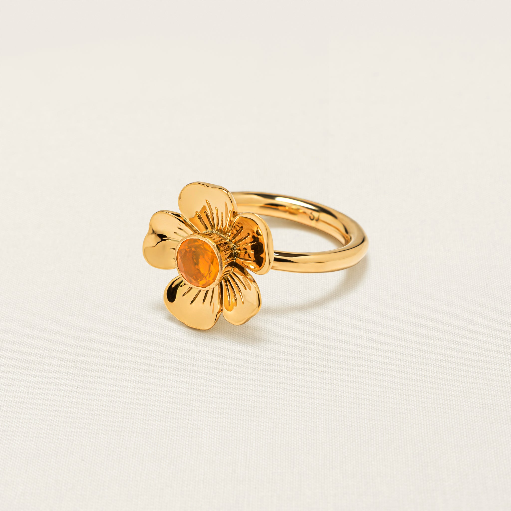The flower on this iconic Sophie Joanne ring is hand-carved from 14-karat recycled gold by an expert artisan, using an age-old, wood-carving technique, and is set with a brilliant-cut fire opal. Fire opal represents the joy of the heart. It is an awakener of passion and creativity and enhances the pleasure and intensity o different elements of life.