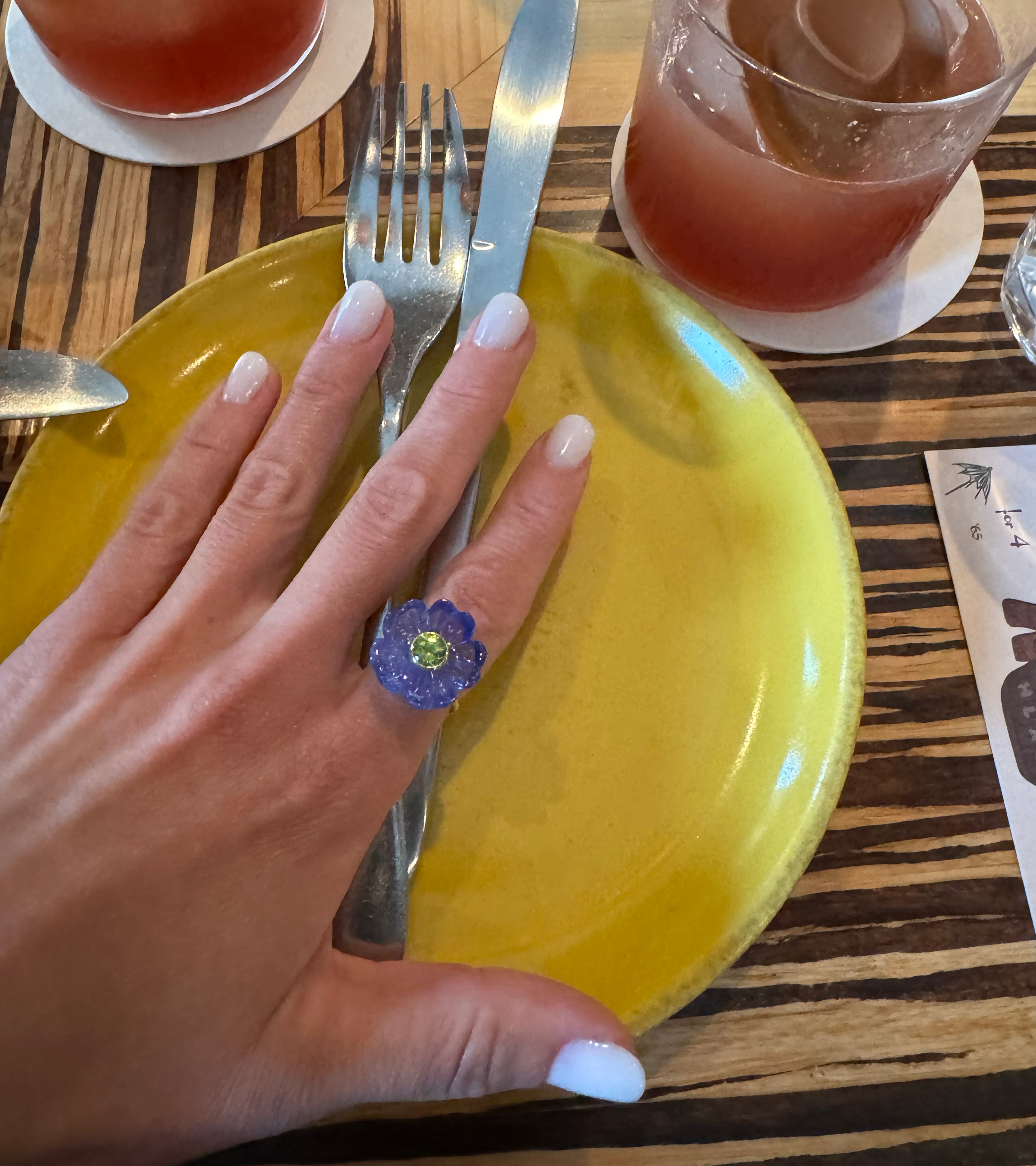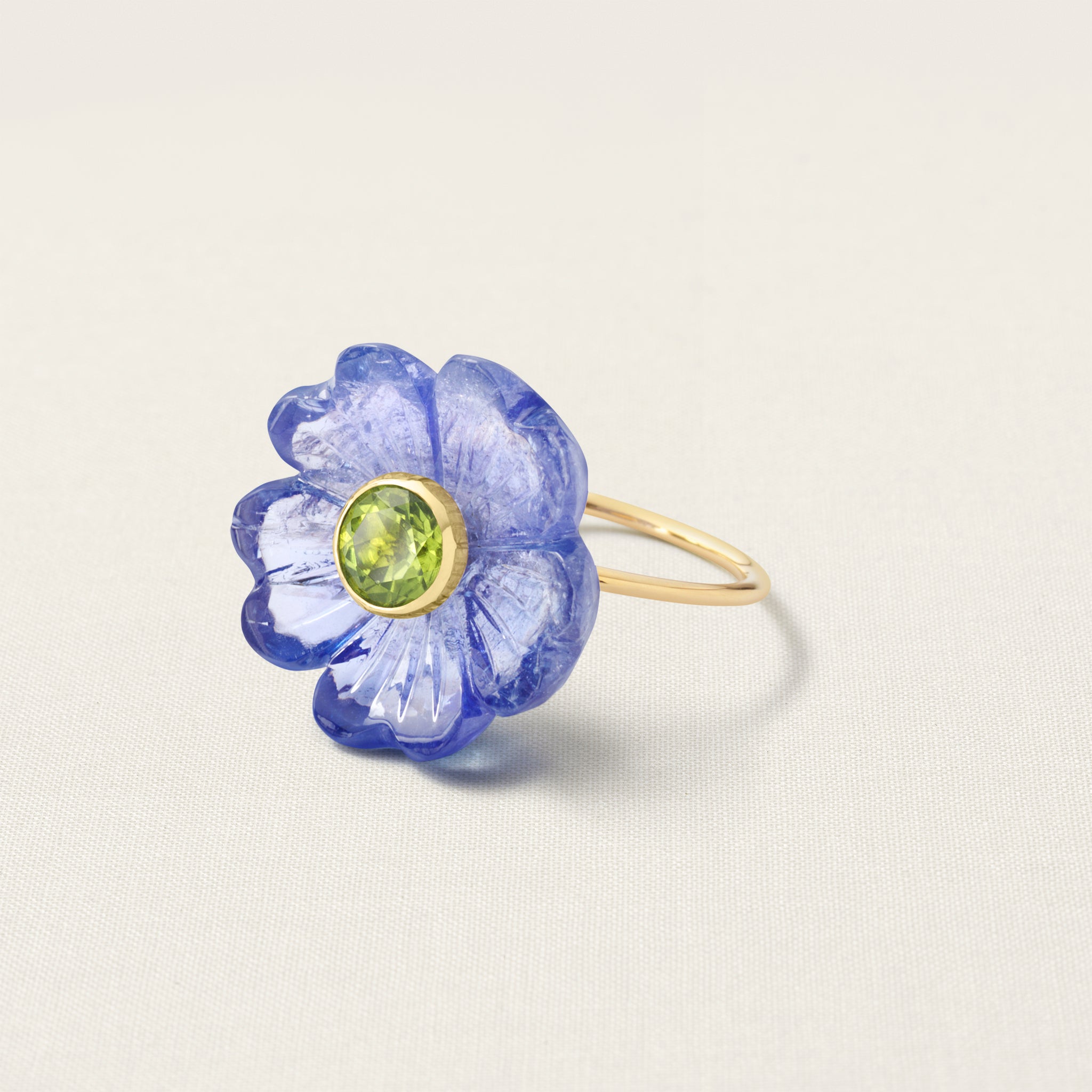 The flower on this iconic Sophie Joanne ring is hand-carved from tanzanite by an expert artisan, using an age-old, wood-carving technique. Tanzanite is a gemstone known for its transformative qualities, promoting inner serenity, breaking through old patterns, and enhancing psychic abilities and heightened consciousness. The tanzanite carving is very special and a lot more valuable then other stones that we carve.