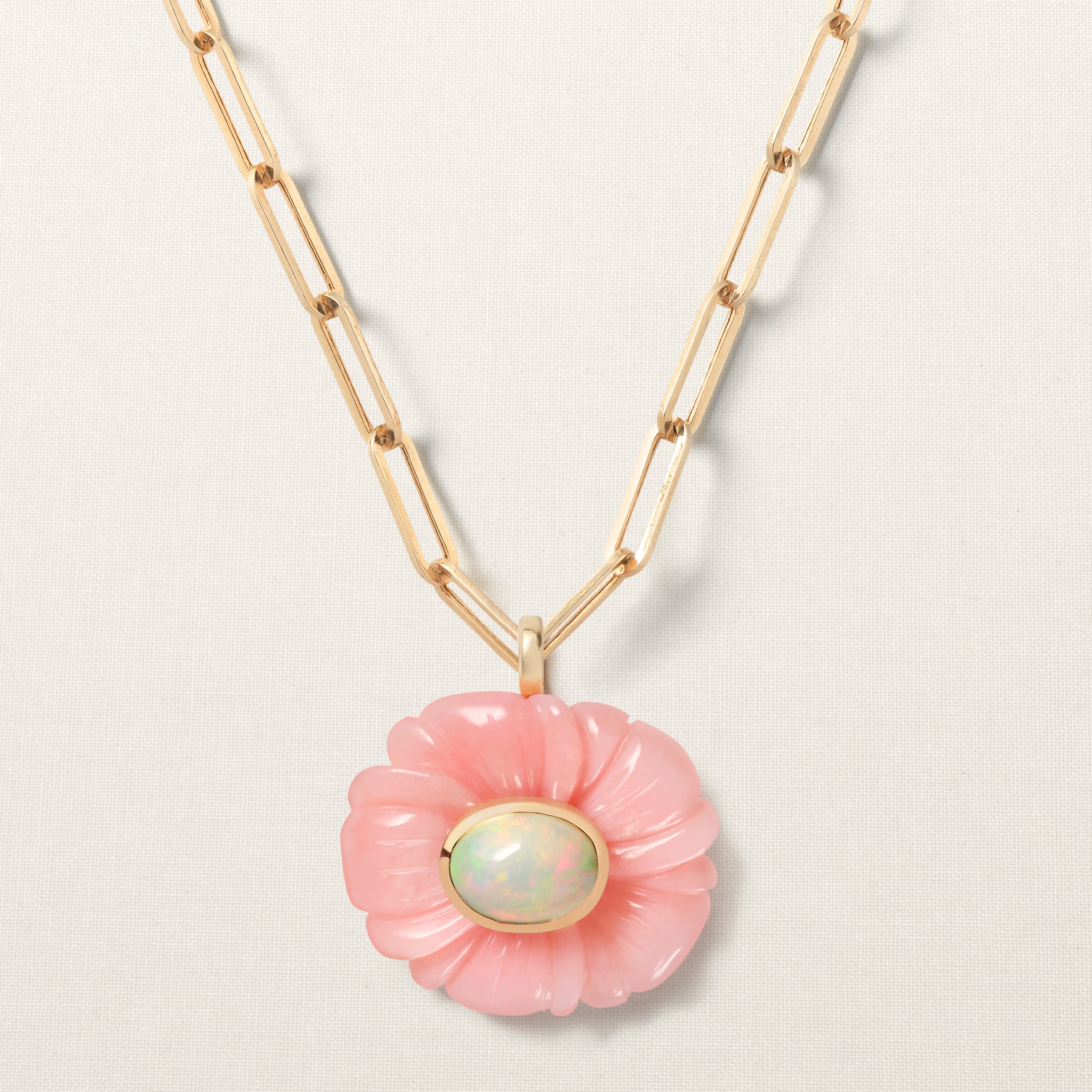 Inspired by the flowers of the Hortus Botanicus, a sanctuary garden in Amsterdam. The Garden Flower is hand-carved in Italy from high-quality pink opal. This pendant is set with a cabochon-cut Ethiopian opal. Opal is believed to ground the emotional body and is excellent for alleviating worry and stress.