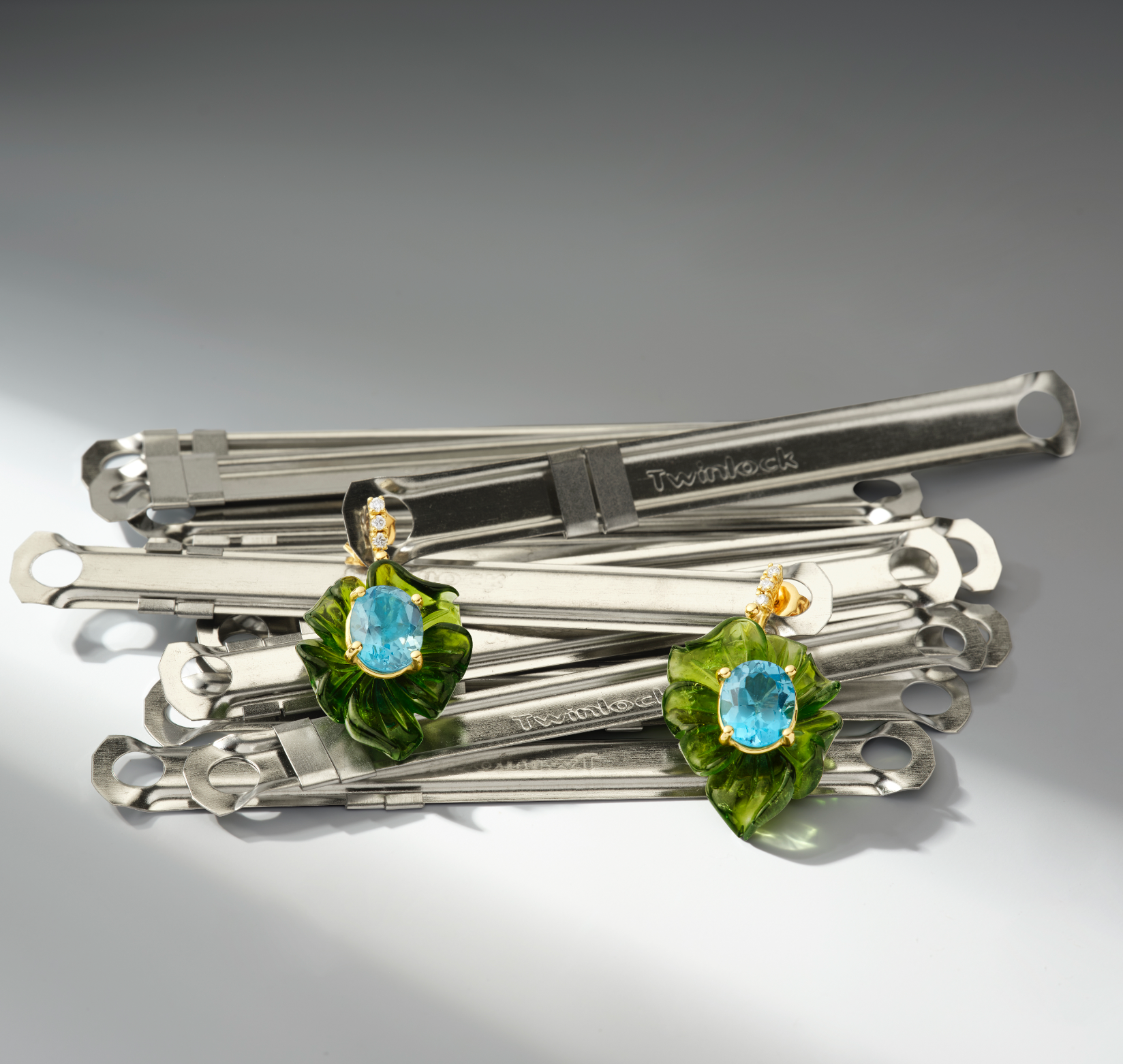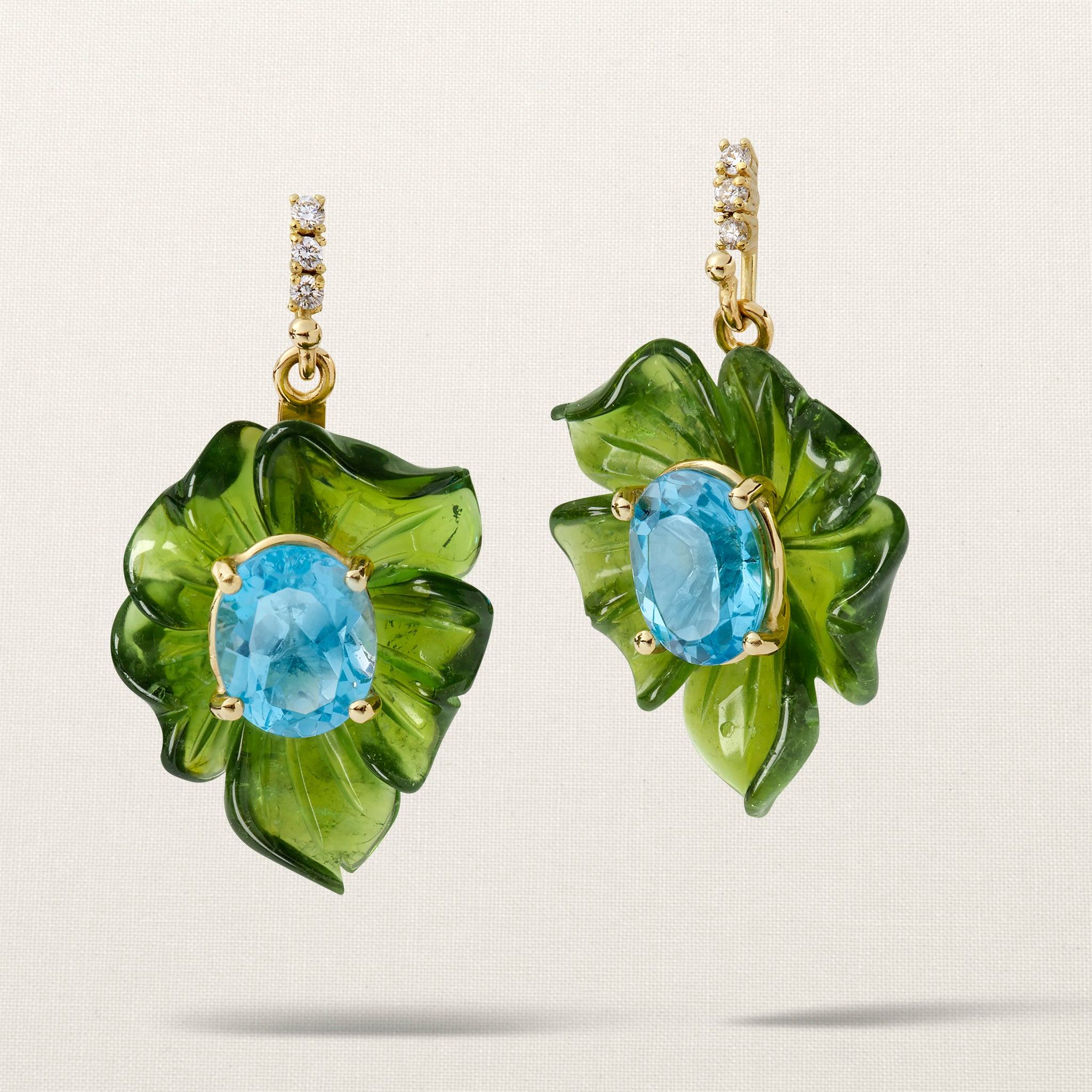 These leafs are hand-carved in Italy from high-quality green tourmaline and set with a brilliant-cut topaz. The leaf drop is adorned by diamonds.
