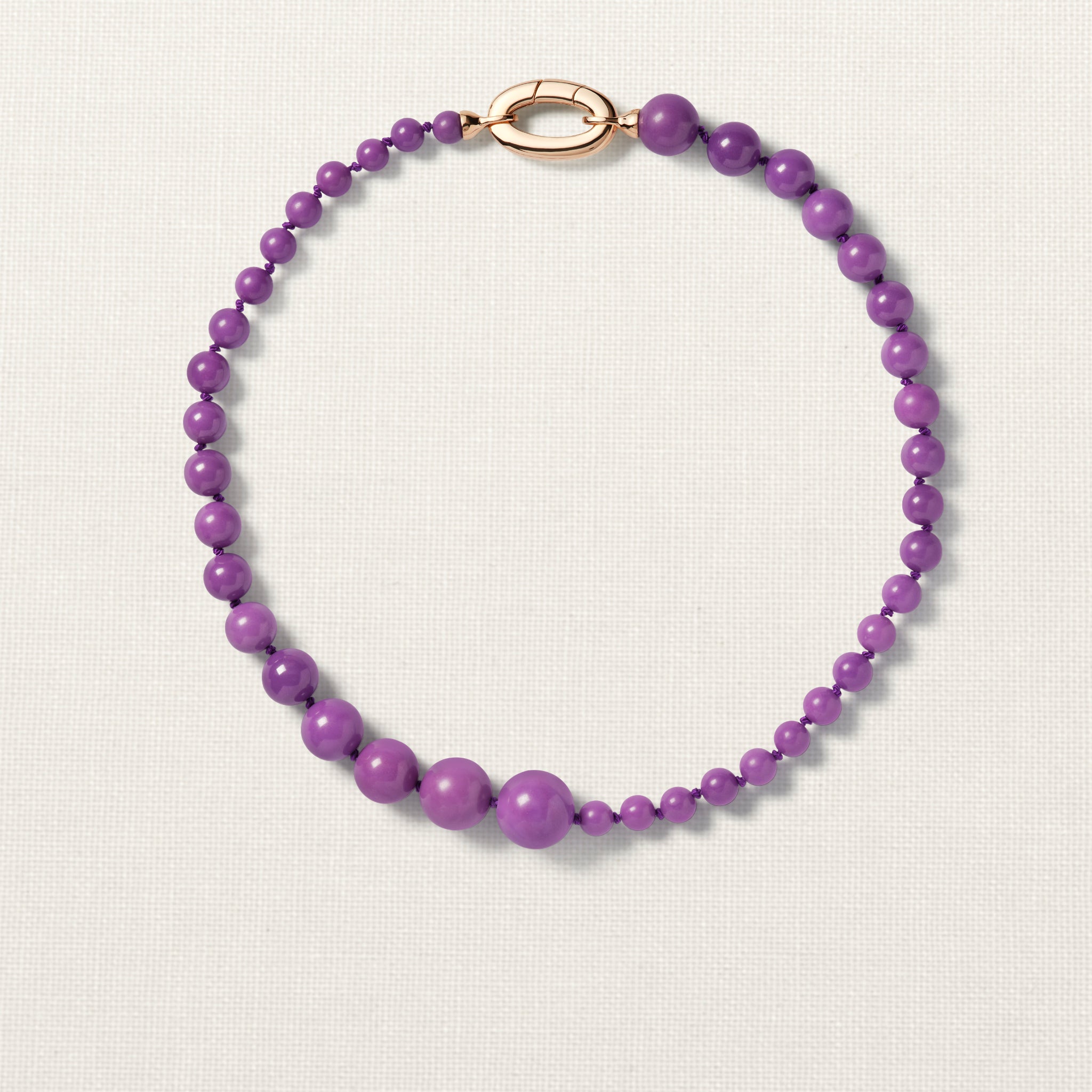 The Holiday Necklace is crafted from vibrant violet phosphorite beads, gently graduating in size to create a playful silhouette. Finished with a heavy oval clasp in 14k gold, it is designed to be worn in multiple ways — with the clasp at the front as a bold focal point, or at the back for a more classic look. You can also personalize the piece by adding your favorite Sophie Joanne pendant. Perfect for layering with other necklaces or worn on its own as a statement piece.