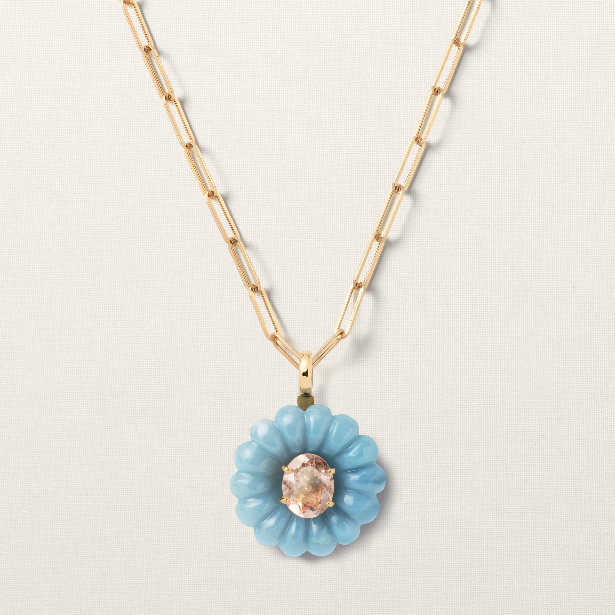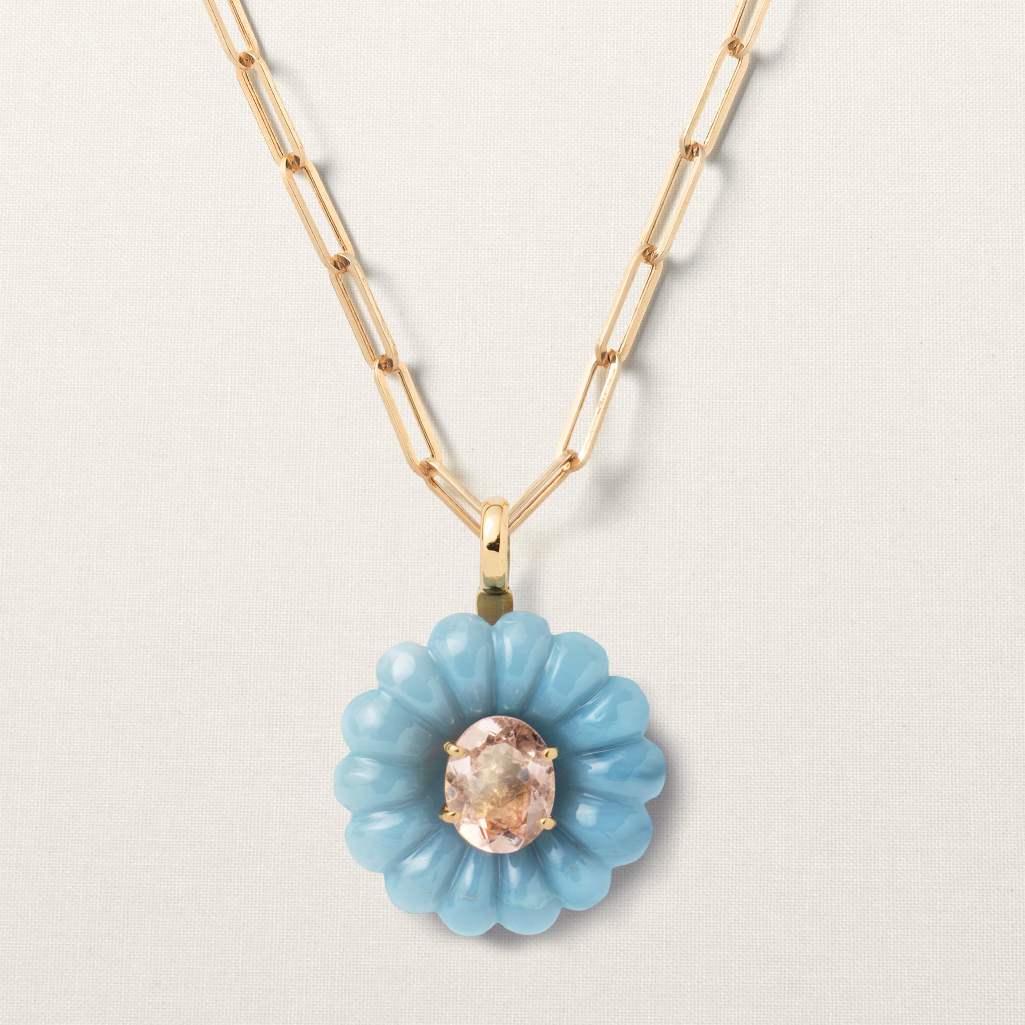 The flower is set with a large brilliant-cut morganite, which symbolizes grounding for the emotional body.