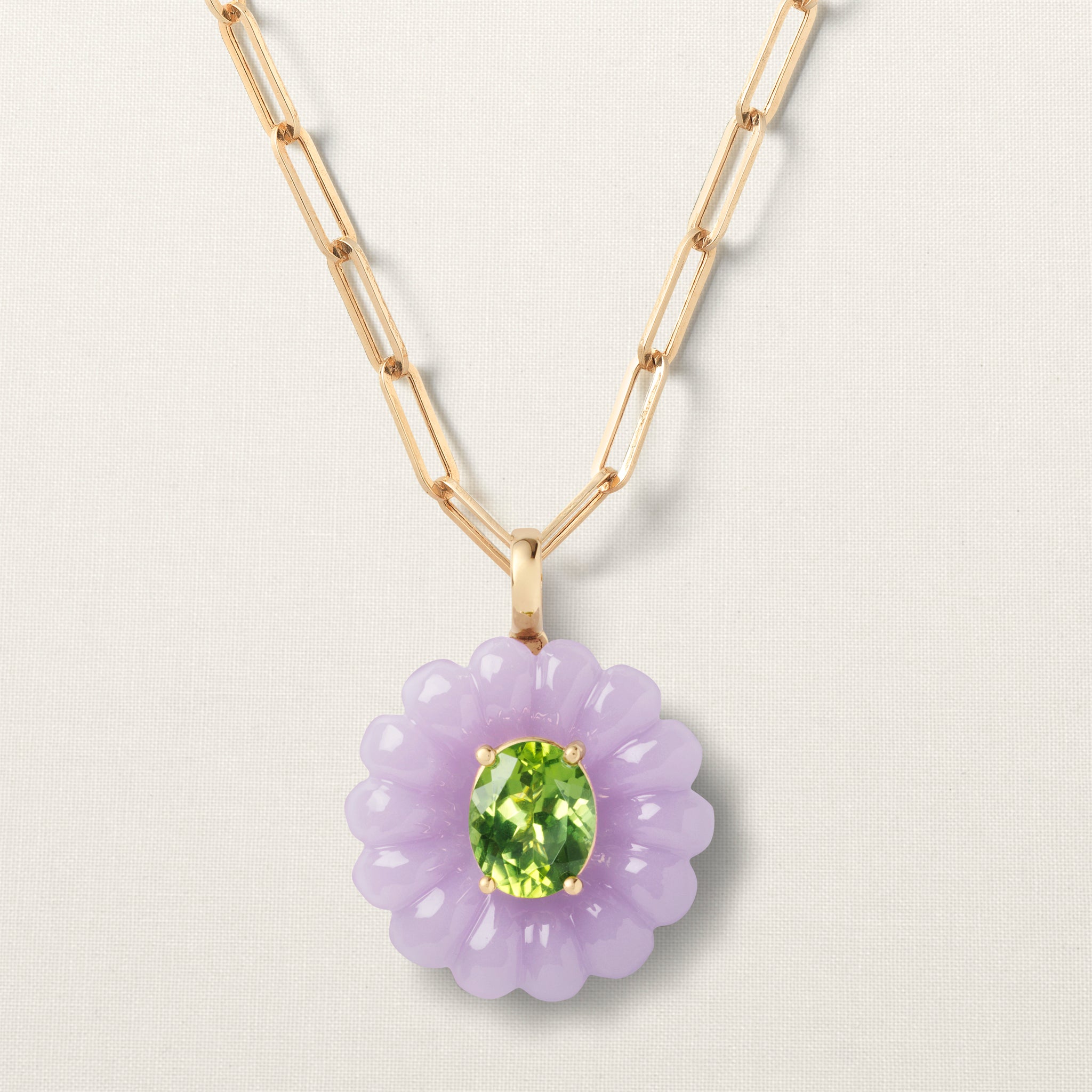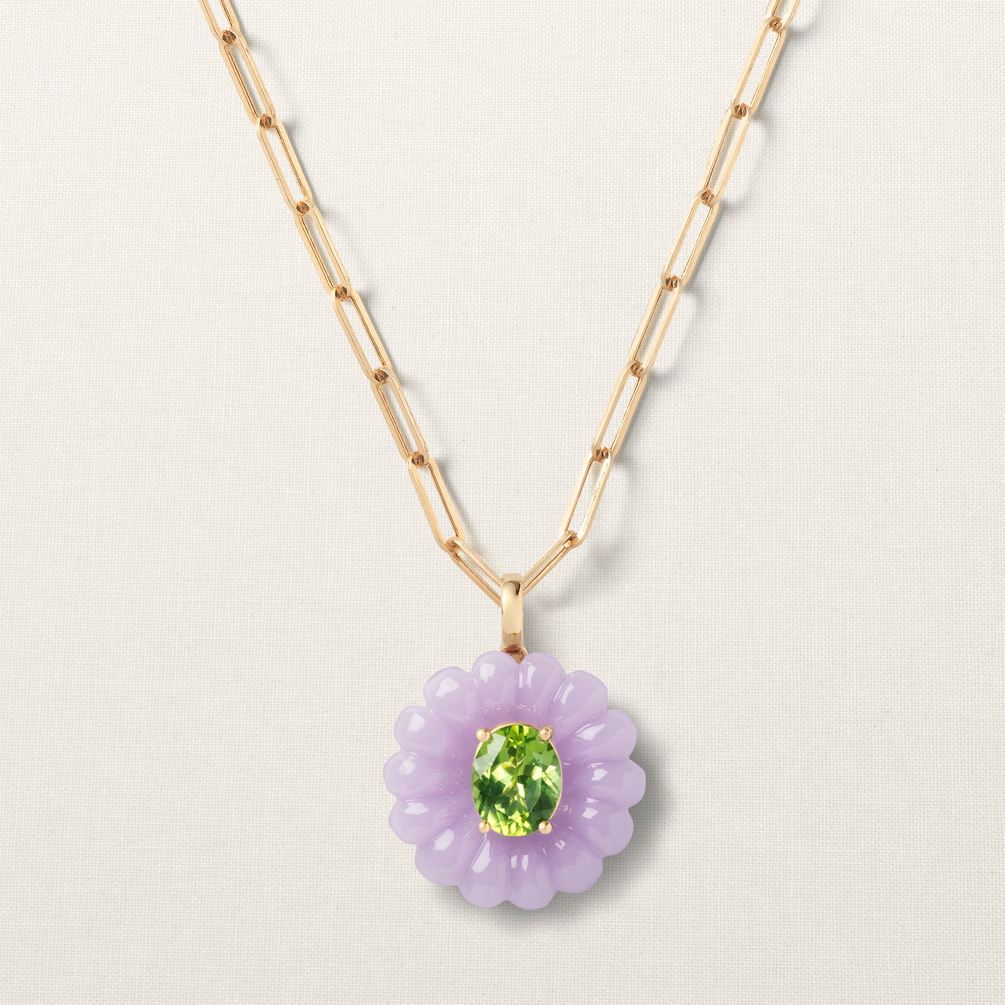 The flower is set with a large brilliant-cut peridot, which symbolizes joy, emotional healing, and love.