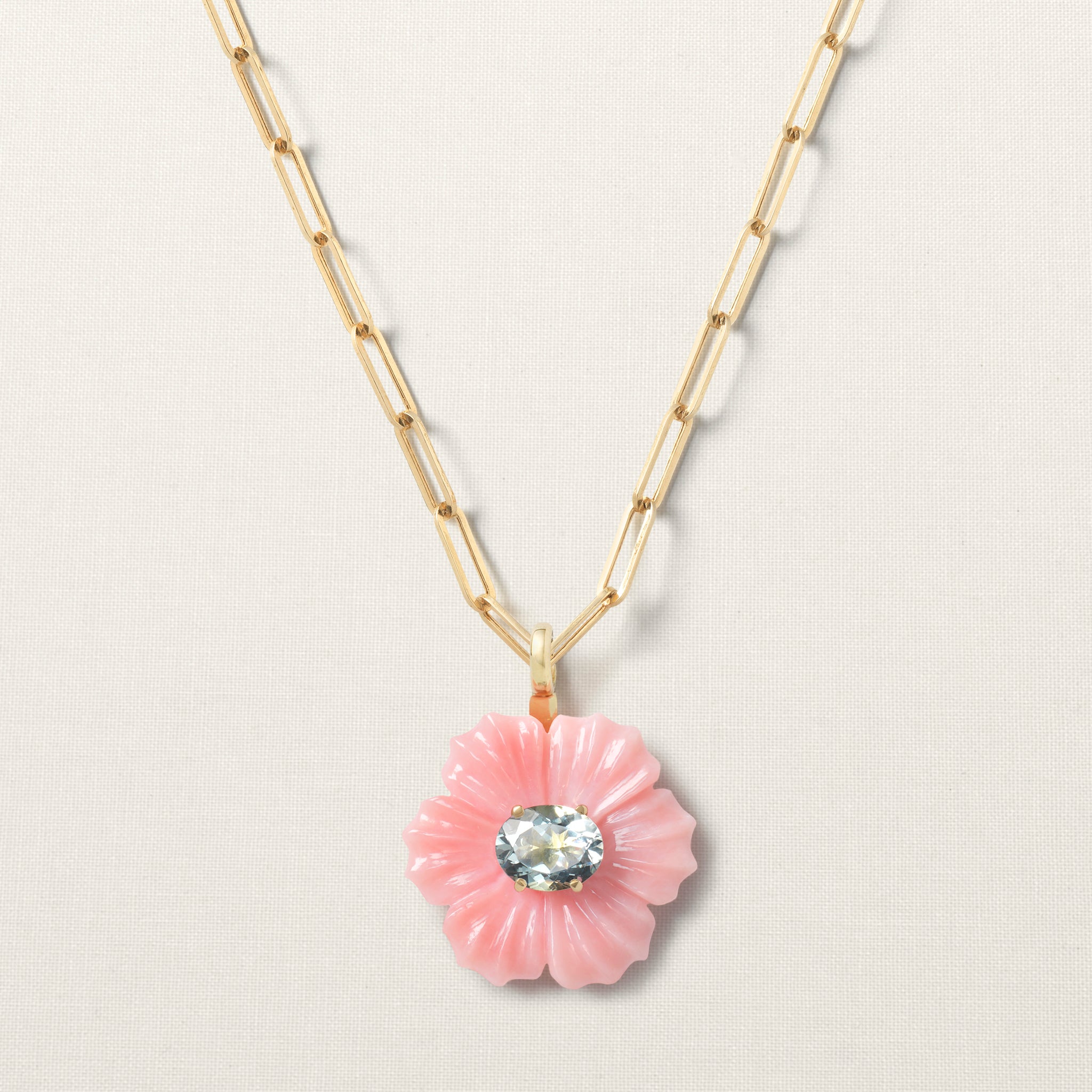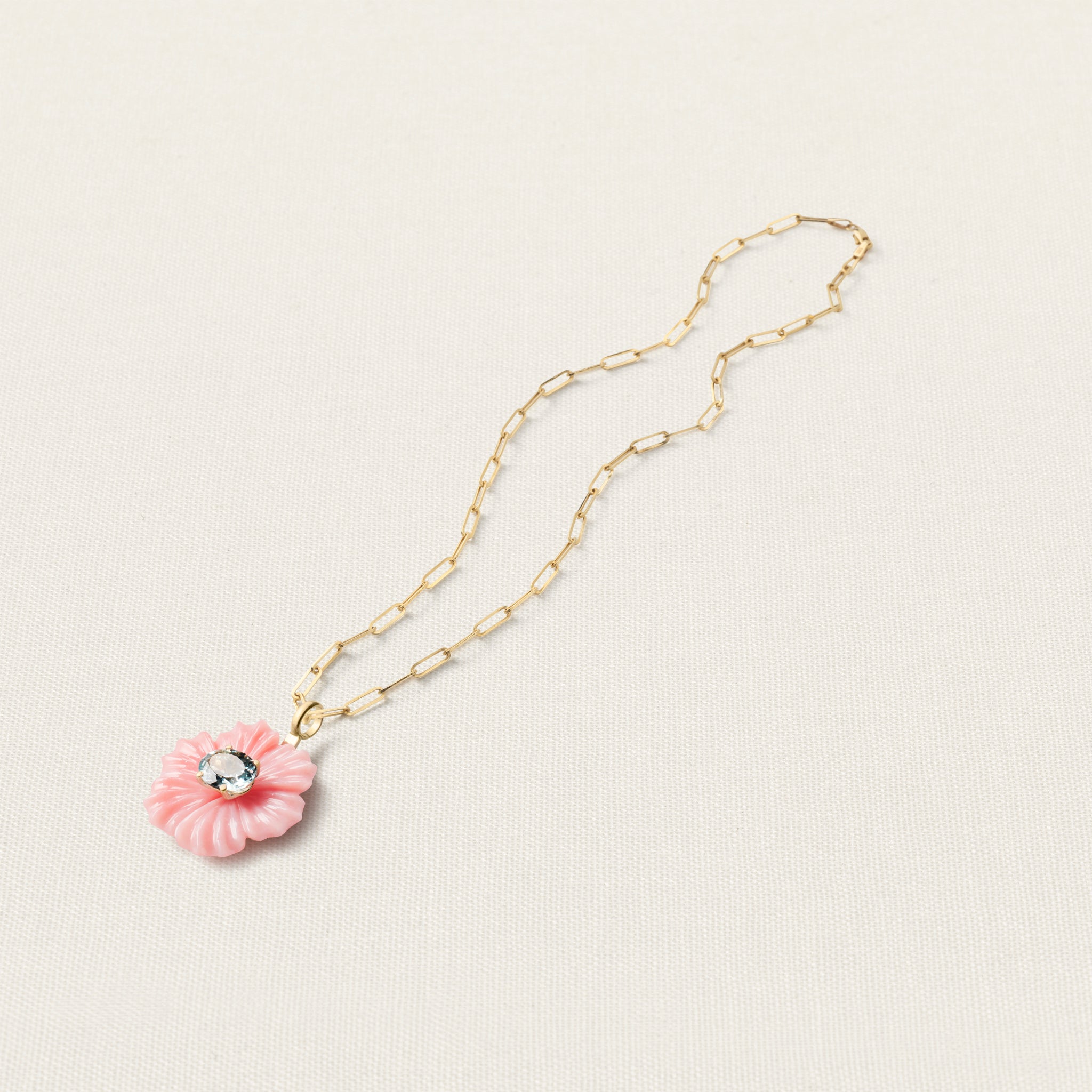 The Flower pendant is set with a brilliant-cut aquamarine. Aquamarine helps move towards closure, allowing space for peace and tranquillity.