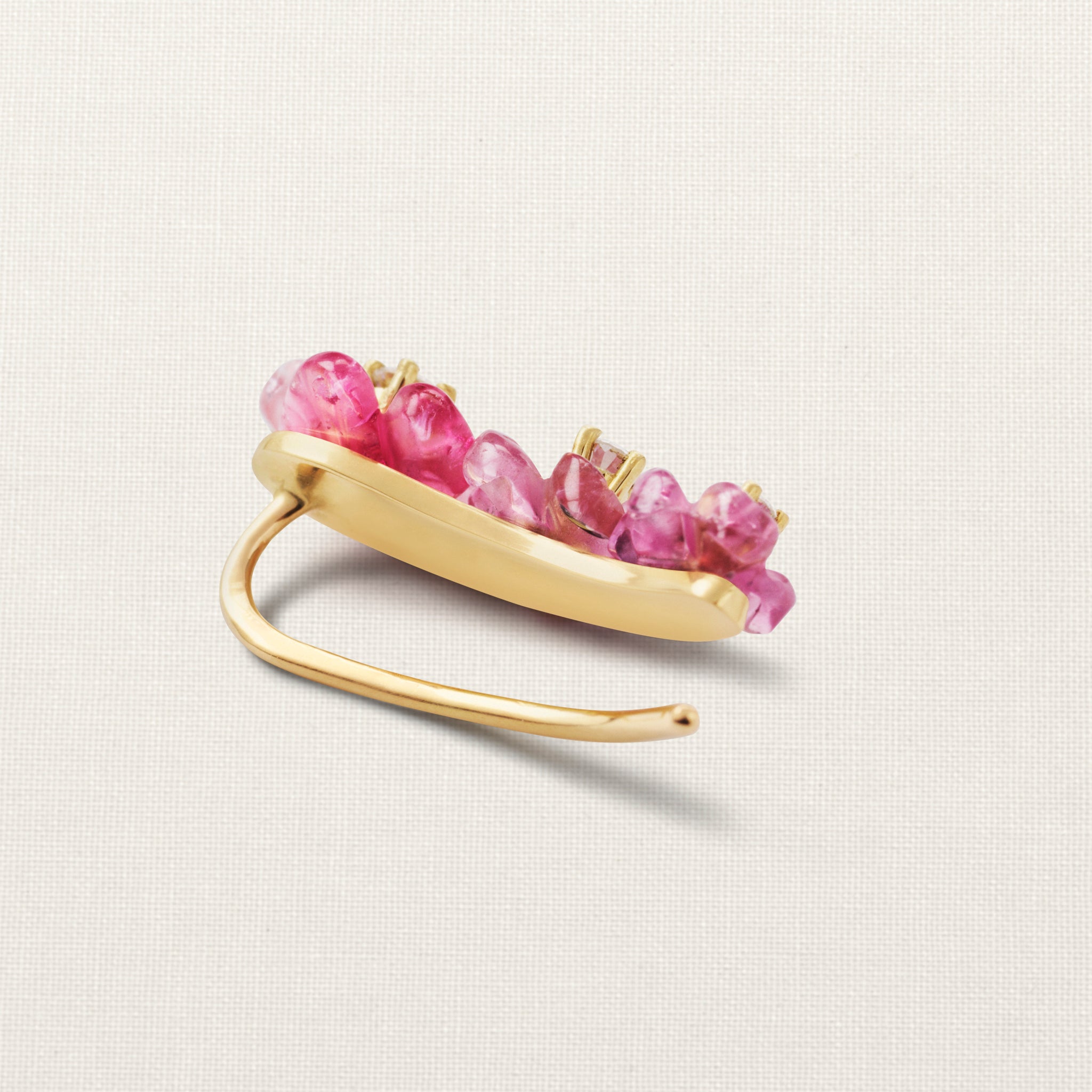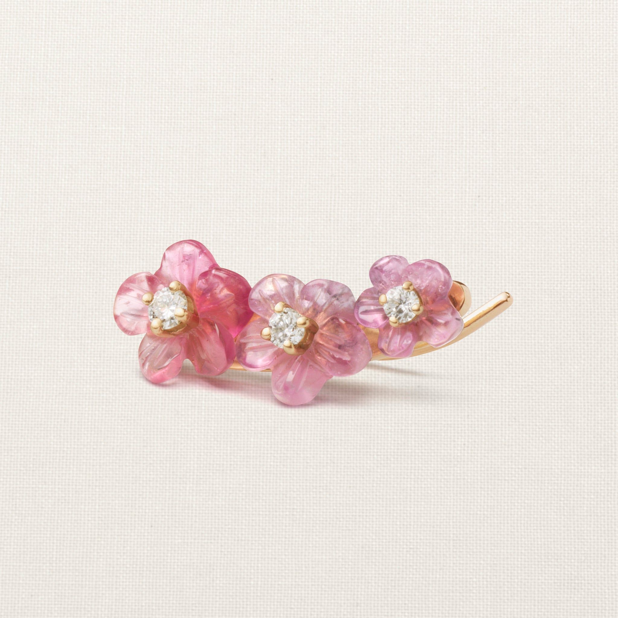 The Island Flower Garden Ear Climber is a single earring, with a crescent of pink tourmaline flowers paired with Top Wesselton VVS diamonds, that hug the curve of the ear. The earring can be worn as a single stud or as a pair.