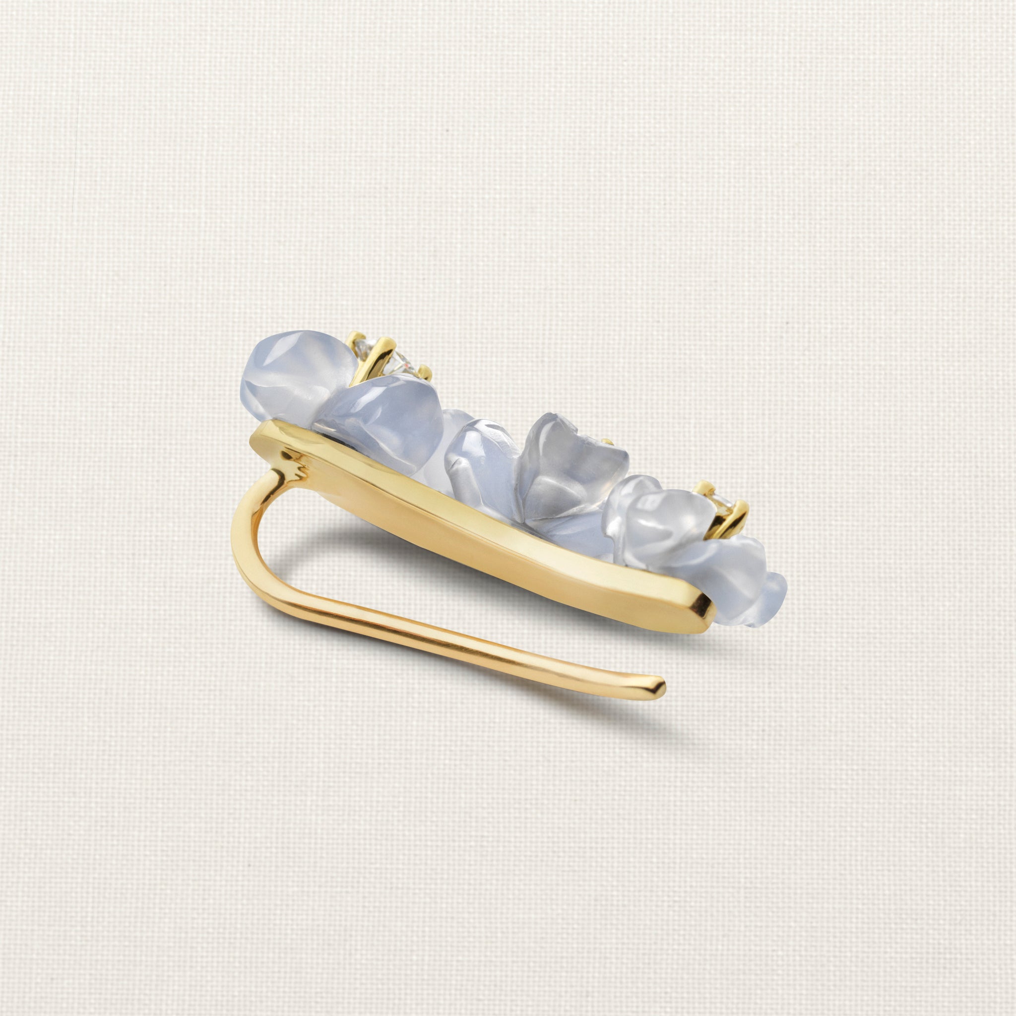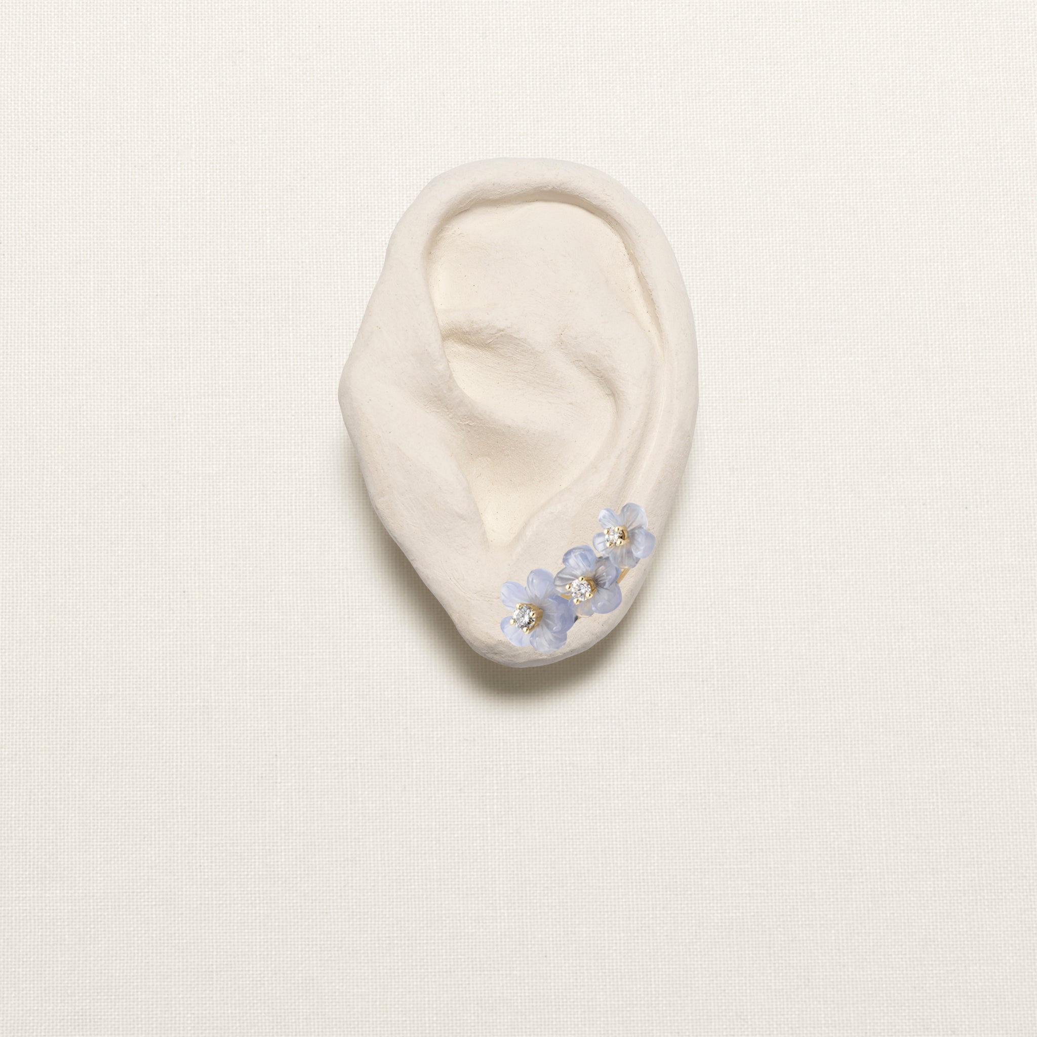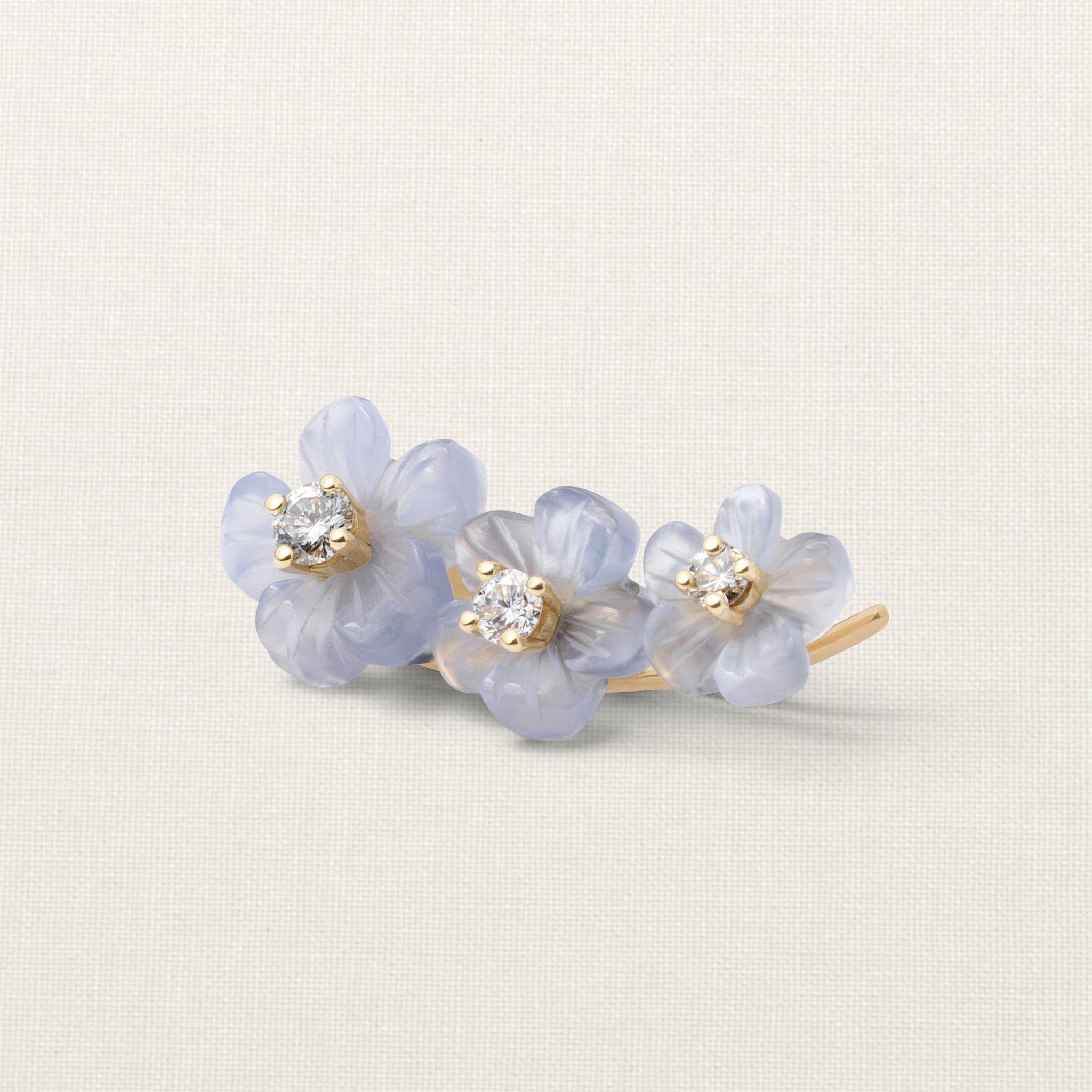 The Island Flower Garden Ear Climber is a single earring, with a crescent of chalcedony flowers paired with Top Wesselton VVS diamonds, that hug the curve of the ear. The earring can be worn as a single stud or as a pair.