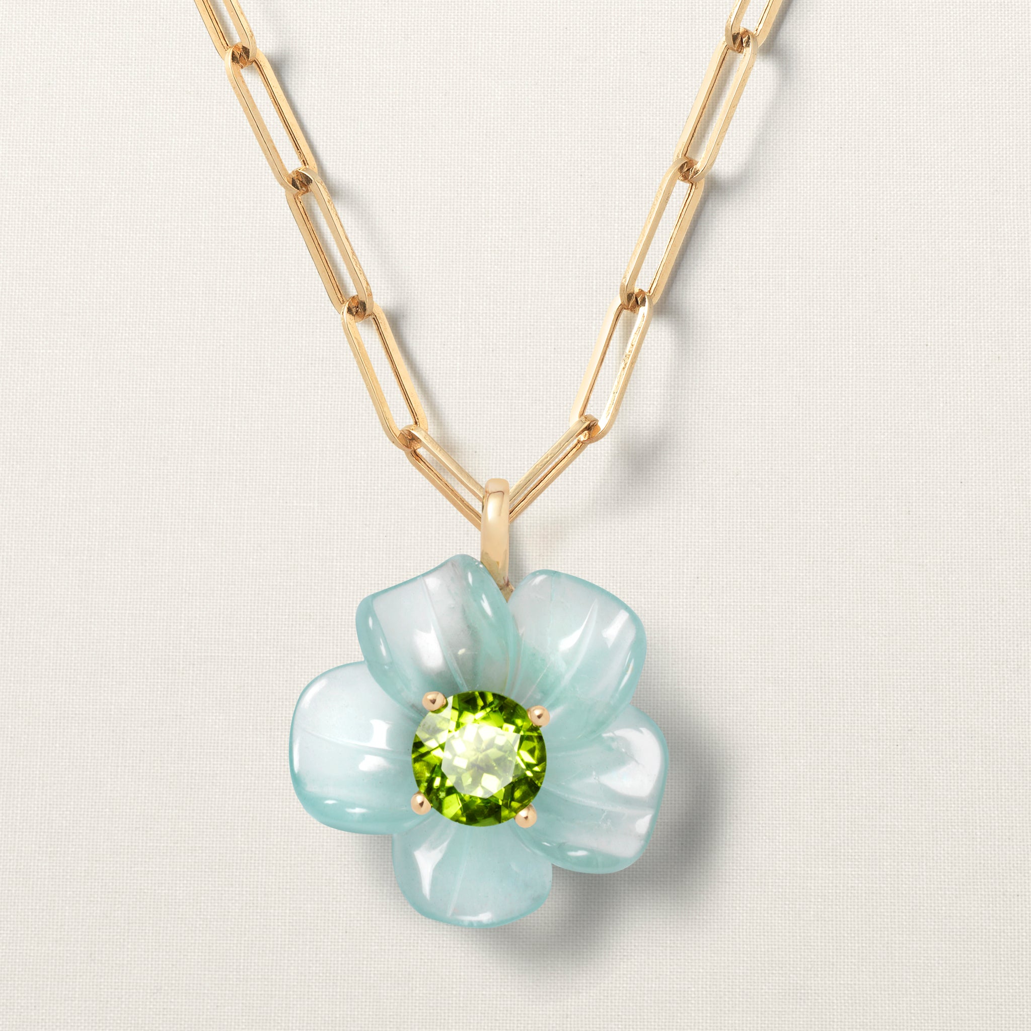 The flower pendant is set with a brilliant-cut peridot, which symbolizes positive energy, joy, and happiness.