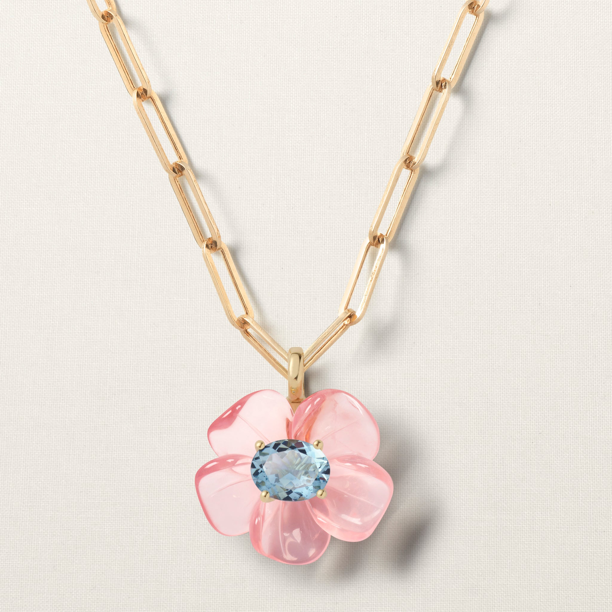 This pendant is set with a brilliant-cut aquamarine. Aquamarine helps move towards closure, allowing space for peace and tranquillity.