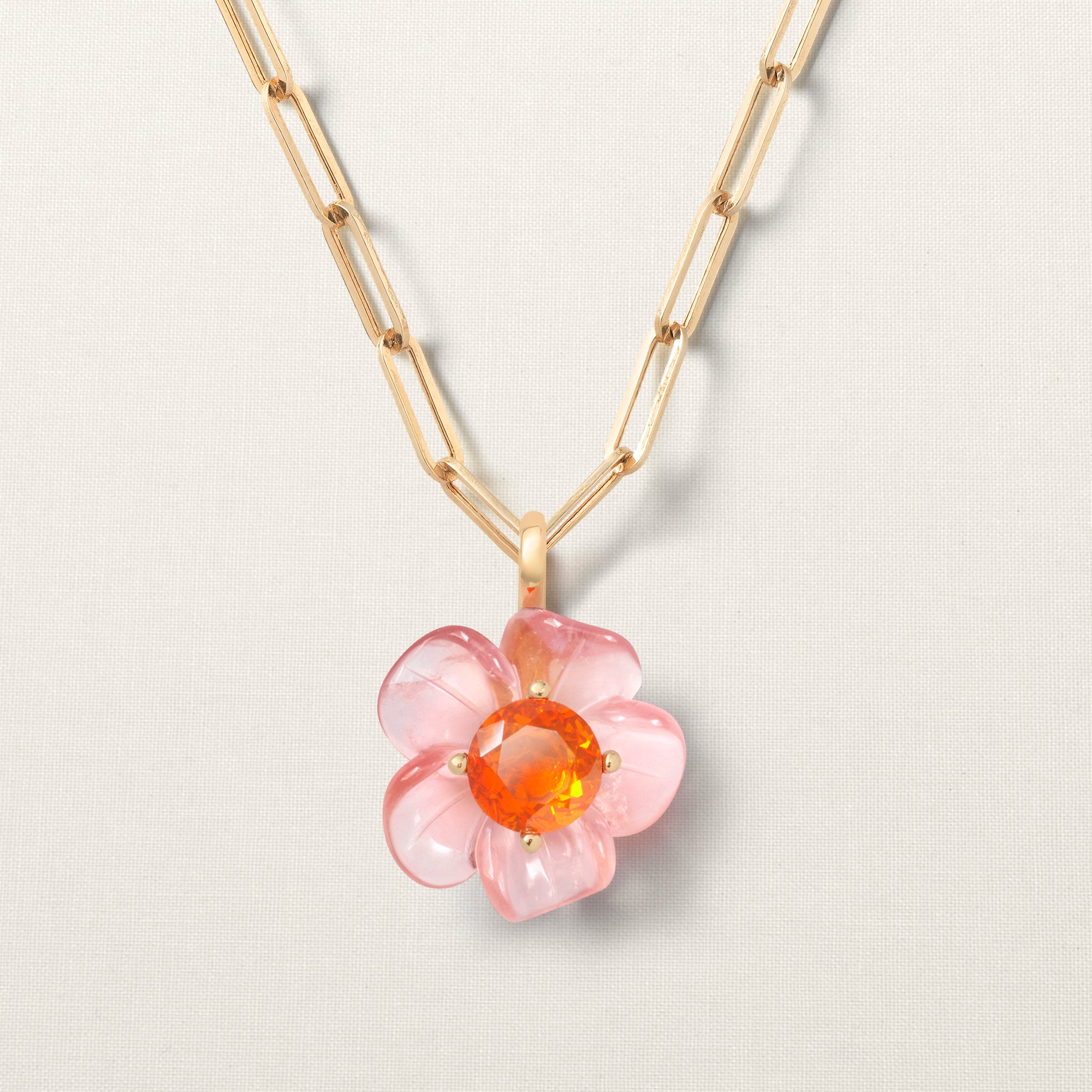 The pendant is set with an orange fire opal, which symbolizes the awakening of passion and creativity.