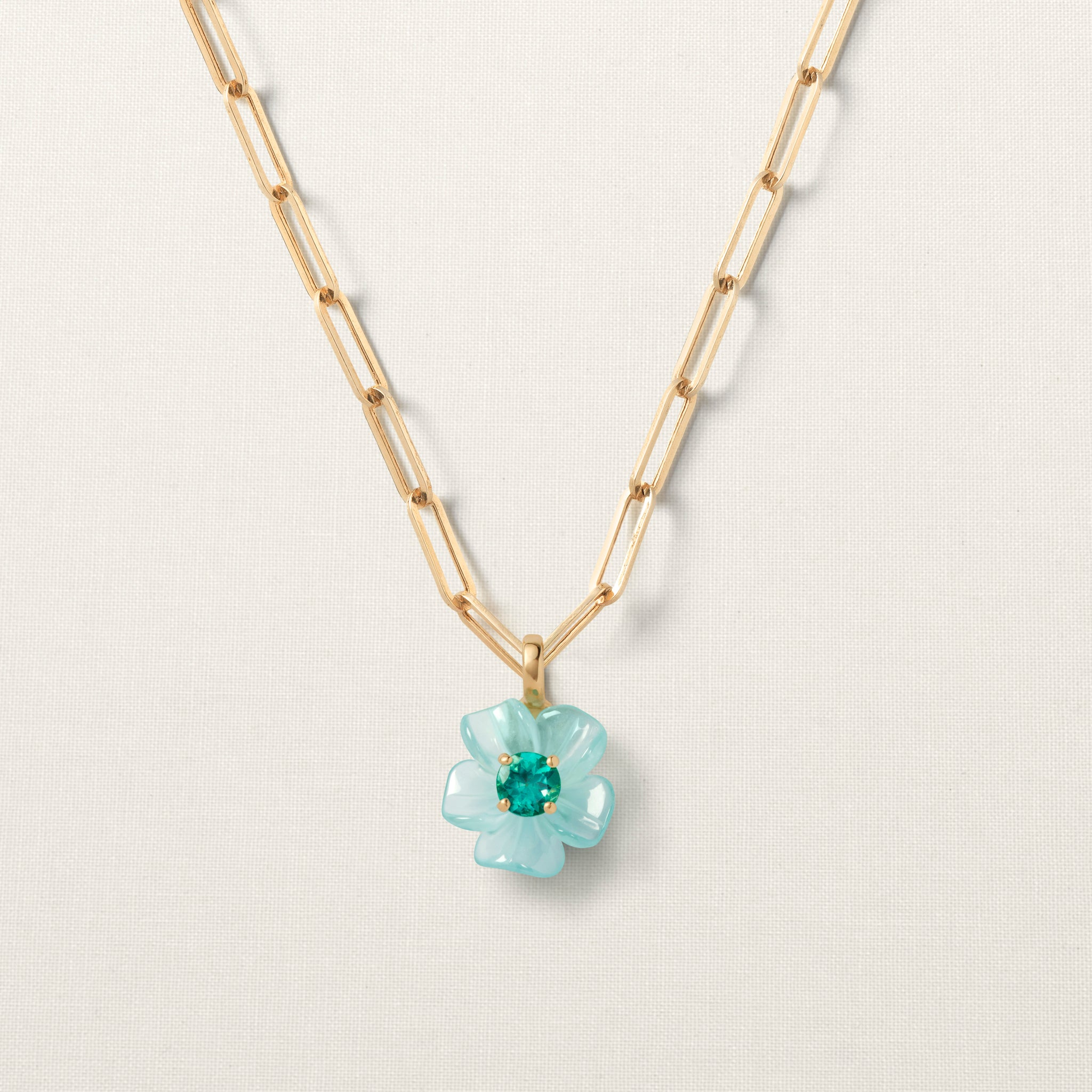 The shape of our Island Flower pendant is inspired by Andy Warhol's iconic 1964 flower series. Hand-carved in Germany from high-quality aquamarine. Aquamarine helps move towards closure, allowing space for peace and tranquillity. The pendant is set with a brilliant-cut apatite. Wearing apatite will enhance focus, clarity, concentration, intellect, acceptance, and unconditional love.