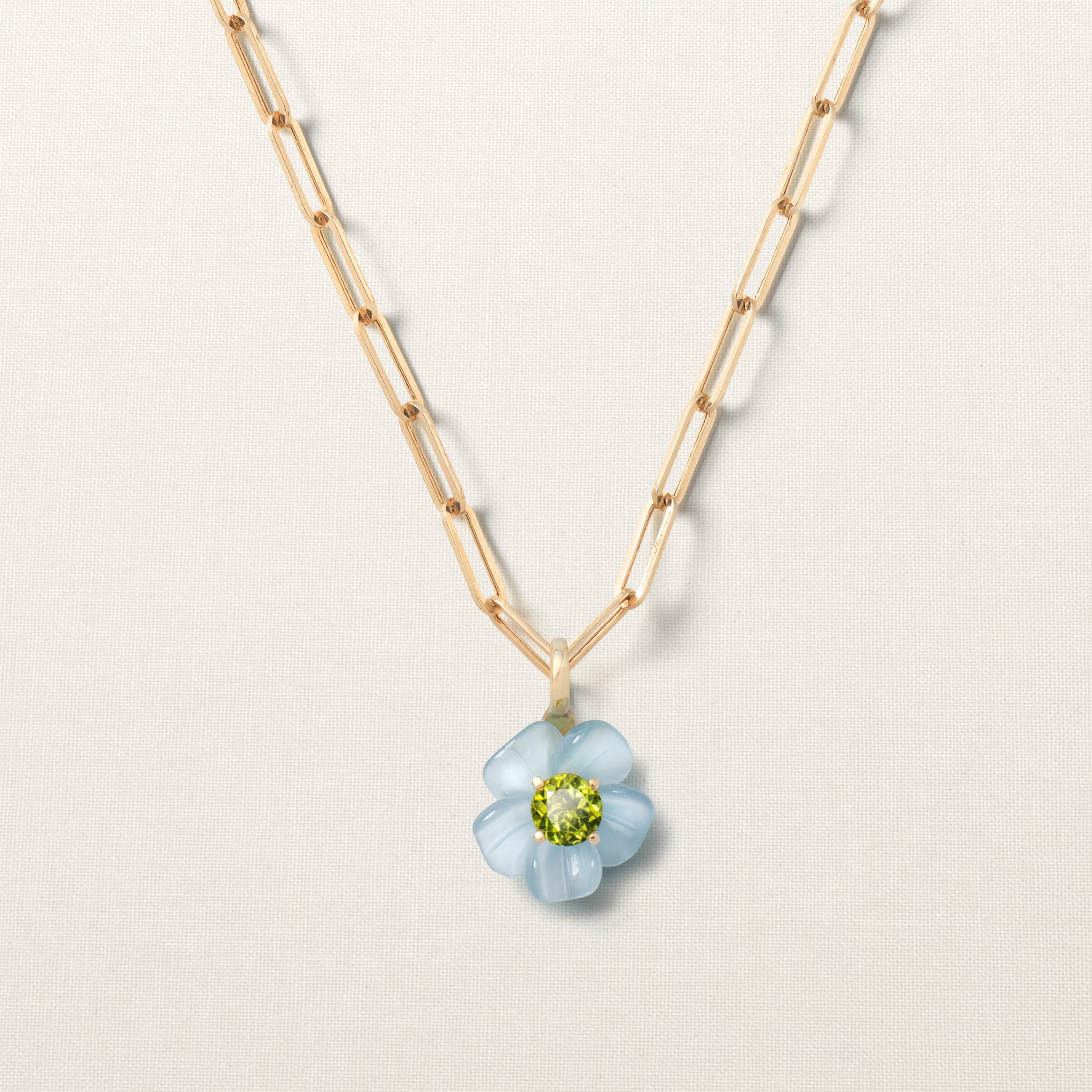 The pendant is set with a brilliant-cut peridot, which symbolizes positive energy, joy, and happiness.