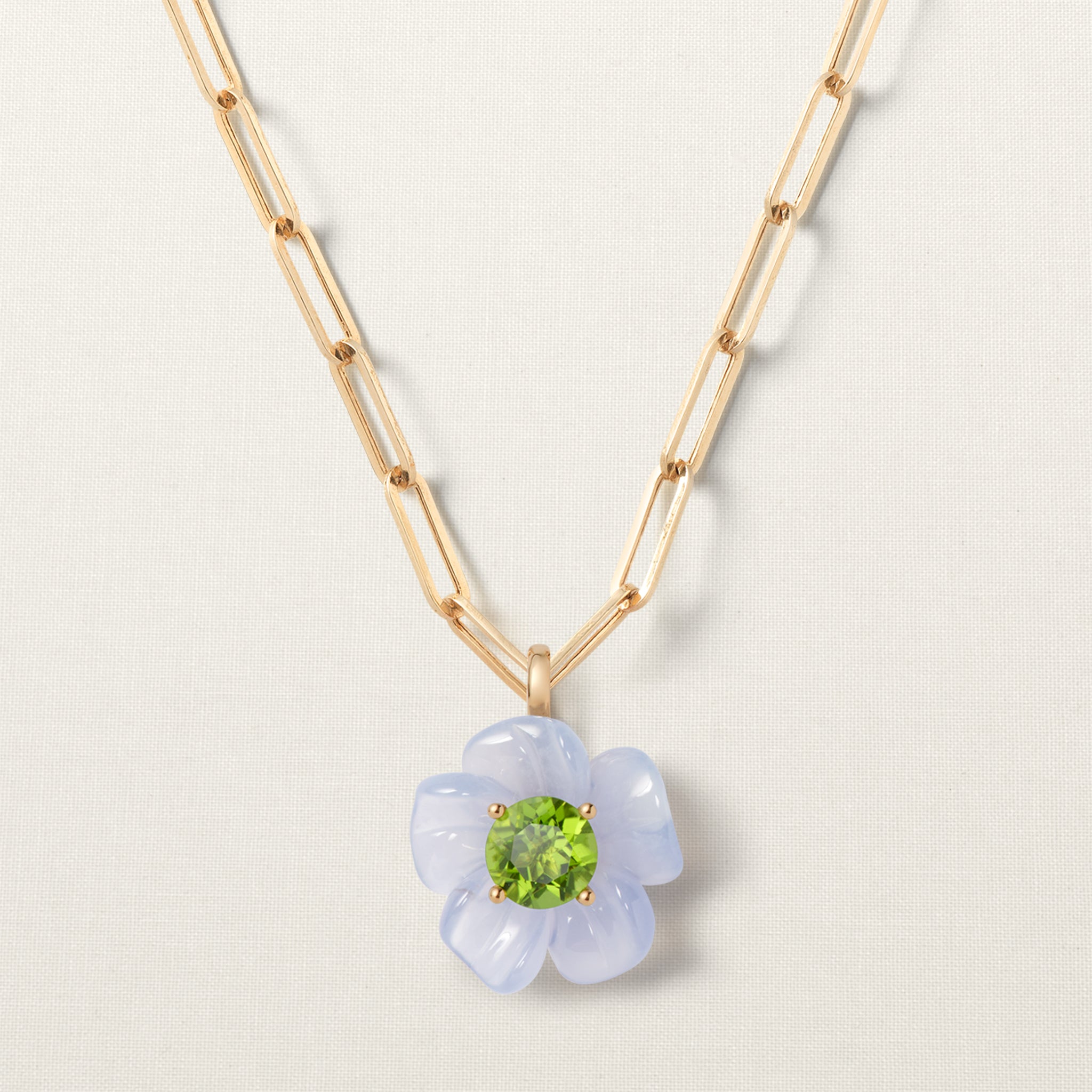 The Flower pendant is set with a brilliant-cut peridot. Peridot symbolizes positive energy, joy, and happiness.