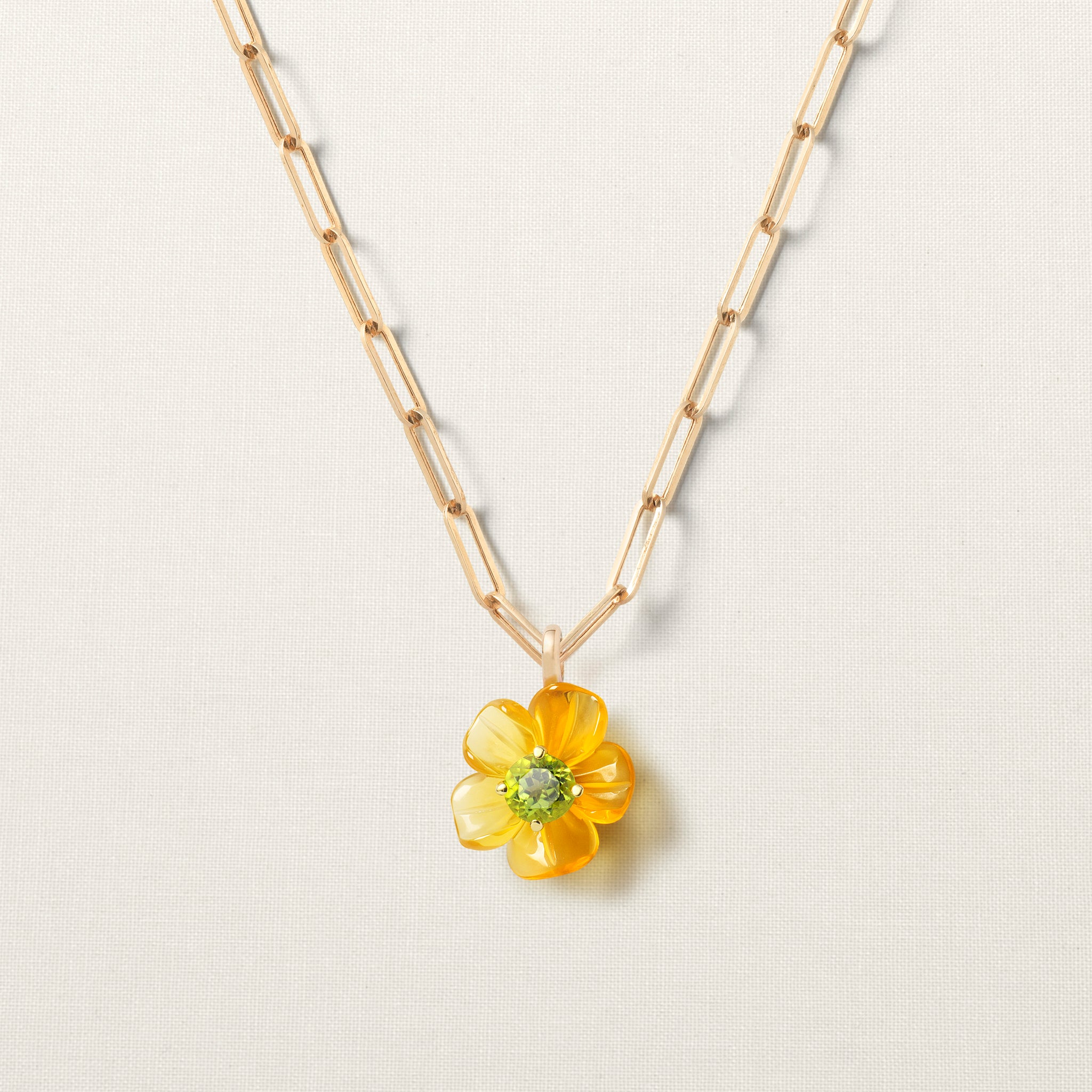 The pendant is set with a brilliant-cut peridot, which symbolizes positive energy, joy, and happiness.