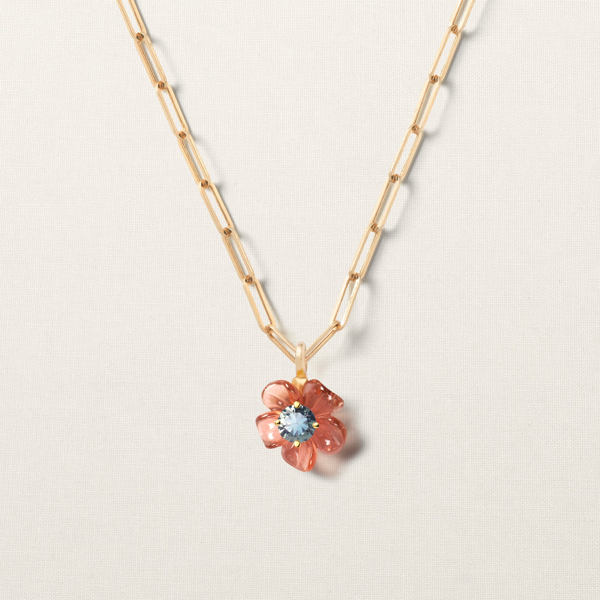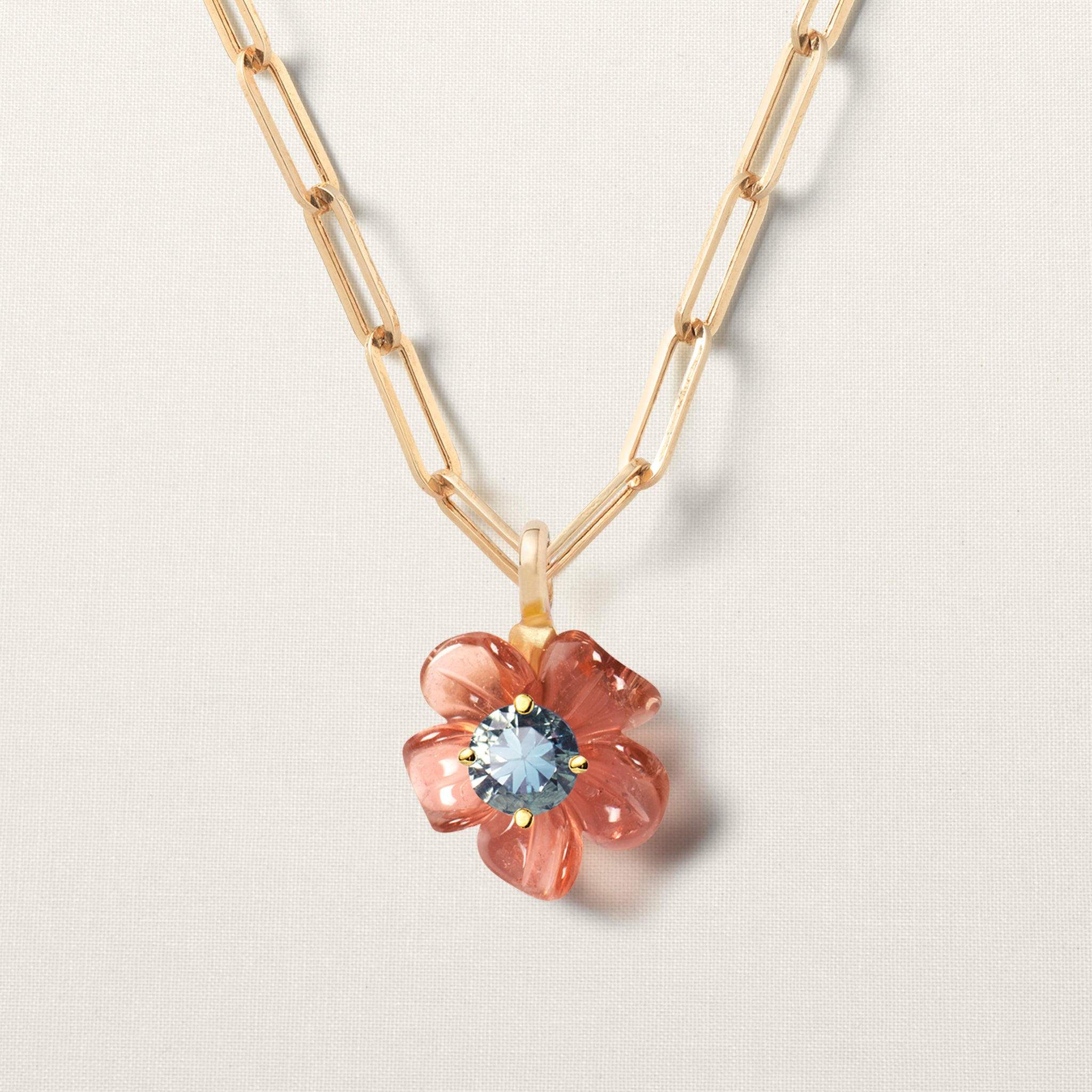 The Flower pendant is set with a brilliant-cut aquamarine. Aquamarine helps move towards closure, allowing space for peace and tranquillity.