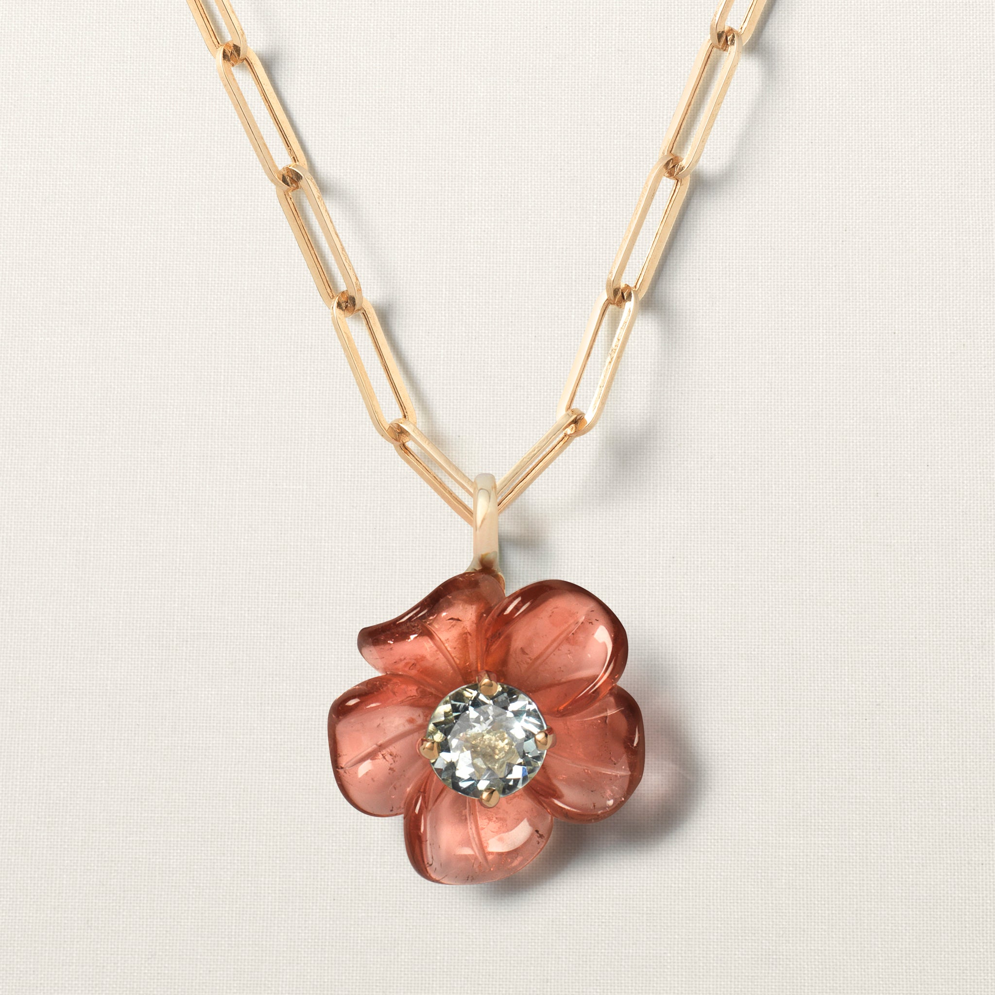 The Flower pendant is set with a brilliant-cut aquamarine. Aquamarine helps move towards closure, allowing space for peace and tranquillity.