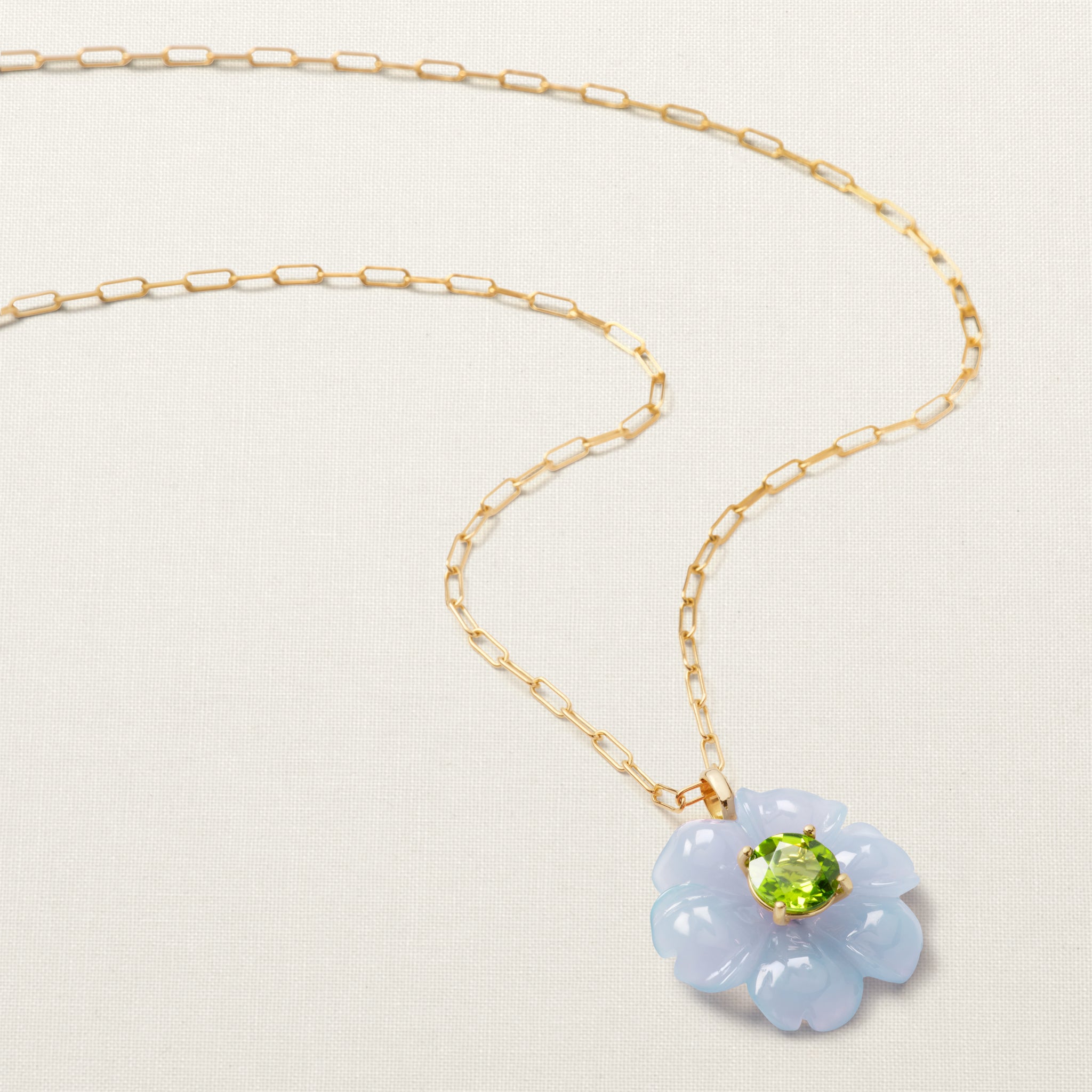 The Flower pendant is set with a brilliant-cut peridot. Peridot symbolizes positive energy, joy, and happiness.
