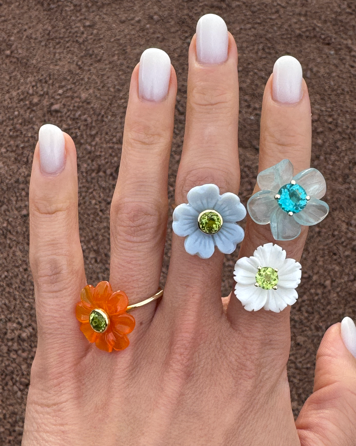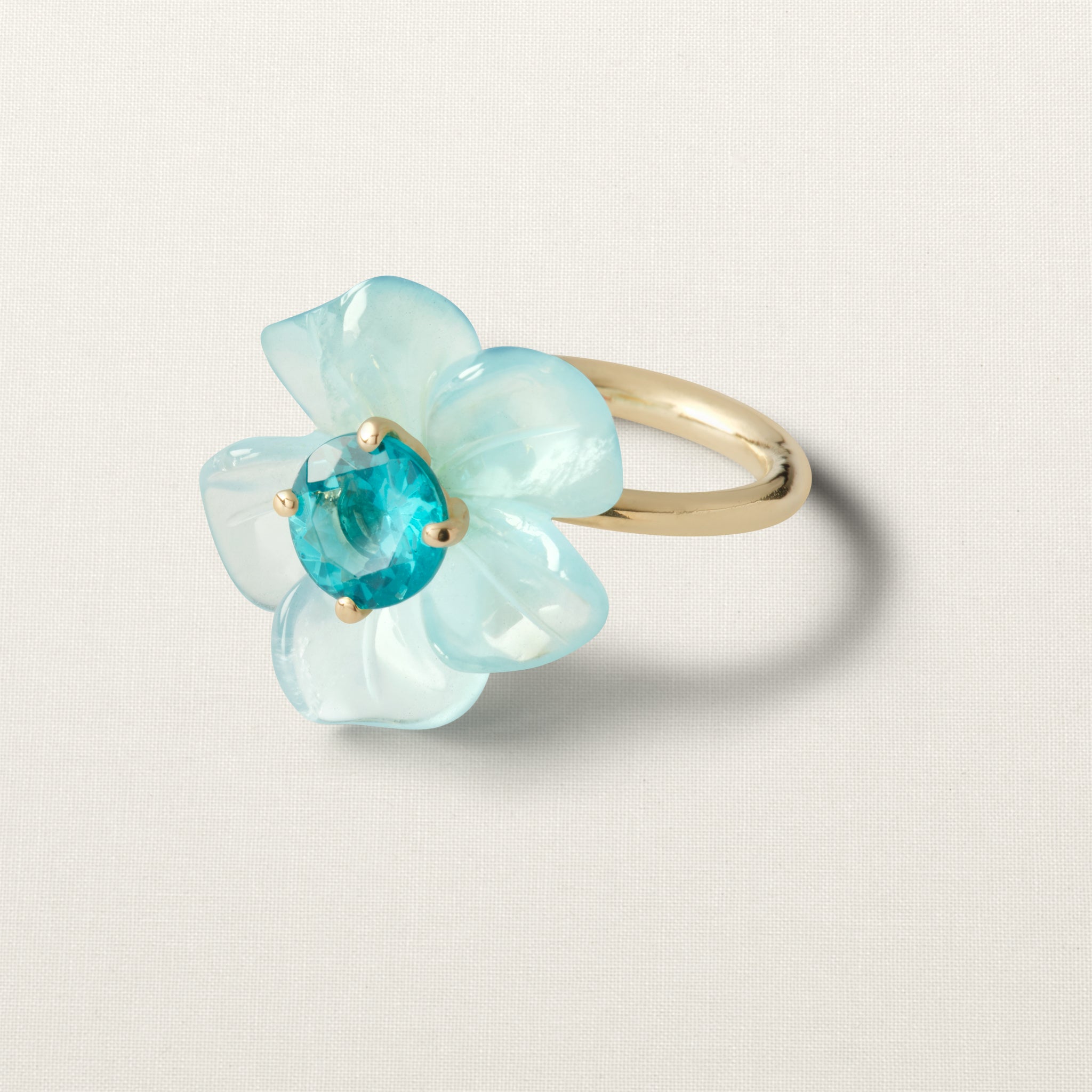 The shape of our Island Flower ring is inspired by Andy Warhol's iconic 1964 flower series. Hand-carved in Germany from high-quality Chalcedony, the Island Flower symbolizes calm and balance. Blue Chalcedony is known to enhance positivity, mindfulness, and clarity in communication. The ring is set with a brilliant-cut aqua-colored apatite, which promotes focus, intellect, acceptance, and unconditional love.