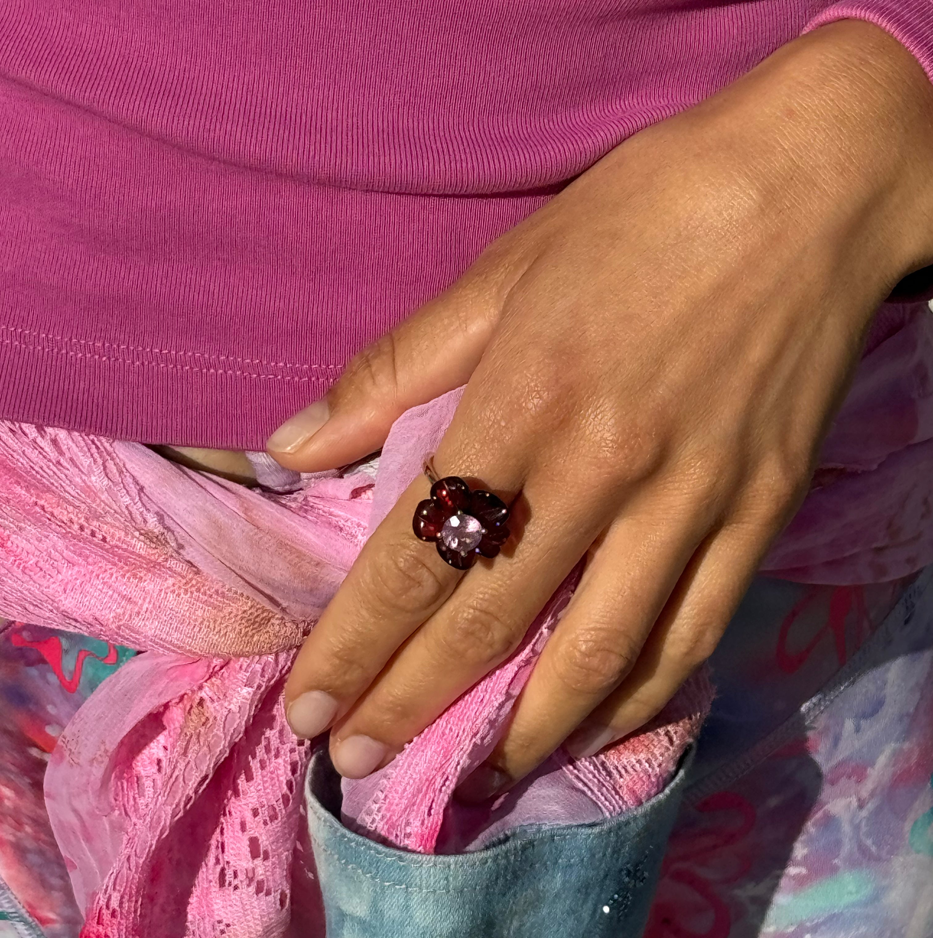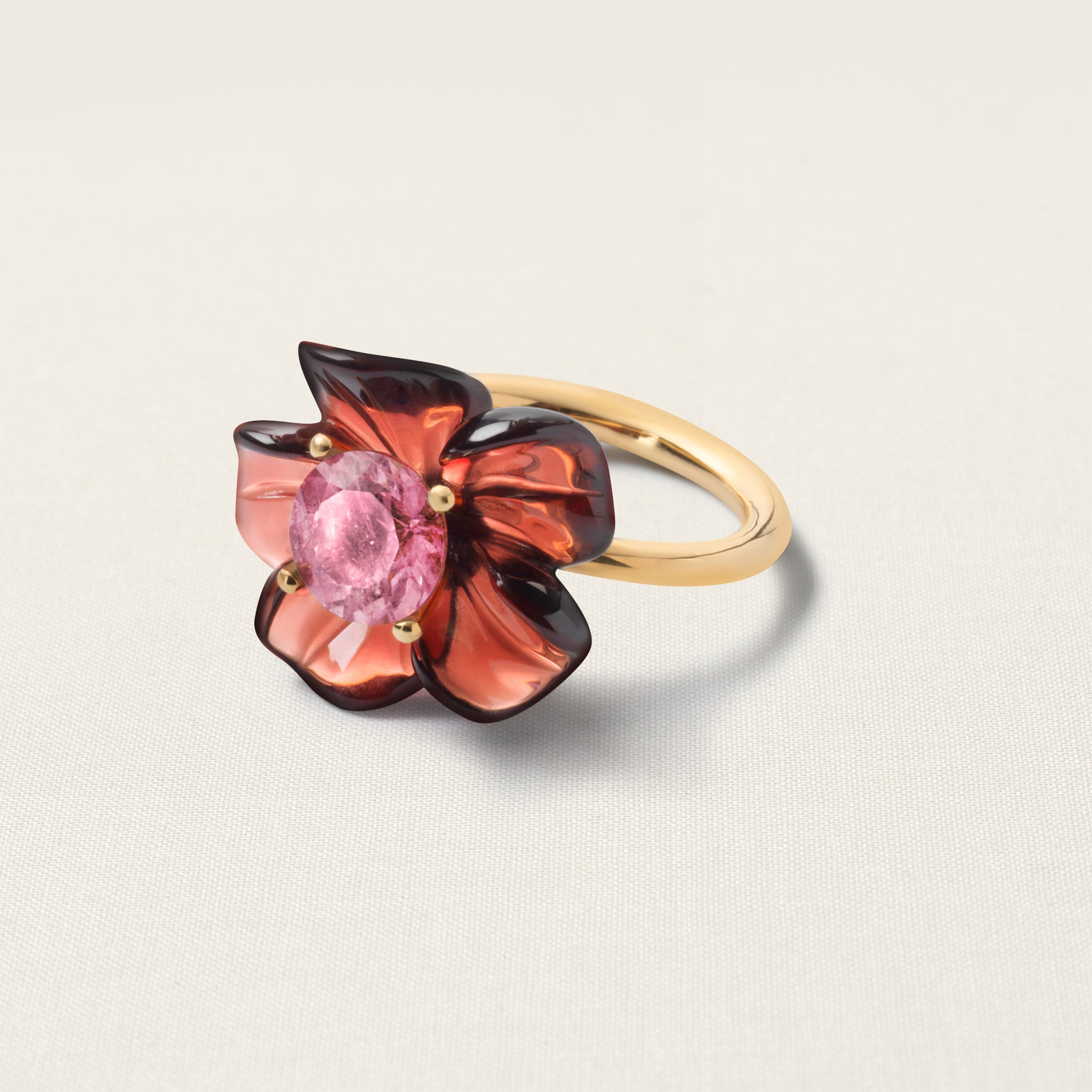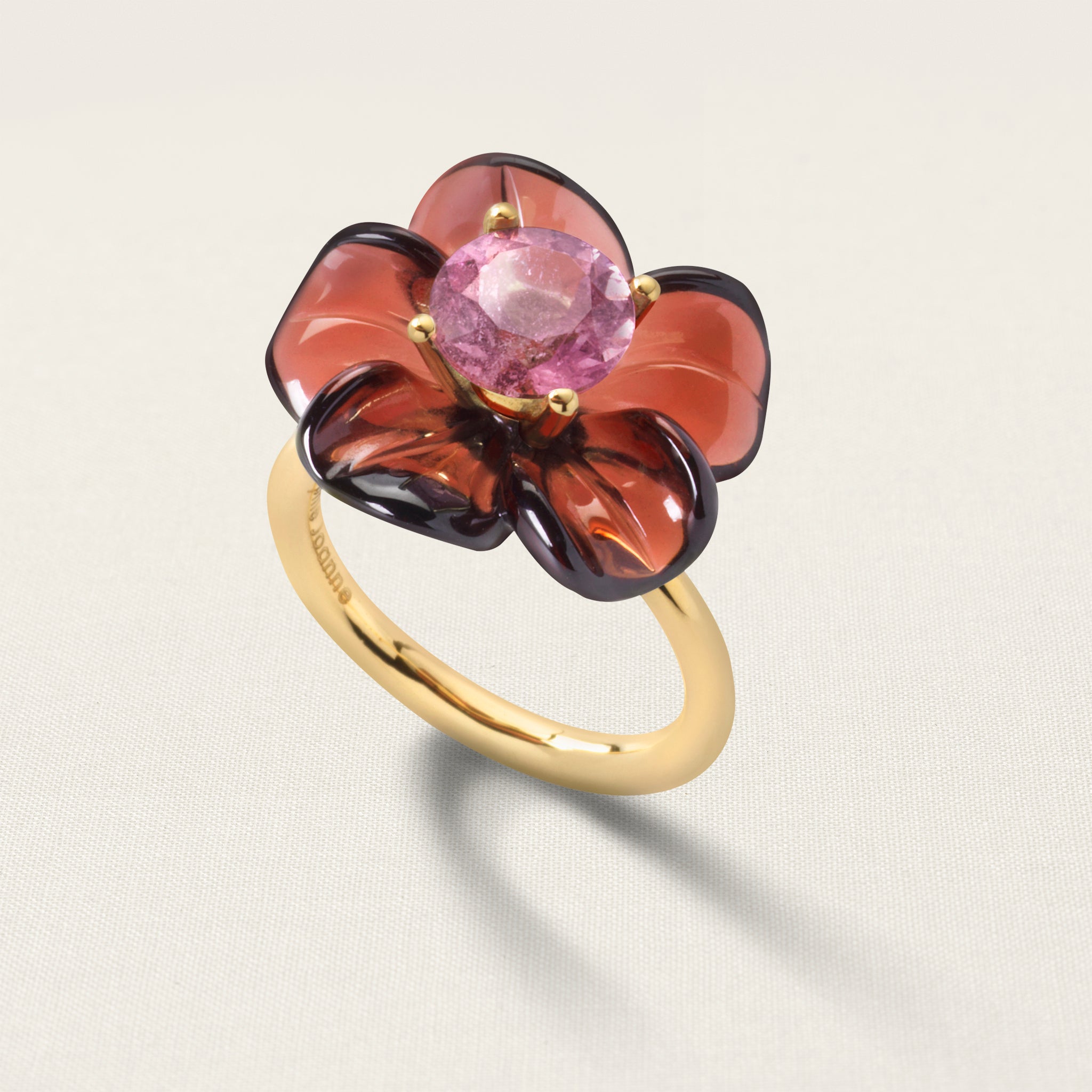 The Flower ring is set with a brilliant-cut tourmaline, which symbolizes joy, emotional healing, and love.