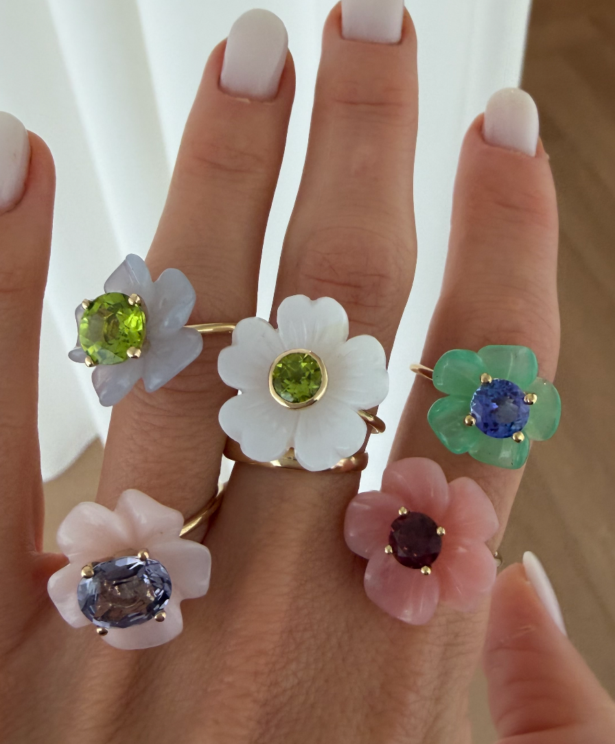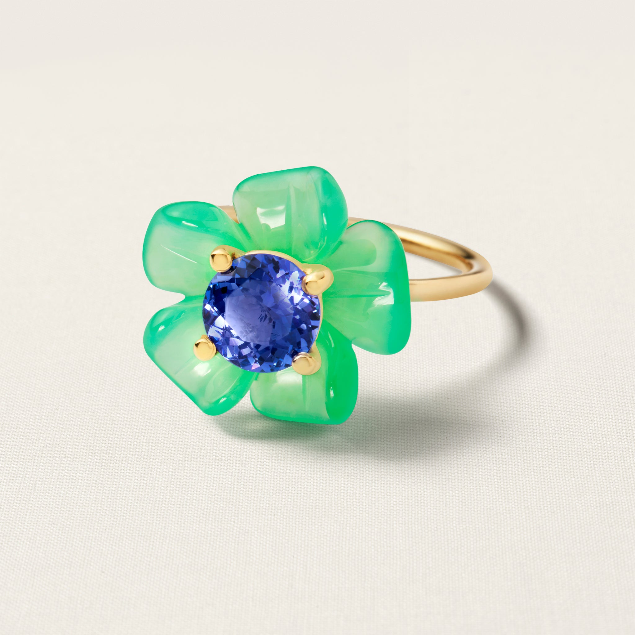 We present to you an entirely new floral design: The Island Flower. Drawing inspiration from Andy Warhol's iconic 1964 flower series, the Island Flower is hand-carved in Germany from high-quality Chrysoprase. The flower ring is set with a brilliant-cut tanzanite is a gemstone known for its transformative qualities, promoting inner serenity, breaking through old patterns, and enhancing psychic abilities and heightened consciousness.