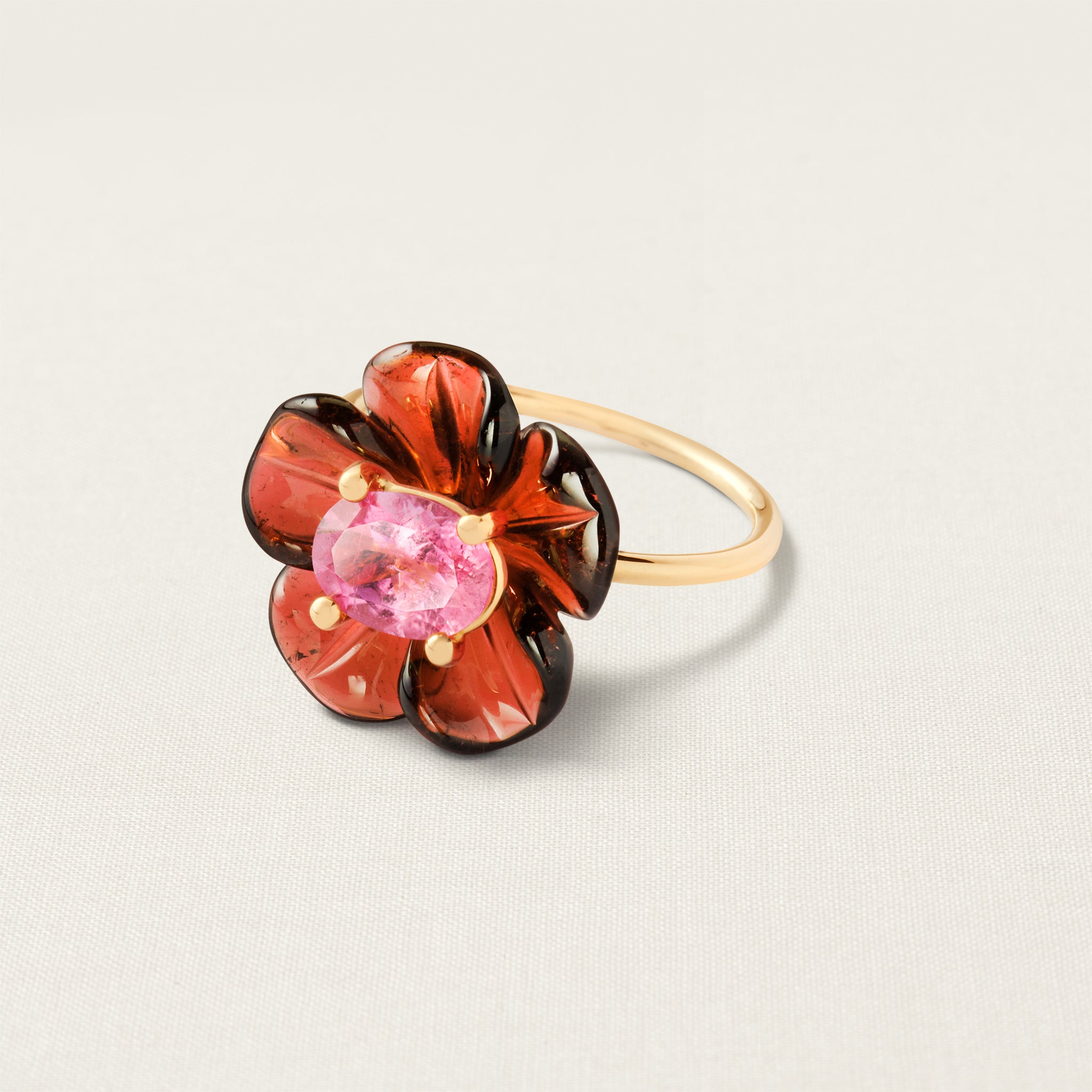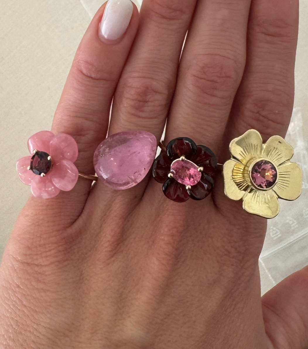 The Flower ring is set with a brilliant-cut tourmaline, which symbolizes joy, emotional healing, and love.
