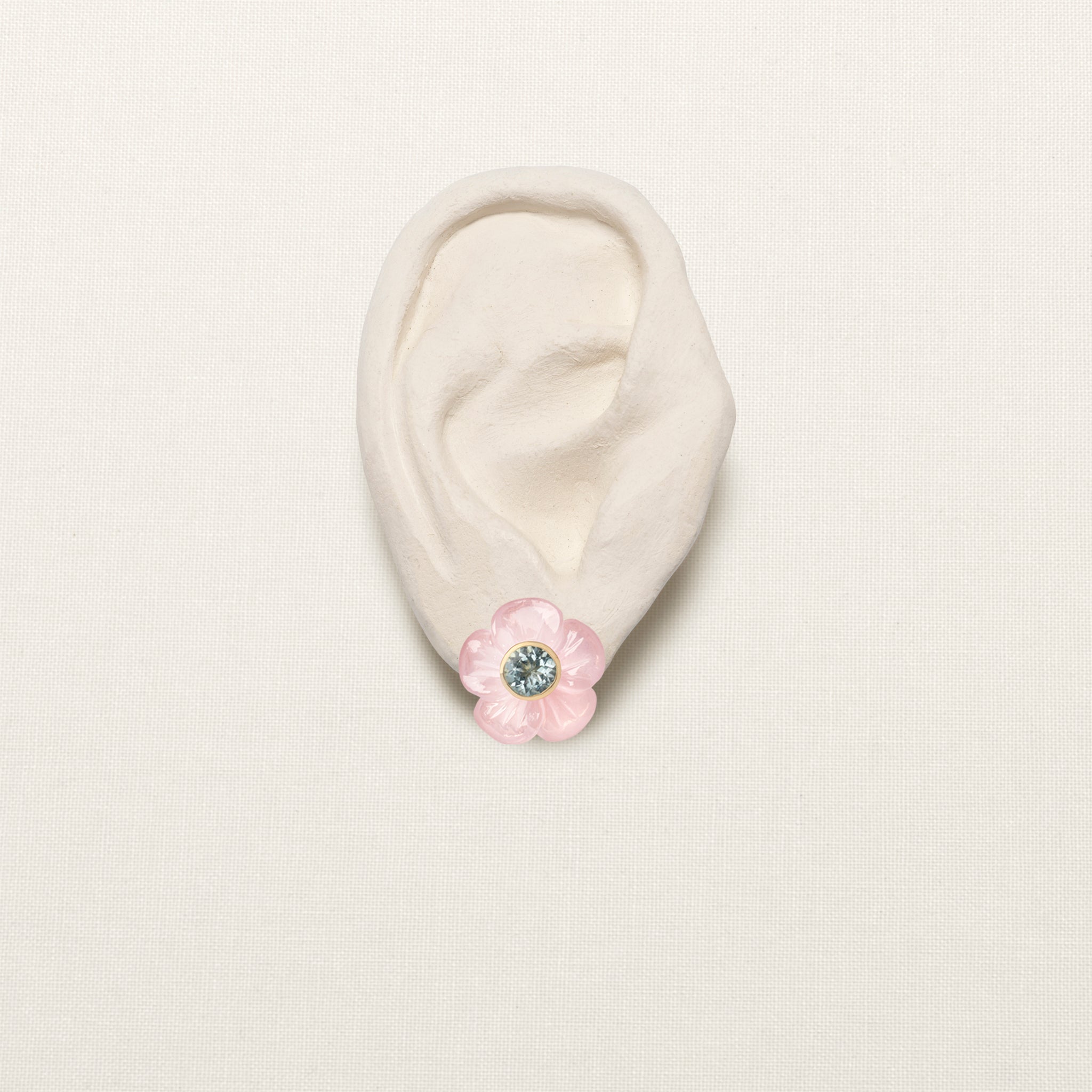 The earring is set with a brilliant-cut aquamarine. Aquamarine helps move towards closure, allowing space for peace and tranquillity.