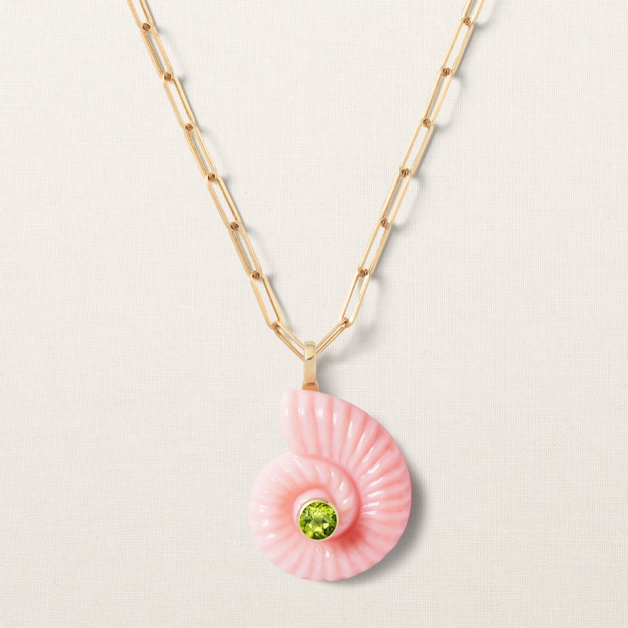 The shell pendant is set with a brilliant-cut peridot, which symbolizes positive energy, joy, and happiness.