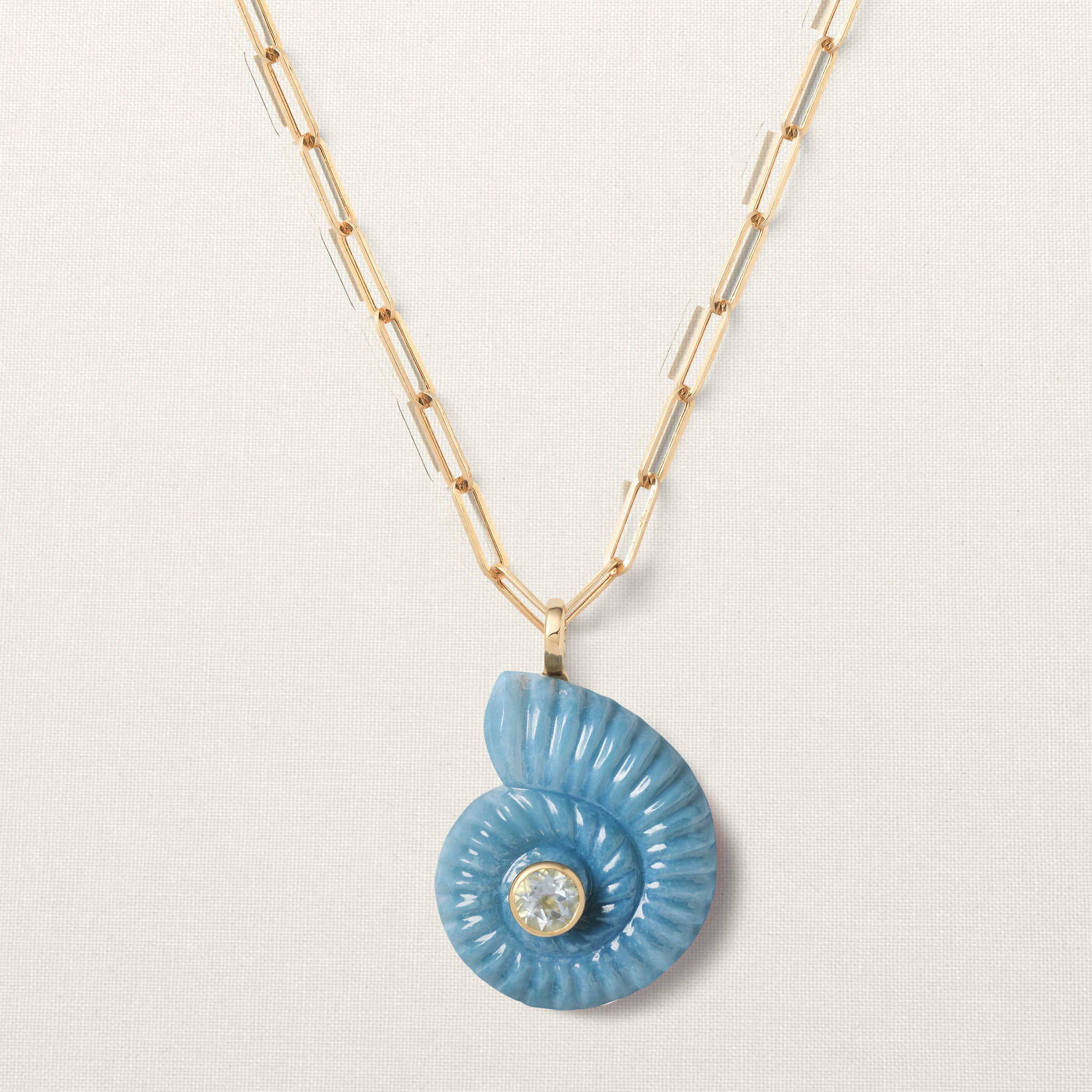 The shell pendant is set with a brilliant-cut aquamarine. Aquamarine helps move towards closure, allowing space for peace and tranquillity.