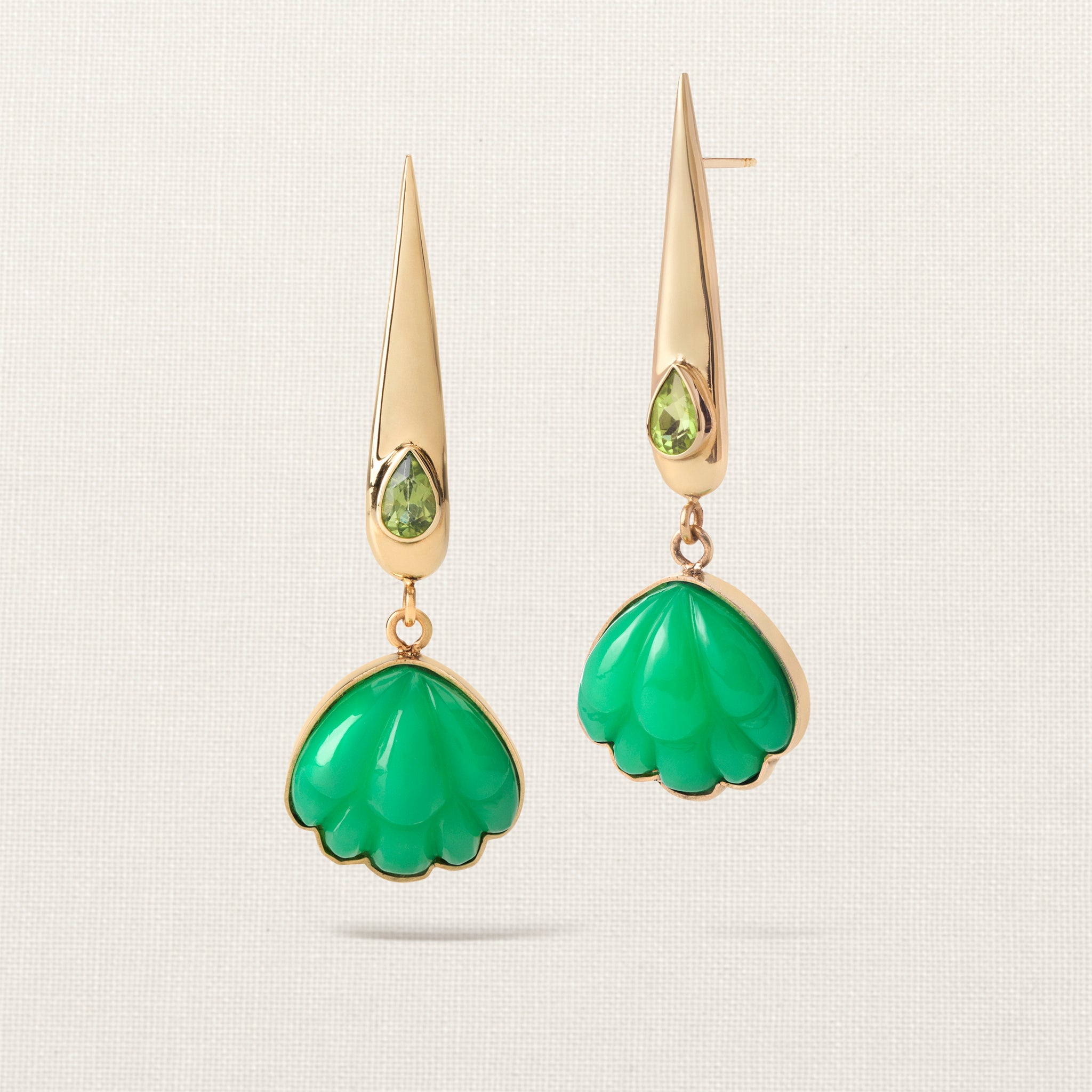 This single earring is hand-cast into a dewdrop shape in gold dangling on the lobe with a lotus-shaped chrysoprase. The chrysoprase lotus is hand-carved by an expert artisan, using an age-old, stone-carving technique. Chrysoprase traditionally symbolizes happiness, enterprise, and prudence.